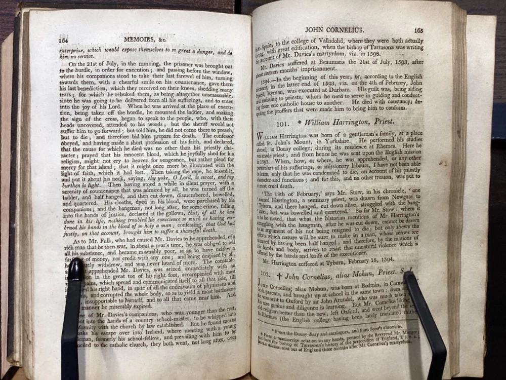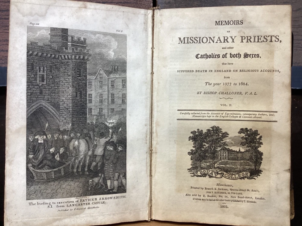 Memoirs of Missionary Priests, and Other Catholics of Both Sexes, That Have Suffered Death in England on Religious Accounts, from the year 1577 to 1684, Volumes 1 and 2, by Bishop Challoner, V.A.L., Mark Wardle, Manchester, 1803, 240pp, 256pp, leather, 5.5 x 8.5", 8vo Fair condition. Wear to front and rear boards. Edges are scuffed and tips bumped with exposed boards. Gilt detailing around edges of both front and rear boards. Front joint is cracked. An instance of worming appears to be present on front board. Spine is cracked and chipped with some exposed binding at tail; illegible. Marginalia on front pastedown and flyleaf. Frontispiece opposite title pages of both volumes. Toning, age-staining, foxing, and tea-staining throughout textblock. Please see photos. Written by Bishop Richard Challoner, these volumes provide a detailed account of the persecution of Catholics in England during the period between 1577 and 1684. Challoner focuses on the stories of Catholic priests and other individuals who were martyred for their faith during this time period. The book includes biographical information about these individuals, as well as descriptions of the events that led to their persecution and eventual death. Challoner also provides a historical context for the persecution of Catholics in England during this time period, including the political and religious factors that contributed to it. FORN-MSB-0224-TUB0006-JC137