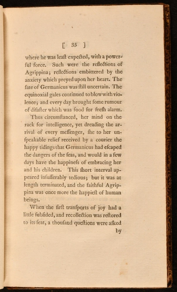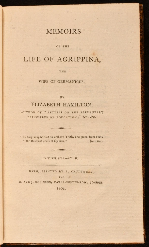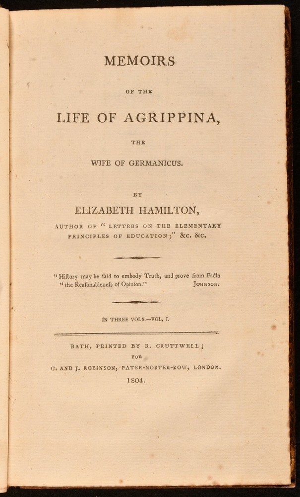 Click here to see our other books! Memoirs of the Life of Agrippina The Wife of Germanicus Elizabeth Hamilton 1804 G. and J. Robinson : London 7.5" by 5" xxxviii, 319; v, 340; viii, 352pp. SUMMARY A complete three volume set of Hamilton's detailed memoirs of Agrippina, the wife of Germanicus Caesar. Early Edition,Leather Binding Overall Condition: Good This book weighs 1.5 KG when packed UK Postage: £ 3.99 US Postage: £ 23.99 EU Postage : £ 18.99 European Postage: £ 19.99 Asia Postage: £ 31.99 Worldwide Postage: £ 32.99 DESCRIPTION Three volumes. Early edition. The life of Agrippina, wife of Germanicus Caesar, who is seen as a major figure in the succession struggles during the latter part of the reign of Tiberius (AD14-37). Volume one follows her life from her infant character to her marriage to Germanicus and their journey to Germany. Volume two continues from the birth of Agrippina the younger through to Piso's suicide. Volume three contains information on the affairs at Rome to the death of Agrippina. Written by Elizabeth Hamilton, a Scottish essayist, poet, satirist, and novelist who entered into the French-revolutionary era controversy in Britain over the education and rights of women. CONDITION Bound in full calf. Externally, sound with rubbing and bumping to the extremities. The odd mark to the boards. Volume one front board has detached. Joints tender but still reasonably firm. Minor loss to the spines of volumes two and three. Internally, firmly bound. Pages are very bright and clean with the odd spot. Previous owner's bookplate to front pastedown. Overall Condition: Good GLOSSARY OF TERMS Overall Condition (Dustwrapper condition rating is shown after that for the book itself, where a dustwrapper is present) Fine - Very well preserved copy showing very little wear Very Good Indeed - Only one or two minor faults, really a very attractive copy Very Good - Quite a wide term meaning no major faults but probably several smaller ones often expected given the age of the book, but still a respectable copy Good - Meaning not very good. Some more serious faults as will be described in the condition report under 'condition' Good Only - Meaning one or more faults that could really do with repair Fair - As with good only above but with other faults leaving a compromised copy even after repair Poor - Really bad and possibly seriously incomplete. We only sell books in this condition where their rarity or value makes them attractive none the less. Major defects will be described. GUARANTEE We offer a full money back guarantee on our descriptions. Please ask for details and conditions. We prefer PAYPAL. If you pay via PAYPAL we will post the item off the same or the next working day with the postage you have selected. Please note we cannot accept USD cheques