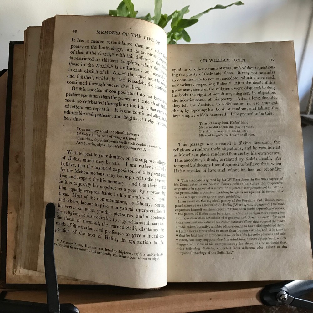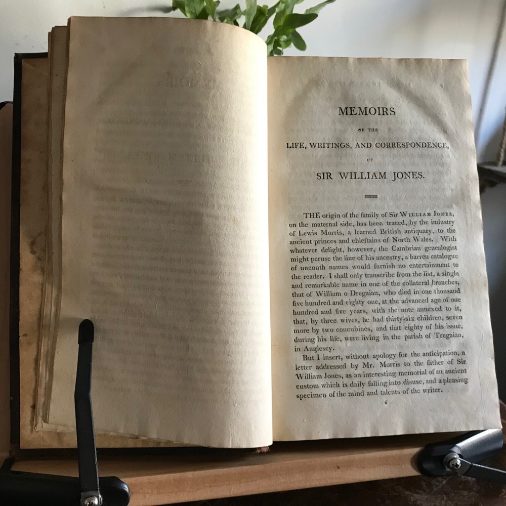 Memoirs of The Life, Writings and Correspondence of Sir William Jones, Lord Teignmouth, From the Classic Press, William Poyntell & Co., Philadelphia, 1805, frontispiece, letter press engraving, 419 pp, 102 pp, full leather, 9 x 6”, 8vo. In good condition. Leather nicely preserved, soft and rich in color. Light wear to extremities. Minimal creasing to spine. End papers toned with moderate foxing. Old hand ownership on fly leaf dated 1805. Light staining and toning to frontispiece. Interior has mild age toning. Free of known markings. Scattered foxing throughout. Binding tight and intact. A solid copy! Please see photos. First American edition. Jones was a judge of the high court at Calcutta from 1783 until his death in 1794, and a respected authority on Indian languages, philosophy and literature. He founded the Asiatic Society of Bengal in 1784, and was the first to discover the relationship between the Sanskrit, Gothic, Greek and Latin languages, and "His clear understanding of the basic principles of scientific linguistics provided the foundation on which Rask, Bopp, and Grimm built the imposing structure of comparative Indo- European studies" COLH1805ABGK