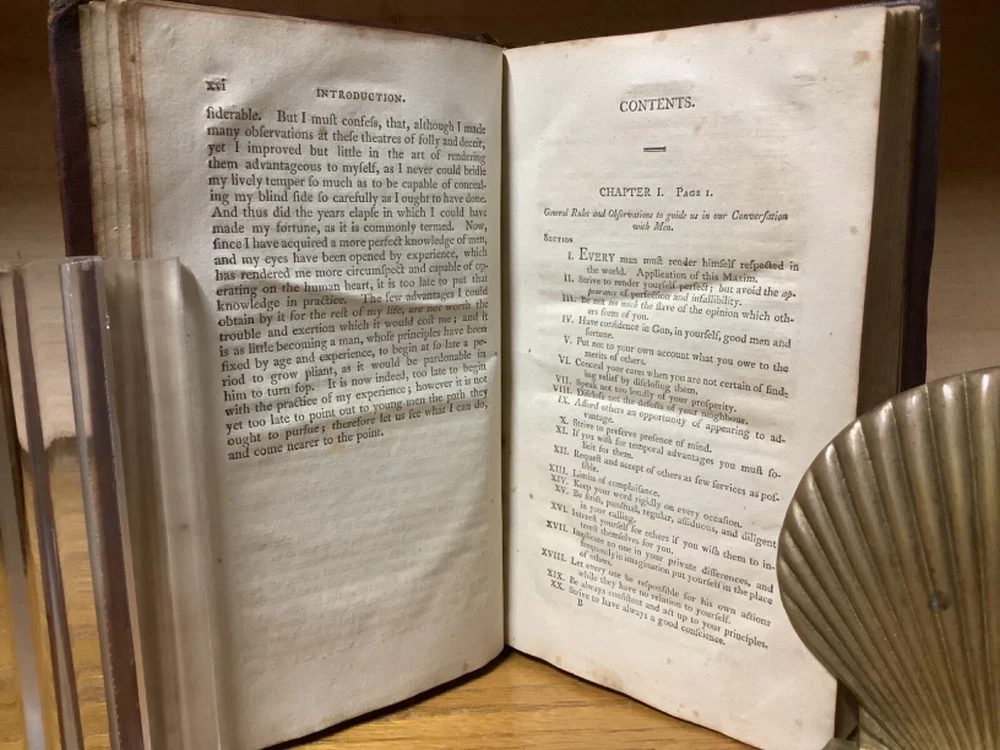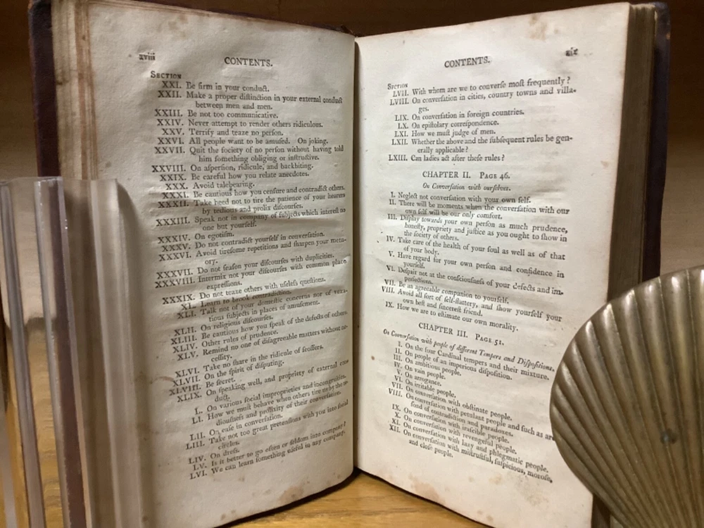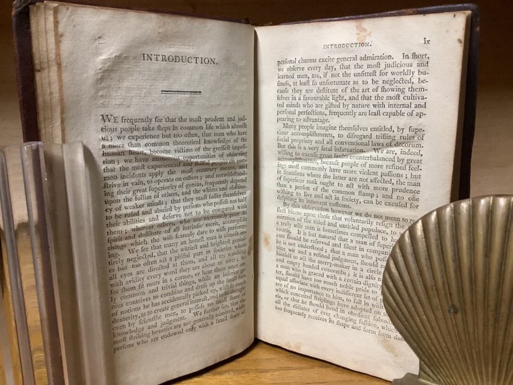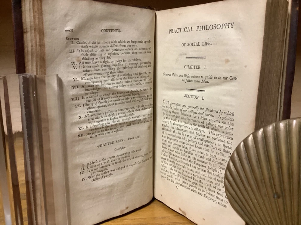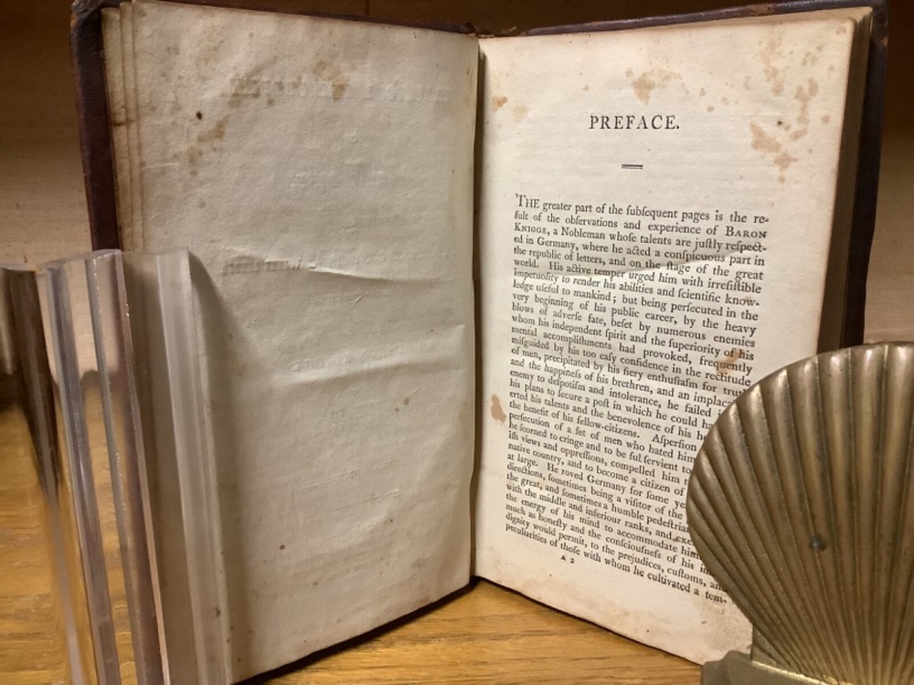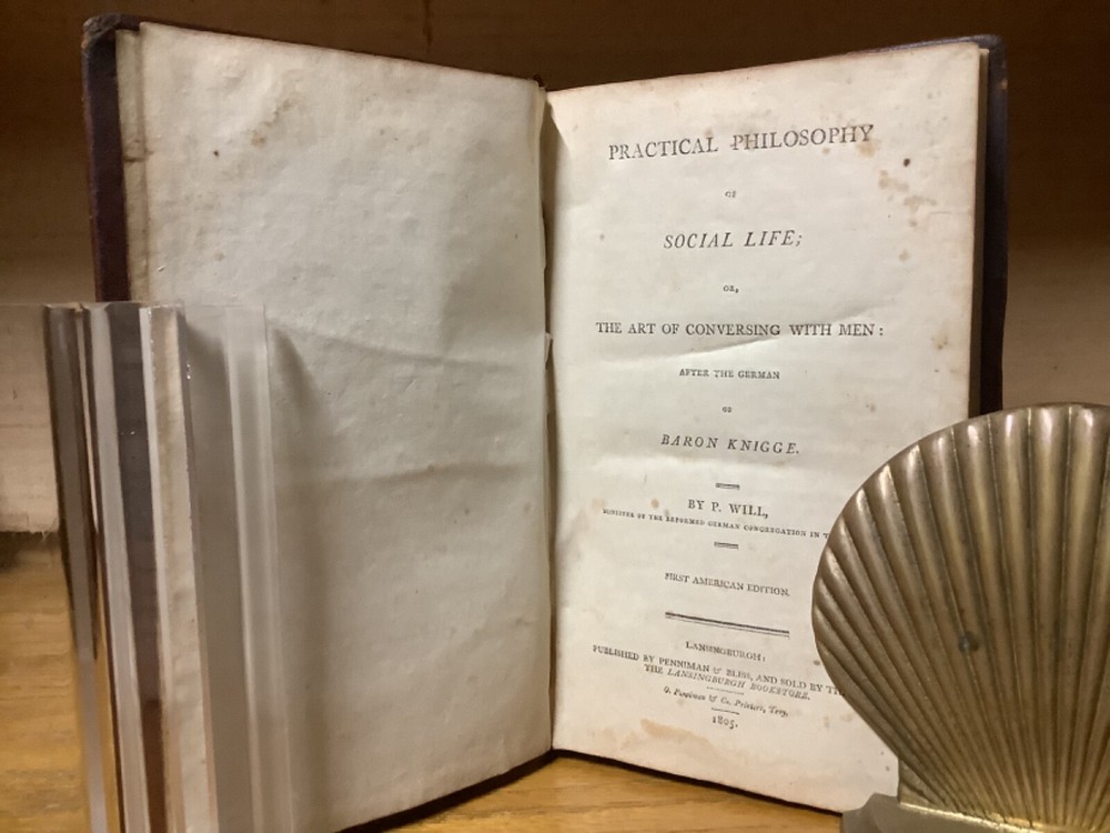 Practical Philosophy of Social Life; Or, The Art of Conversing with Men: After the German of Baron Knigge. By P. Will and printed in Lansingburg, Troy, New York by Penniman and Bliss. 1805, 1st American edition, 368 pp, 8.5” x 5.5”, 8vo, full leather hardcover. In good condition, with minor rubbing and wear to boards and spine. Minor hinge wear at front and back of book. Text block remains in good condition and bound well. Minor marginalia towards front of book. Light instances of staining. General age-related toning to pages, along with periodic foxing and wear. Please see photographs and ask any questions prior to purchasing. A rather scarce philosophical piece, having been based on the writings of Adolph Freiherr Knigge (1752-1796), who is best known for helping to found the Illuminati and for contributions to Freemasonry. COLH1805CJKJ-1023-aj0537
