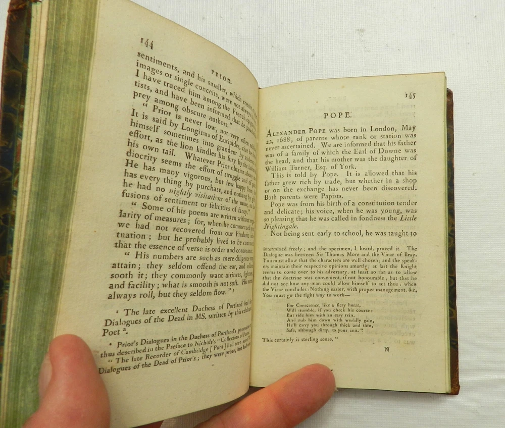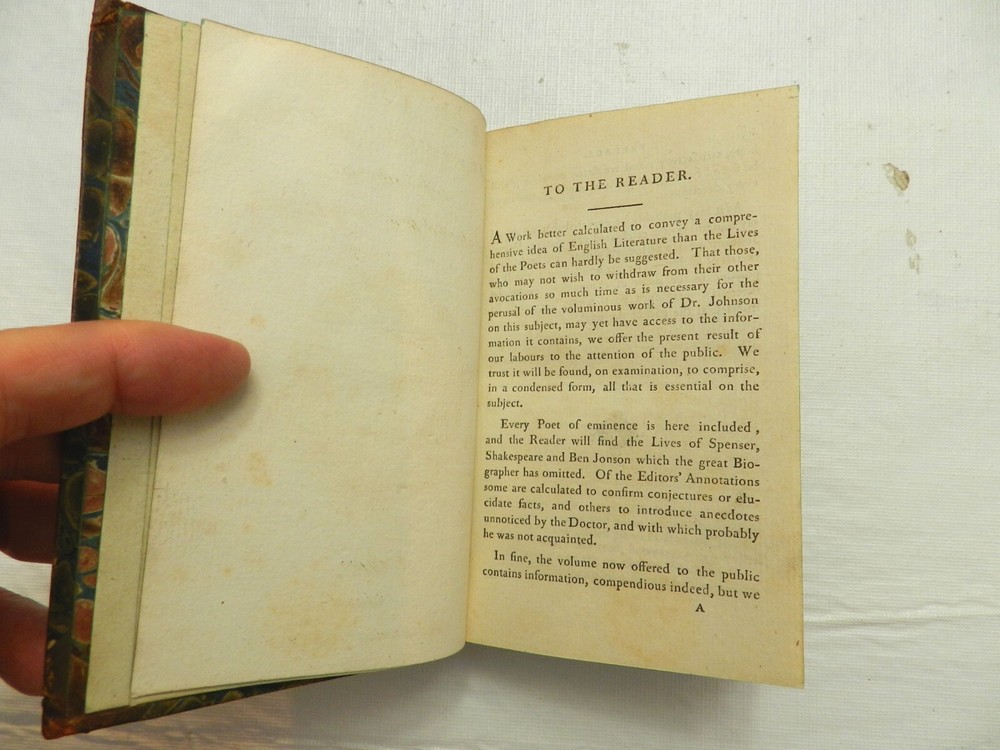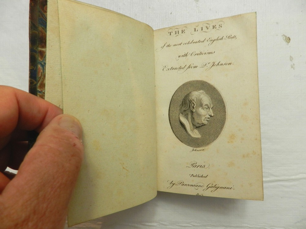 I'm unable to learn a lot about this 200+ year-old book from the internet. It is part of a uniform set - I have another from this set which I'll be listing separately. I am unable to ascertain the author, the publisher is Parsons and Galignanni, and it was published in 1805. Google AI indicates that the publishers compiled biographical and critical essays on prominent English poets, primarily drawing from the renowned literary critic Samuel Johnson's work "Lives of the Most Eminent English Poets." In essence, it appears to be a condensation or, highlights from, Johnson's work. This book is in GOOD CONDITION. It has a leather spine and leather corners, with a paste-on label. The front board appears partially detached from the spine on the top half of the front board. Marble endpapers, green page edges, 312 clean and solidly bound pages. B61