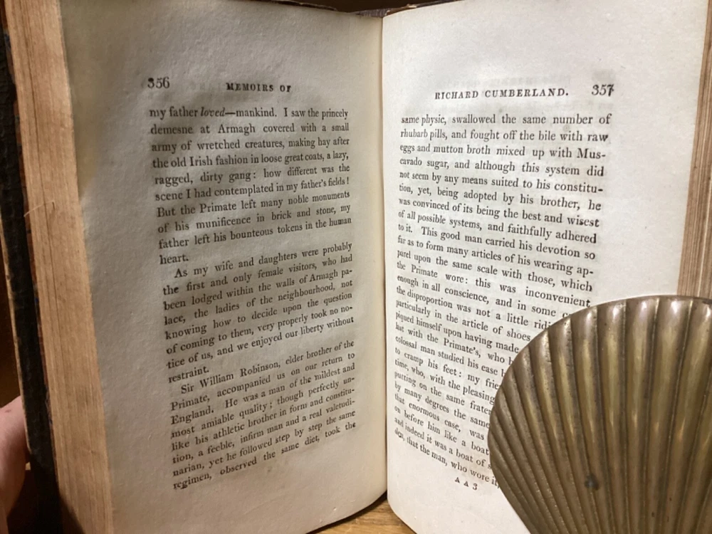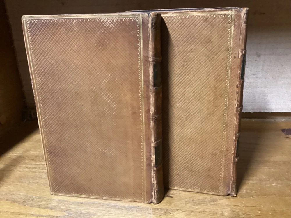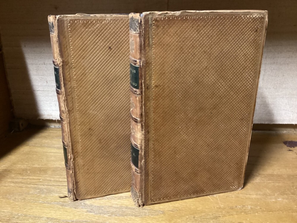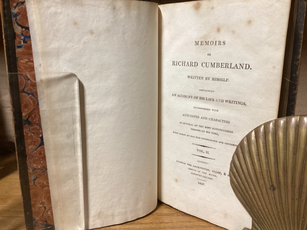 Memoirs of Richard Cumberland, Written by Himself. Containing an Account of His Life and Writings. Printed in London by Lackington, Allen, and Co. 1807. In two volumes. 499 and 432 pp. 8.5” x 5.5”. 8vo. Hardcover full leather. In fair condition, with scuffing and wear to exterior. Some bumping along edges of boards and corners. Front board of Volume I cracked and shaky. Text blocks remain in good condition. Bookplates affixed to front pastedown of each volume. General age-related toning to pages, along with periodic foxing and wear. Light markings. Frontispiece portrait adjacent to title page of Volume I. Please see photographs and ask any questions prior to purchasing. A scarce piece on the life, travels, and career of Richard Cumberland (1731/2 - 1811), an English dramatist and civil servant. The author of The West Indian , he was also secretly sent to Spain during the American War of Independence in order to attempt a peace agreement between London and Madrid. Bookplates of George de Linge Gregory, High Sheriff of Nottinghamshire, and the owner of Harlaxton Manor, a county house in Harlaxton, Lincolnshire. COLR1805ABDX