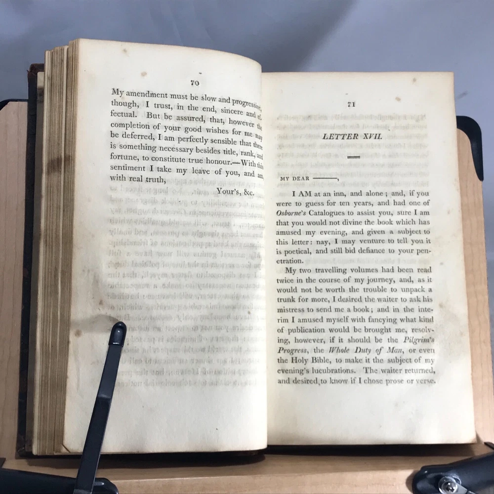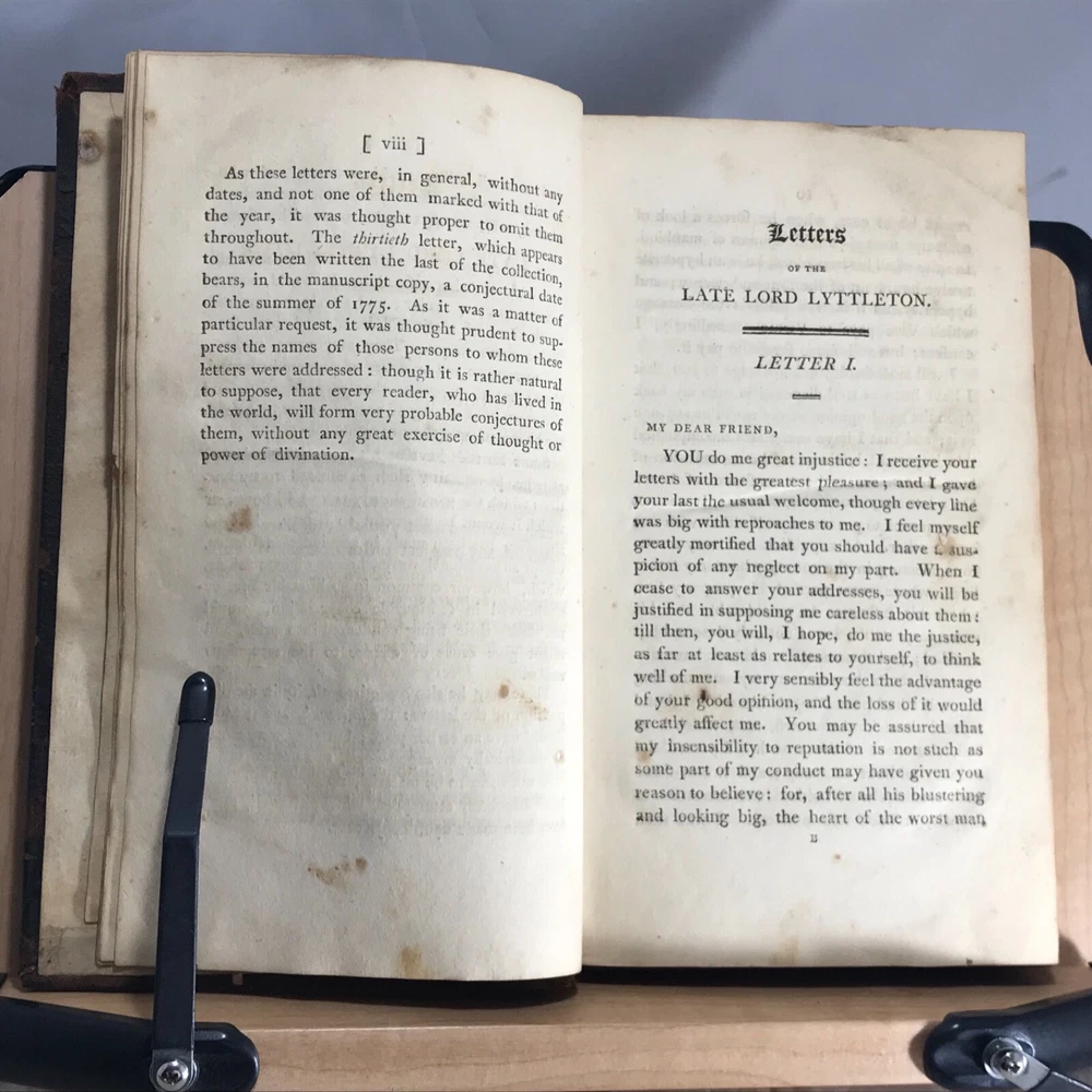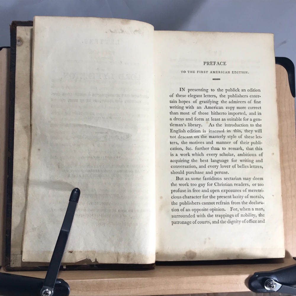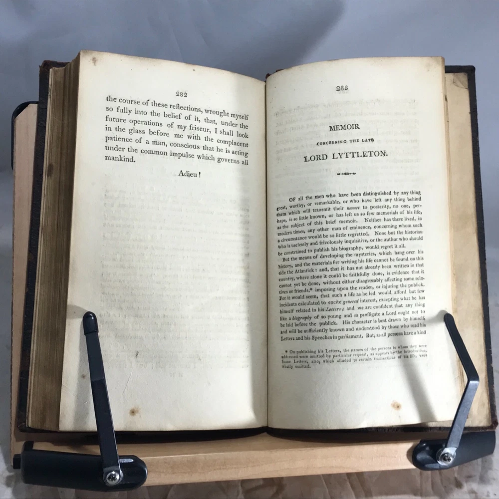 Letters of the Late Lord Lyttleton, only Sonm of the Venerable George, Lord Lyttleton, and Chief Justice in Eyre, Complete in One Volume, The First American Edition, To which is Now Added, a Memoir Concerning the Author, Including an Account of some Extraordinary Circumstances Attending His Death, Printed and Sold by Wright, Goodenow & Stockwell, Troy, N.Y., 1807, 296pp, 8.75 x 5.25”, full leather, 12mo. In good condition. Boards show wear especially along edges, corners and joints.. exhibits red rot, but not flaking. Hinges lightly cracked. Marbled end papers somewhat soiled, faded. 1980 dated previous owner’s name on second fly leaf. Previous owner’s name in old hand on front title page. Text block lightly toned with occasional staining throughout. Free of marginalia. Binding remains tight and intact. Please see photos. Rare Troy N.Y. Imprint with interesting early American binding. Letter 58 is a wonderful discussion on hair styles, beards and wigs in history and religion. COLH1807ABFA-variant