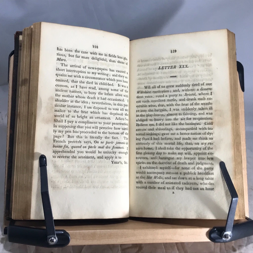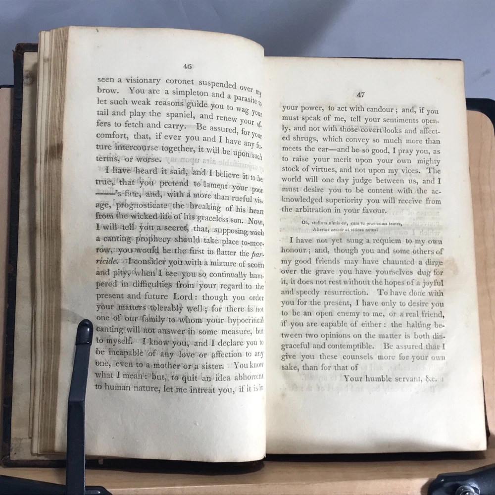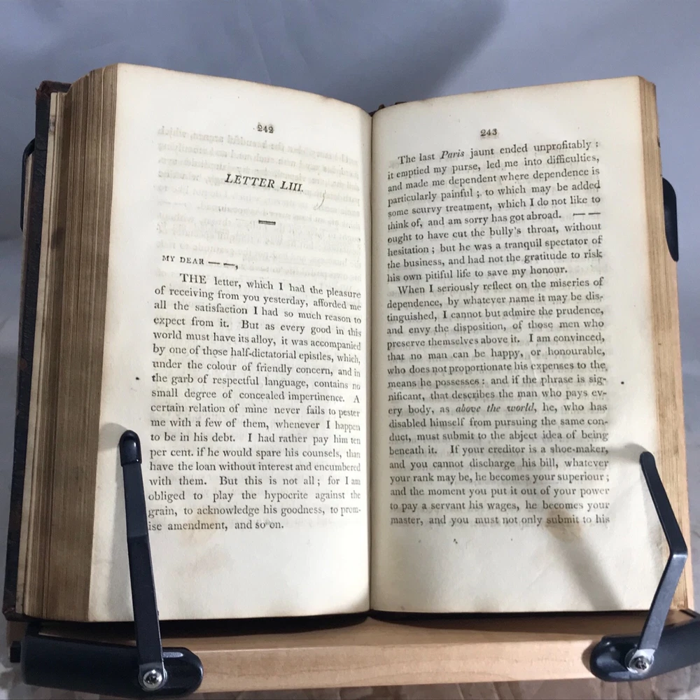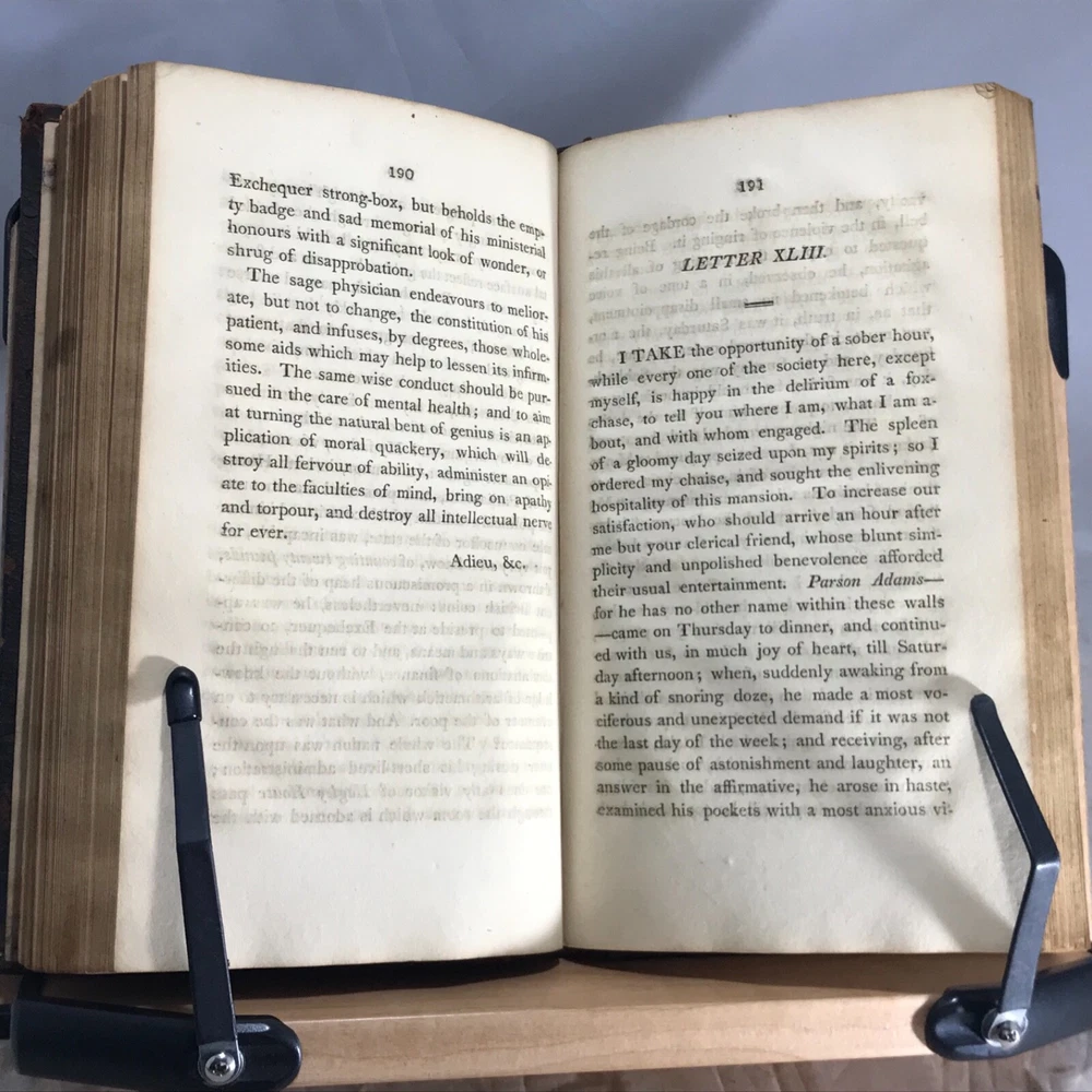 Letters of the Late Lord Lyttleton, only Sonm of the Venerable George, Lord Lyttleton, and Chief Justice in Eyre, Complete in One Volume, The First American Edition, To which is Now Added, a Memoir Concerning the Author, Including an Account of some Extraordinary Circumstances Attending His Death, Printed and Sold by Wright, Goodenow & Stockwell, Troy, N.Y., 1807, 296pp, 8.75 x 5.25”, full leather, 12mo. In good condition. Boards show wear especially along edges, corners and joints.. exhibits red rot, but not flaking. Hinges lightly cracked. Marbled end papers somewhat soiled, faded. 1980 dated previous owner’s name on second fly leaf. Previous owner’s name in old hand on front title page. Text block lightly toned with occasional staining throughout. Free of marginalia. Binding remains tight and intact. Please see photos. Rare Troy N.Y. Imprint with interesting early American binding. Letter 58 is a wonderful discussion on hair styles, beards and wigs in history and religion. COLH1807ABFA-variant