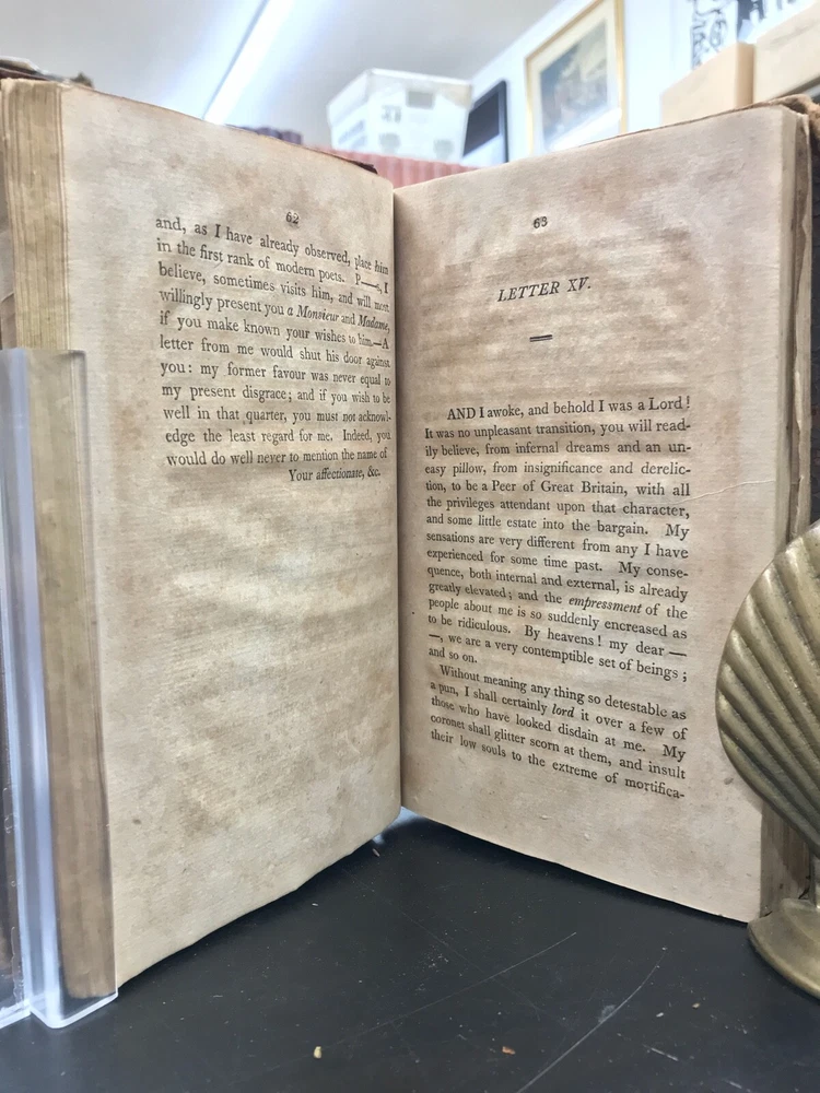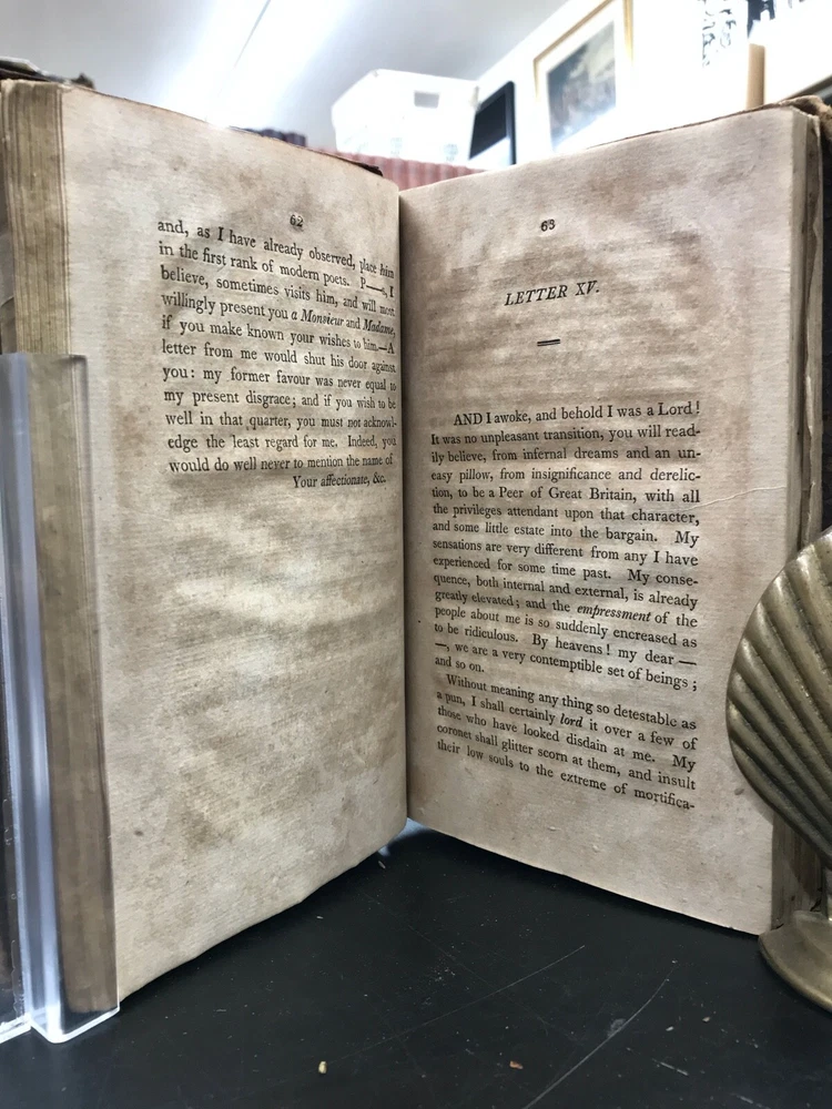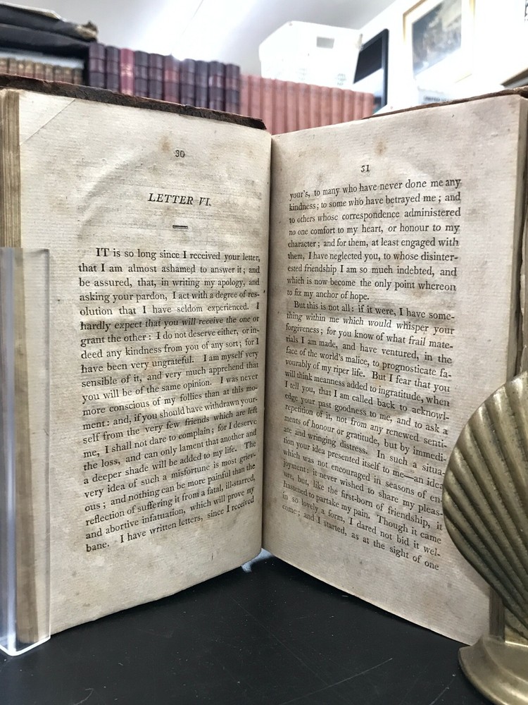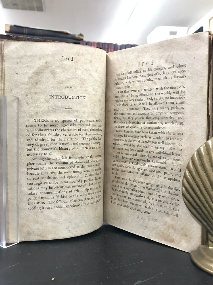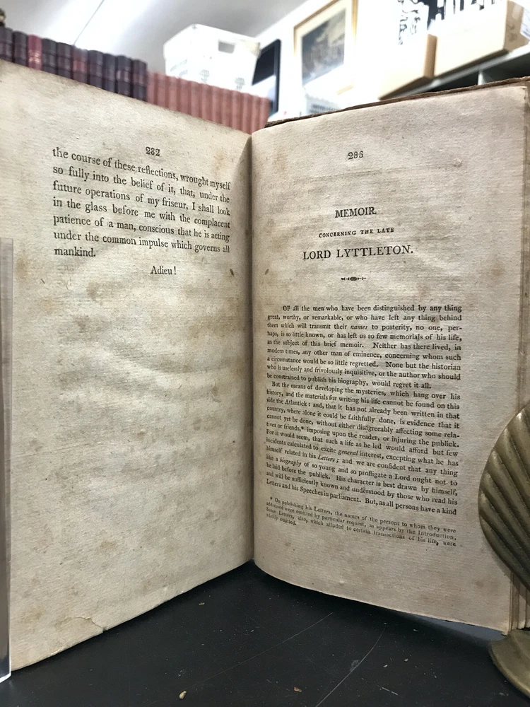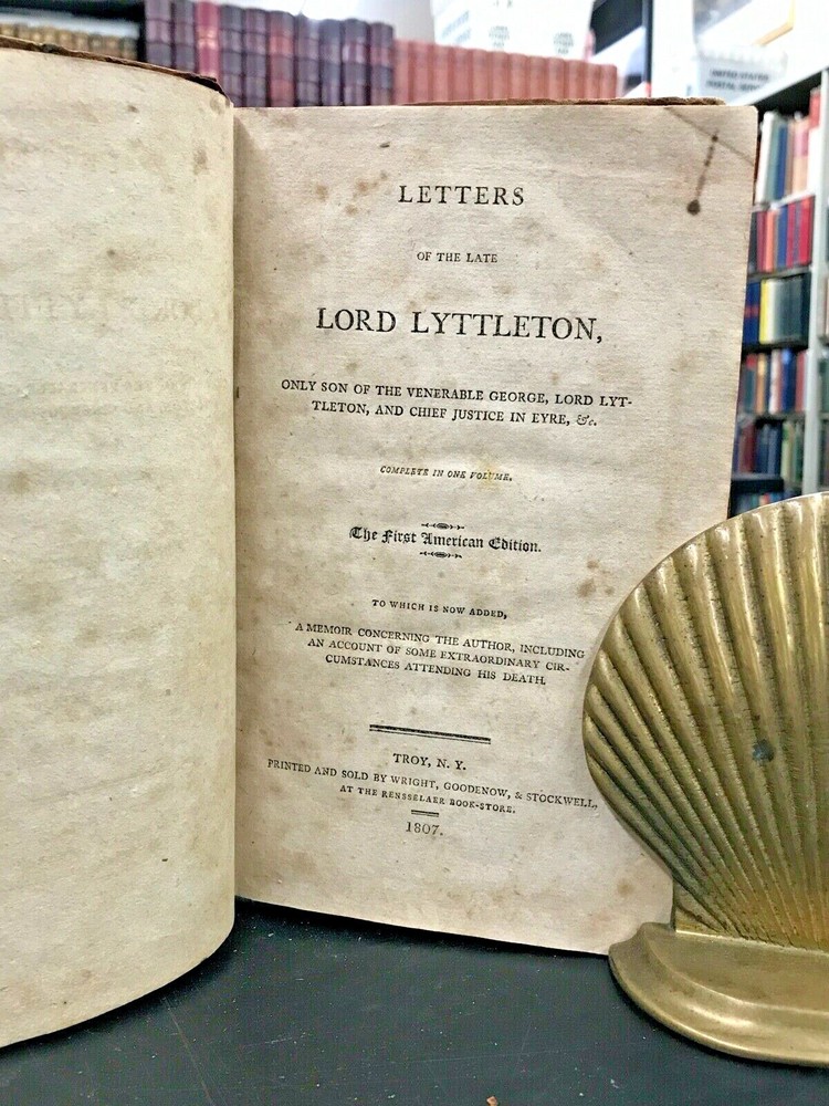 Letters of the Late Lord Lyttleton, Only Son of the Venerable George, Lord Lyttlwton, and Chief Justice in Eyre, etc. To Which is Now Added, a Memoir Concerning the Author, Including an Account of Some Extraordinary Circumstances Attending his Death. Published by Wright, Goodenow, & Stockwell in Troy, NY. 1807, 296 pp, 8.5 x 5.5", leather binding. In fair condition with chipping and wear to leather cover boards. Spine text lost. Hinges intact but loose. Text binding intact. Manuscript ownership in pencil. General age-related toning and foxing to pages. Please see photographs and ask any questions prior to purchasing. A scarce collection of the letters of Thomas Lyttleton, 2nd Baron and 6th Baronet Lyttleton (1744-1779) accompanied by a colorful biographical account. Known as the "bad" or "wicked" Lord Lyttleton, Thomas was estranged from his father George (1709-1773), the "worthy" and "illustrious" 1st Baron. His letters are full of character and indicate his reputation for "profligacy." Dying without issue, the family title had to be recreated in order for the barony to continue with Thomas's uncle and George's brother, William, who became the 1st Baron and 7th Baronet Lyttleton. FORN-ABE-MSB-0522-Shelf-632-am284
