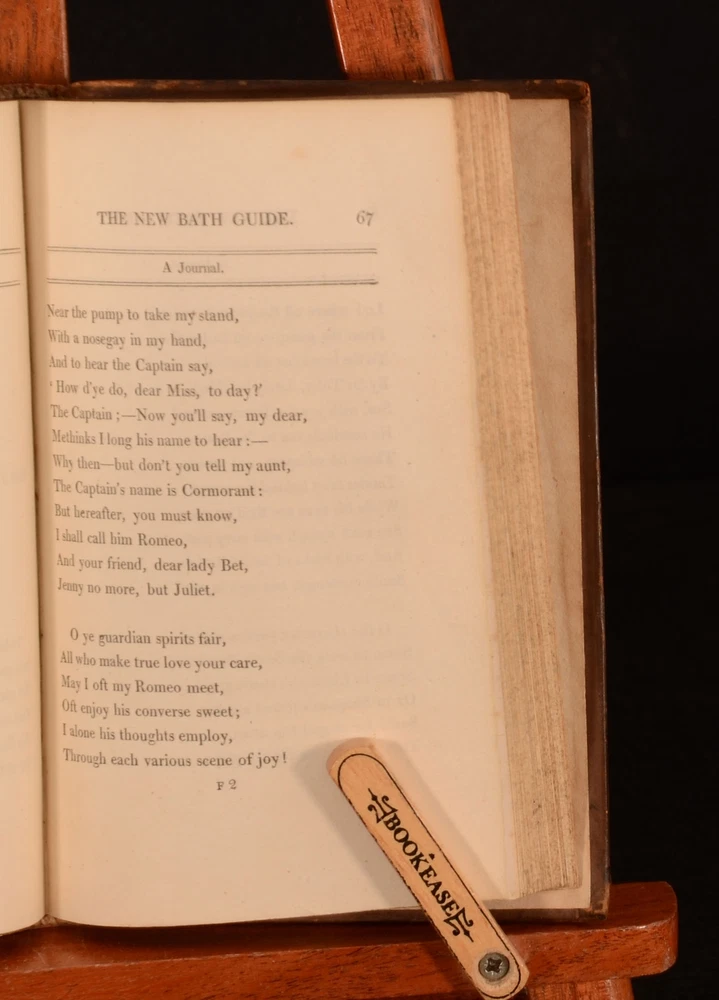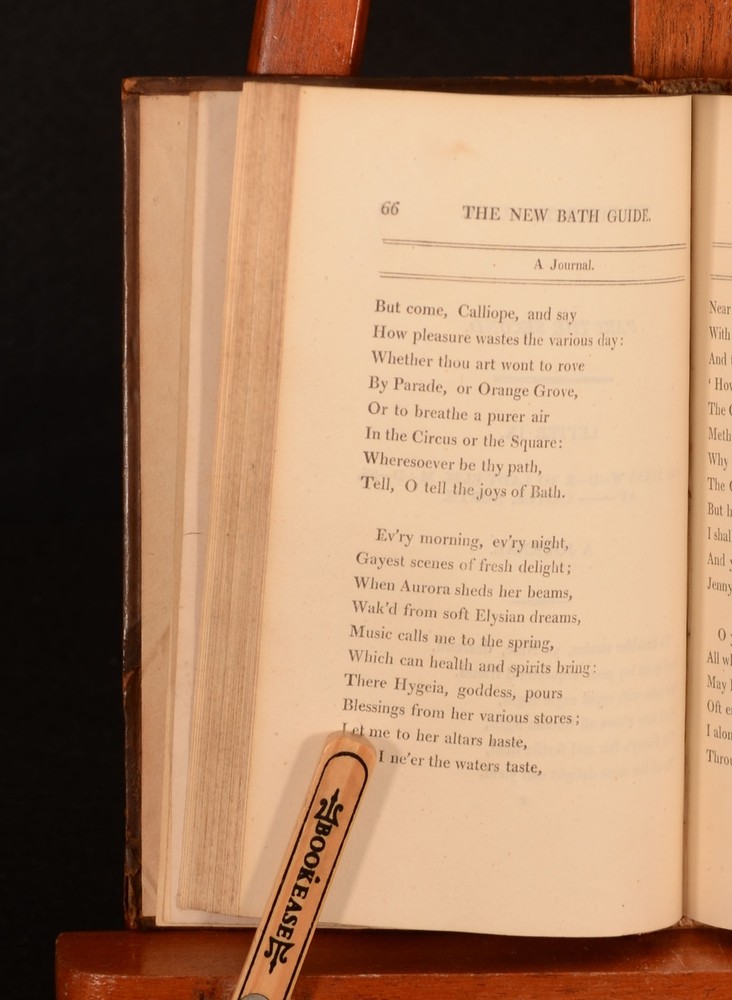 Click here to see our other books! The New Bath Guide: or, Memories of the B-N-R-D Family. In a Series of Poetical Epistles [Christopher Anstey] 1807 Vernor, Hood, and Sharpe : London 6.5" by 4" viii, 155pp, [4pp] SUMMARY An illustrated copy of Christopher Anstey's popular satirical poem on the life of Bath in the eighteenth century. Illustrated,Leather Binding Overall Condition: Very Good Indeed This book weighs 0.5 KG when packed UK Postage: £ 3.99 US Postage: £ 15.99 EU Postage : £ 13.99 European Postage: £ 14.99 Asia Postage: £ 18.99 Worldwide Postage: £ 19.99 DESCRIPTION A new edition of this work. A collection of fifteen poetical letters showing a satirical view of the fashionable live in Bath in the eighteenth century, following the adventures of three naive children of a Northern squire whilst on a visit to the city. This was Christopher Anstey's most popular work, and he never quite recaptured the success of this work, which was constantly in print during his lifetime. Illustrated with a frontispiece, and eight plates. With four pages of publisher's adverts to the rear. CONDITION In a full calf binding. Externally, smart. Some light rubbing and marks to the boards and spine. Rear hinge is starting but firm. Bookplate to the front pastedown. Internally, firmly bound. Pages are bright and clean. Overall Condition: Very Good Indeed GLOSSARY OF TERMS Overall Condition (Dustwrapper condition rating is shown after that for the book itself, where a dustwrapper is present) Fine - Very well preserved copy showing very little wear Very Good Indeed - Only one or two minor faults, really a very attractive copy Very Good - Quite a wide term meaning no major faults but probably several smaller ones often expected given the age of the book, but still a respectable copy Good - Meaning not very good. Some more serious faults as will be described in the condition report under 'condition' Good Only - Meaning one or more faults that could really do with repair Fair - As with good only above but with other faults leaving a compromised copy even after repair Poor - Really bad and possibly seriously incomplete. We only sell books in this condition where their rarity or value makes them attractive none the less. Major defects will be described. GUARANTEE We offer a full money back guarantee on our descriptions. Please ask for details and conditions. We prefer PAYPAL. If you pay via PAYPAL we will post the item off the same or the next working day with the postage you have selected. Please note we cannot accept USD cheques