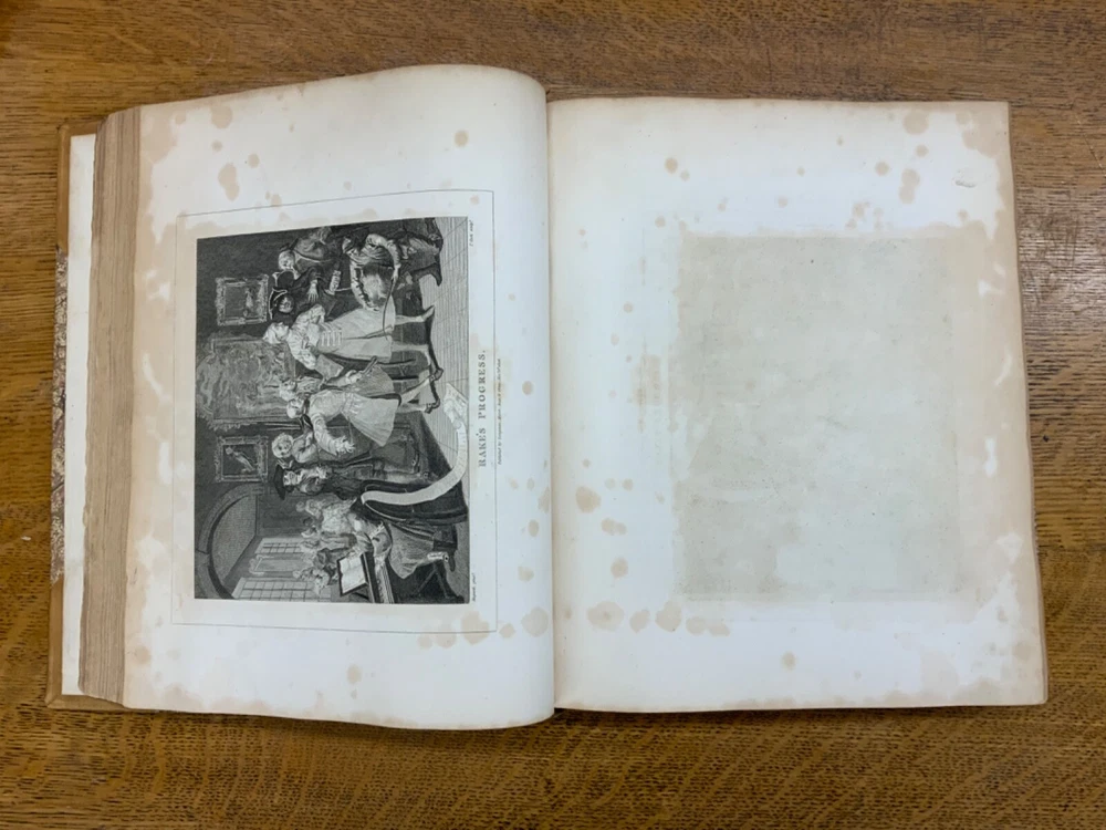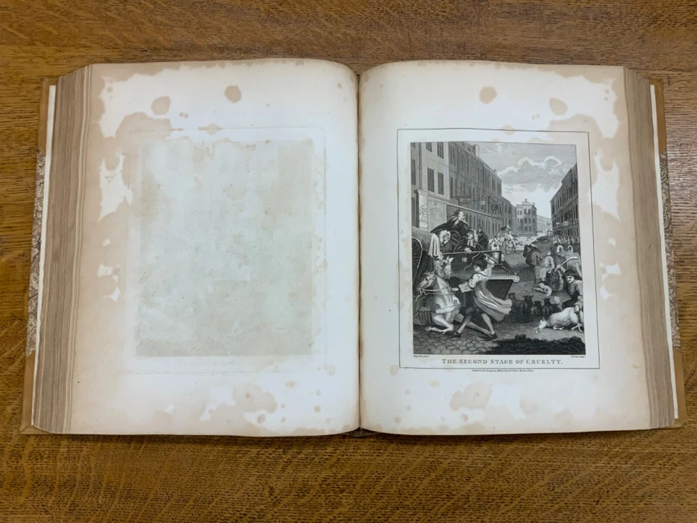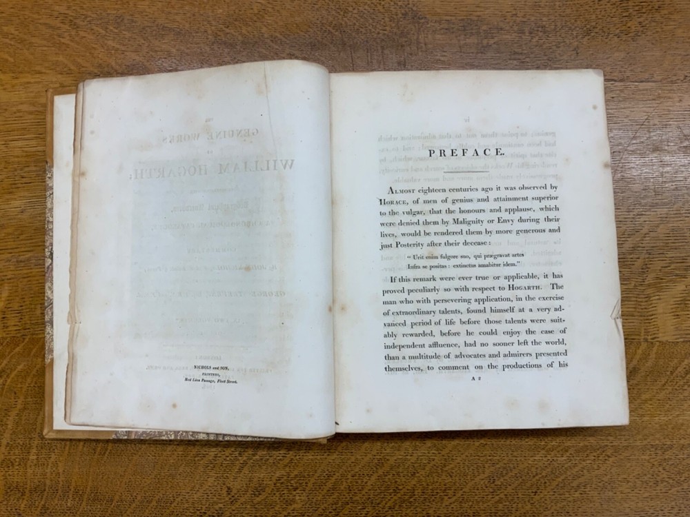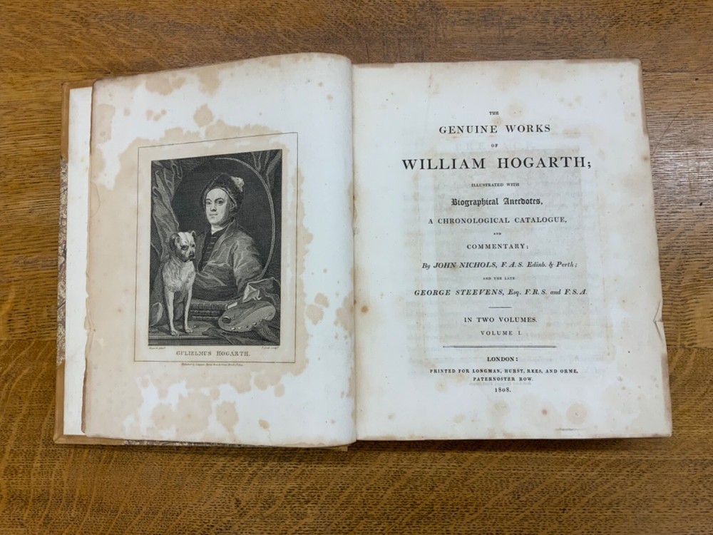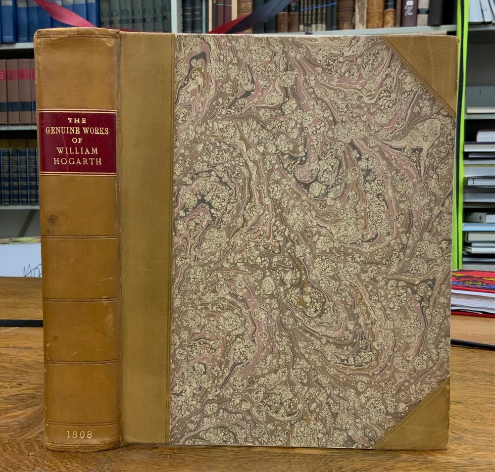 The Genuine Works of William Hogarth; Illustrated with Biographical Anecdotes, A Chronological Catalogue, and Commentary; By John Nichols, F.A.S. Edinb. & Perth; and the Late George Stevens, Esq. F.R.S. and F.S.A. In Two Volumes, Vol. I ONLY, London: Printed for Longman, Hurst, Rees, and Orme, 1808, half-leather marbled boards, 524 pp, 10.5 x 8.75", imperial octavo. In good condition. Typical wear to extremities. Edges of boards are scuffed and leather corners are worn. Gilt lettering on spine bright and clean. Foxing throughout text-block, but especially to plates. All plates present, no missing pages. Some instances of chipped pages and finger-soiling. No known previous ownership or marginalia. Binding tight and intact. Please see photos. William Hogarth (1697-1764) was an English painter, engraver, pictorial satirist, editorial cartoonist, and occasional writer on art. His work ranges from realistic portraiture to comic-like series of pictures called "modern moral subjects". He is perhaps best known for his series "A Harlot's Progress" (Included in this edition), "Marriage A-la-Mode" (Included in this edition), and "A Rake's Progress". This is only Volume One of a two volume set of Hogarth's complete works. Finely bound, presents very well. An excellent gift. FORN-MSB-0823-0739-HK474