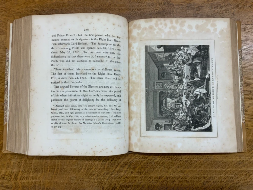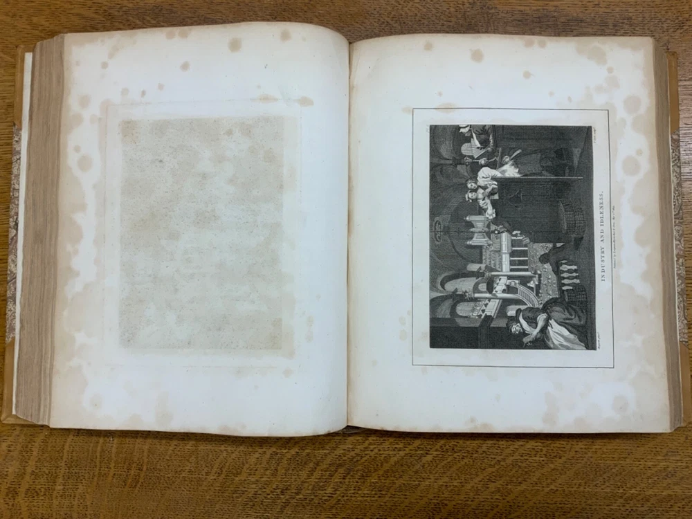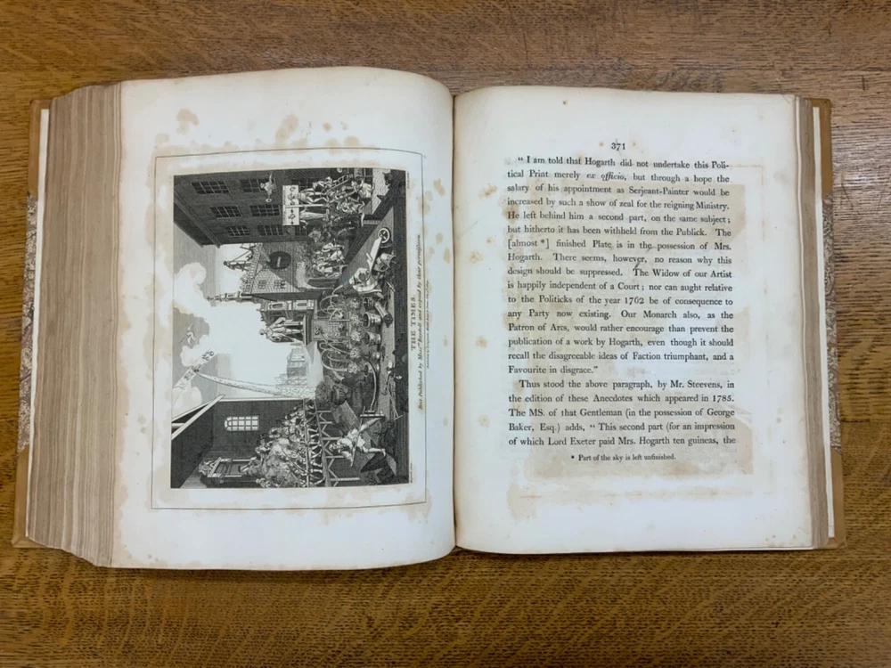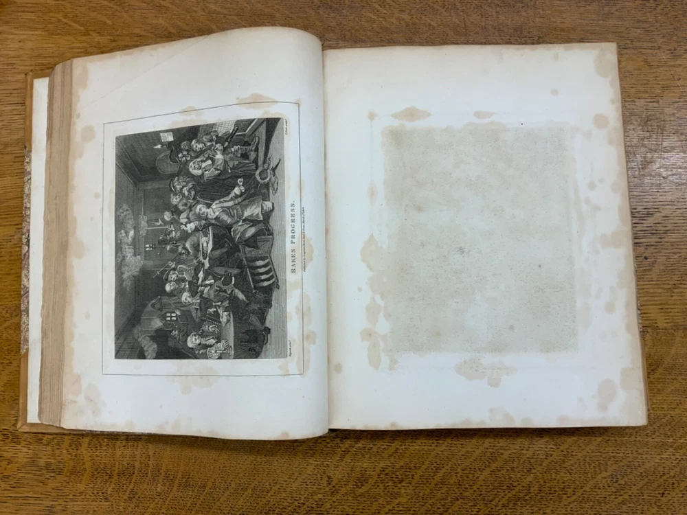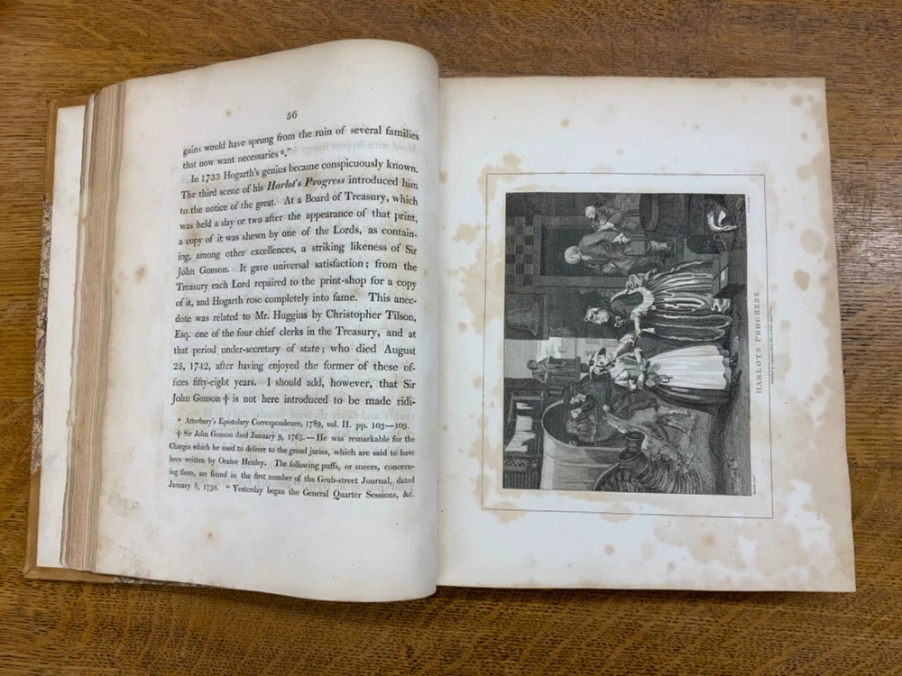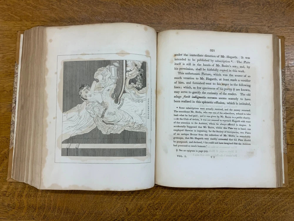 The Genuine Works of William Hogarth; Illustrated with Biographical Anecdotes, A Chronological Catalogue, and Commentary; By John Nichols, F.A.S. Edinb. & Perth; and the Late George Stevens, Esq. F.R.S. and F.S.A. In Two Volumes, Vol. I ONLY, London: Printed for Longman, Hurst, Rees, and Orme, 1808, half-leather marbled boards, 524 pp, 10.5 x 8.75", imperial octavo. In good condition. Typical wear to extremities. Edges of boards are scuffed and leather corners are worn. Gilt lettering on spine bright and clean. Foxing throughout text-block, but especially to plates. All plates present, no missing pages. Some instances of chipped pages and finger-soiling. No known previous ownership or marginalia. Binding tight and intact. Please see photos. William Hogarth (1697-1764) was an English painter, engraver, pictorial satirist, editorial cartoonist, and occasional writer on art. His work ranges from realistic portraiture to comic-like series of pictures called "modern moral subjects". He is perhaps best known for his series "A Harlot's Progress" (Included in this edition), "Marriage A-la-Mode" (Included in this edition), and "A Rake's Progress". This is only Volume One of a two volume set of Hogarth's complete works. Finely bound, presents very well. An excellent gift. FORN-MSB-0823-0739-HK474