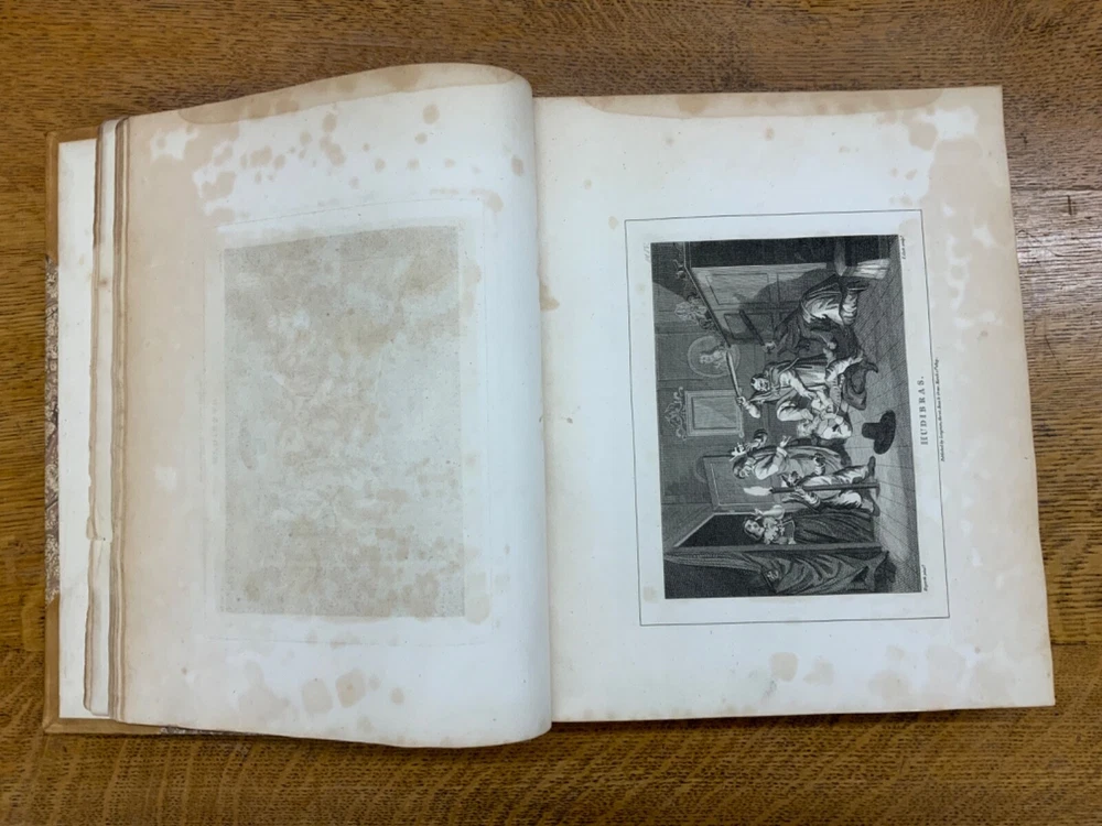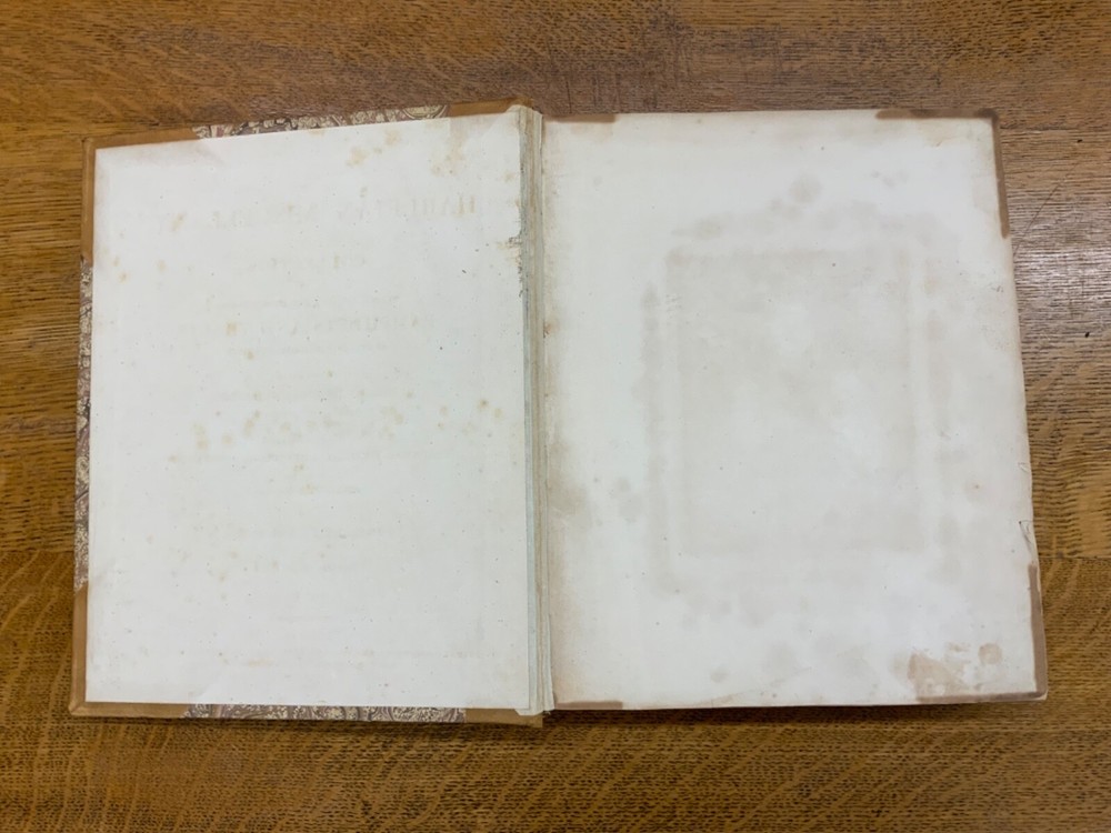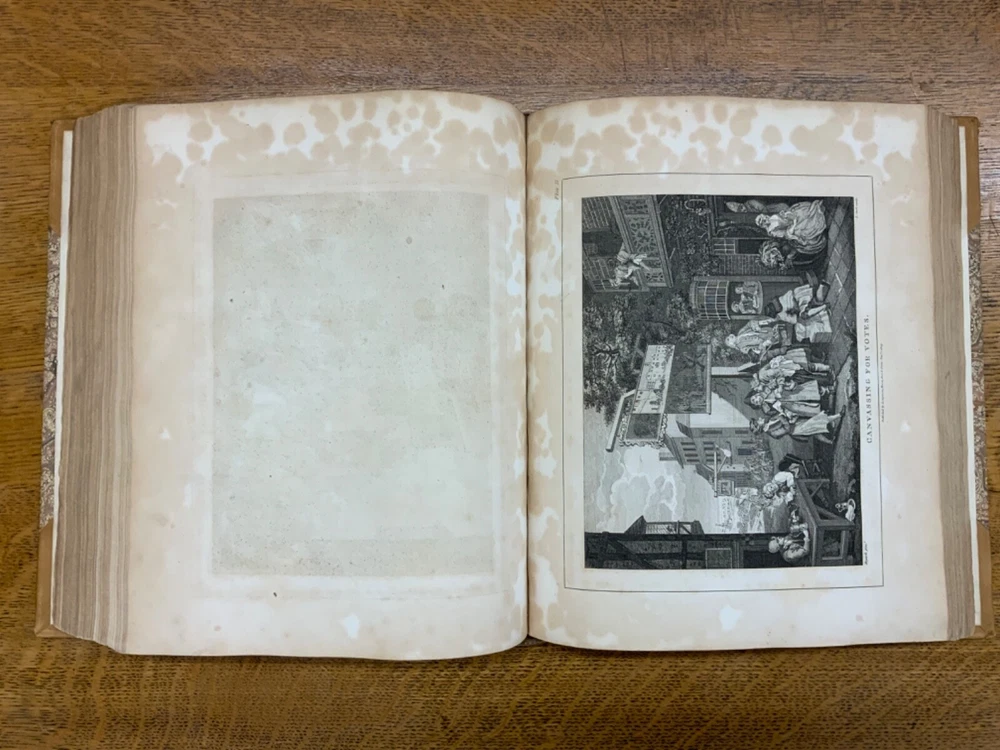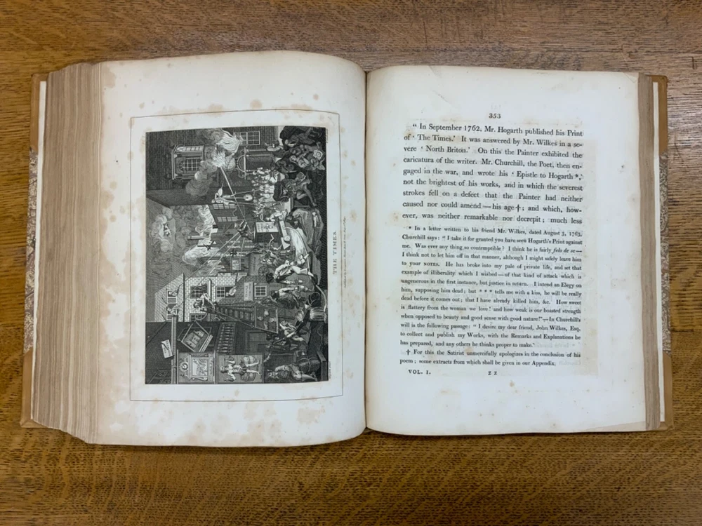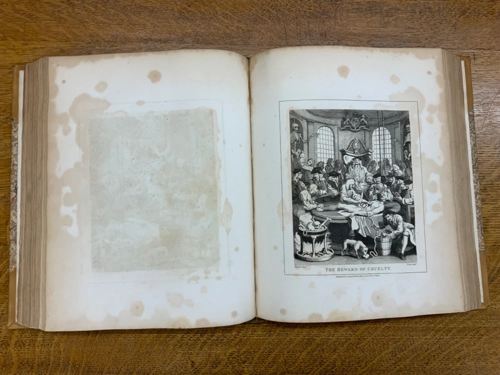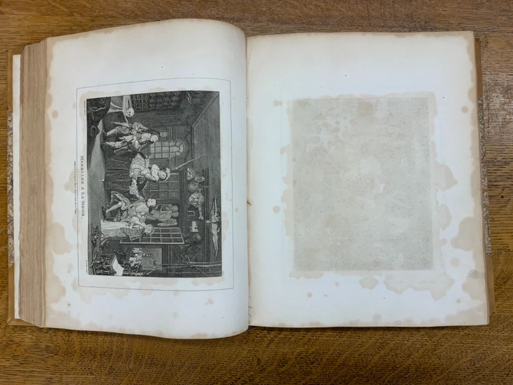 The Genuine Works of William Hogarth; Illustrated with Biographical Anecdotes, A Chronological Catalogue, and Commentary; By John Nichols, F.A.S. Edinb. & Perth; and the Late George Stevens, Esq. F.R.S. and F.S.A. In Two Volumes, Vol. I ONLY, London: Printed for Longman, Hurst, Rees, and Orme, 1808, half-leather marbled boards, 524 pp, 10.5 x 8.75", imperial octavo. In good condition. Typical wear to extremities. Edges of boards are scuffed and leather corners are worn. Gilt lettering on spine bright and clean. Foxing throughout text-block, but especially to plates. All plates present, no missing pages. Some instances of chipped pages and finger-soiling. No known previous ownership or marginalia. Binding tight and intact. Please see photos. William Hogarth (1697-1764) was an English painter, engraver, pictorial satirist, editorial cartoonist, and occasional writer on art. His work ranges from realistic portraiture to comic-like series of pictures called "modern moral subjects". He is perhaps best known for his series "A Harlot's Progress" (Included in this edition), "Marriage A-la-Mode" (Included in this edition), and "A Rake's Progress". This is only Volume One of a two volume set of Hogarth's complete works. Finely bound, presents very well. An excellent gift. FORN-MSB-0823-0739-HK474