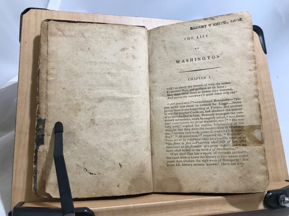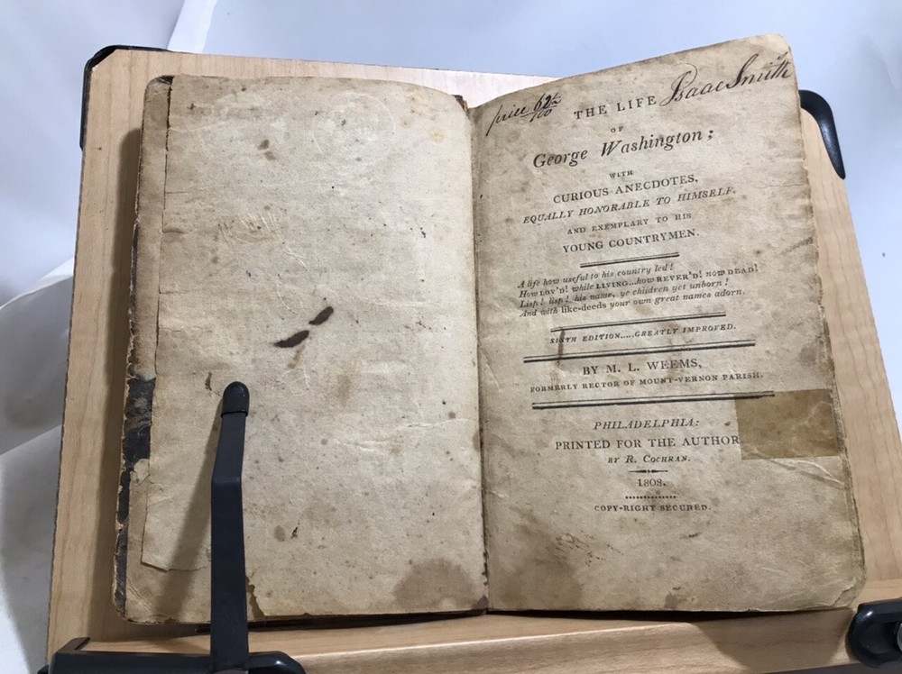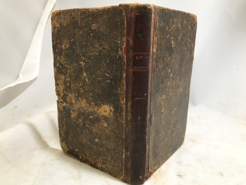 The Life of George Washington; with Curious Anecdotes, Equally Honourable to Himself, and Exemplary to His Young Countrymen, Published for the Author by R. Cochran, 1808, Original half leather, 216 pages, 12mo. In poor condition, leather worn on boards, bumped corners, spine label dull; gilt work is oxidized. Front end pages torn; title pages ahas been taped with non-archival materials. First 1-23 pages have poor repairs, various ink writing and foxing throughout. Previous owner’s name on front end page—handed down from Issac Robert Smith (1808) to his son Robert Smith (1828), not illustrated. See photos. A work of fictional biography, our copy is a very hard to find early edition. The fabricated origin of George Washington cutting the cherry tree, “I cannot tell a lie, I did it with my little hatchet” originated from this book. Mason Locke Weems was an American book agent and author who wrote the first biography of George Washington upon his death. It was a best seller that depicted Washington’s virtues and was intended to provide morally instructive tale for the youth of a young nation. RAREA1808ALOA.