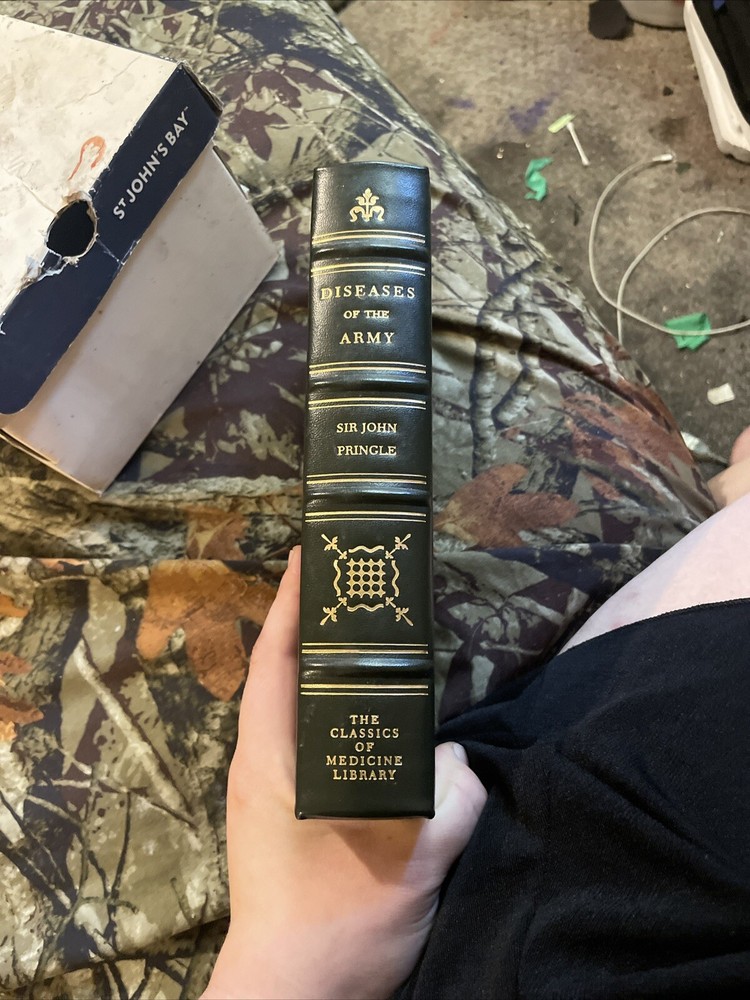 This is a rare and luxurious collector's edition book titled "DISEASES OF THE ARMY" published in 1983 by Easton Press Franklin Library Like. The book is bound in high-quality leather and is a part of the 1810 Classics of Medicine Library. It features an illustrated biography and autobiography of Sr John Pringle, a notable figure in the fields of classics, science, and medicine, with a focus on his experiences during the Mexican American War and Civil War. The book is a first edition and has several special attributes, including being a deluxe, collectible, luxury, and gift edition. It is a limited collector's edition and is perfect for collectors of rare and valuable books. This book is a must-have for those interested in the history of medicine, warfare, and the life of Abraham Lincoln.
