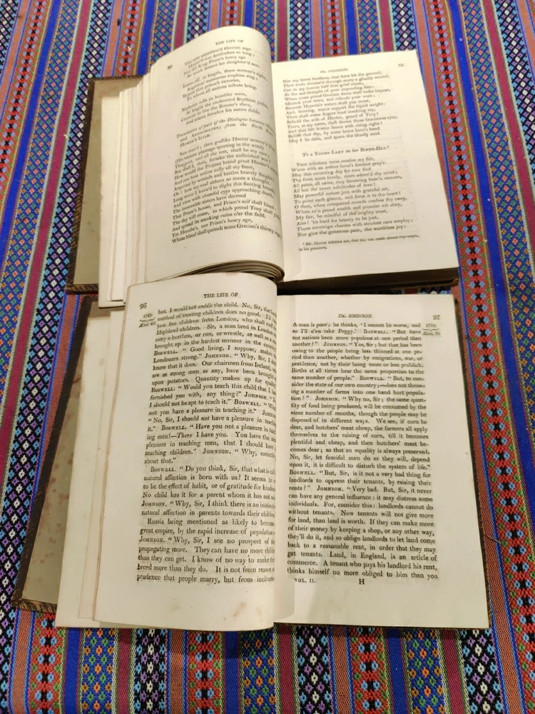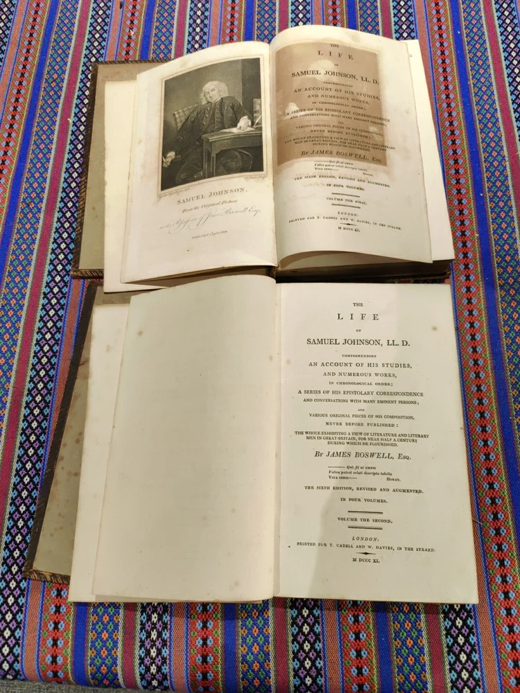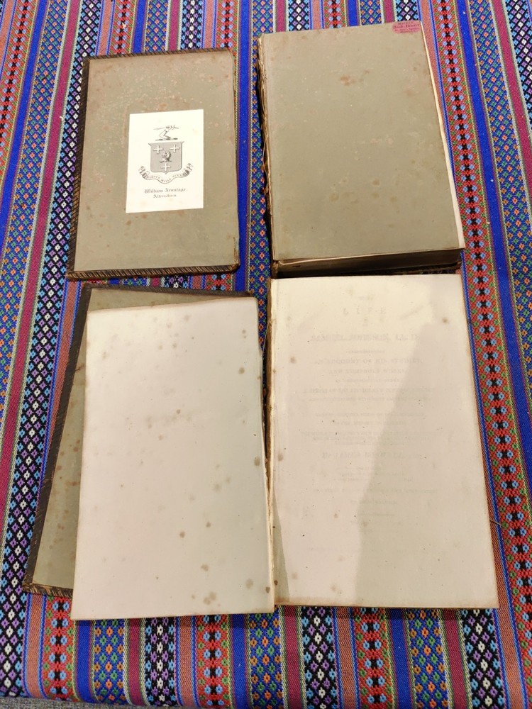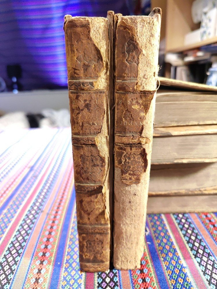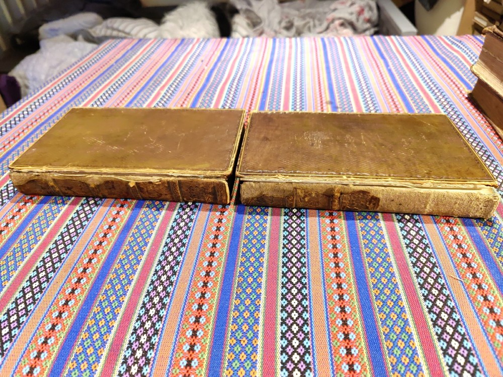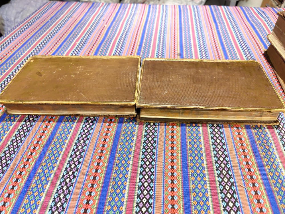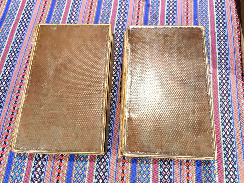 Both have the front boards loose and damaged to the spine. Back boards are on and the binding is tight. Possibly a restoration project. Both are dated 1811 Otherwise copies of this date don't have the leather front and back.