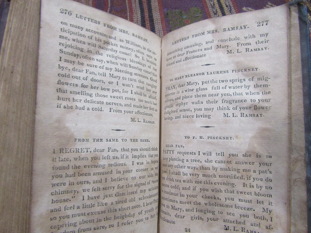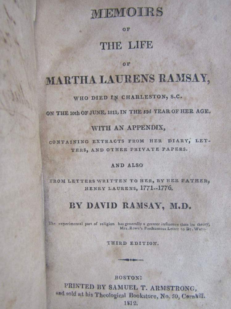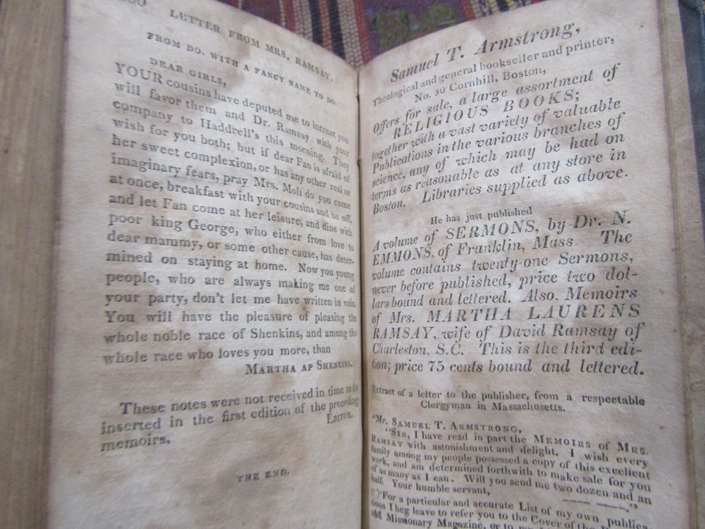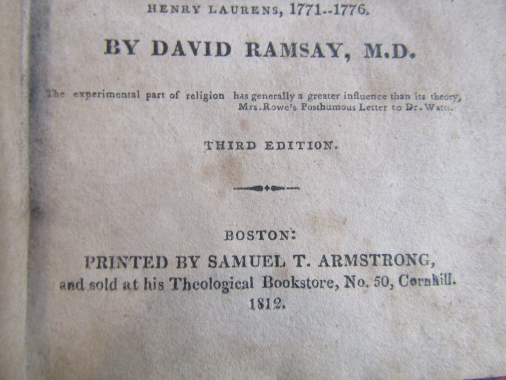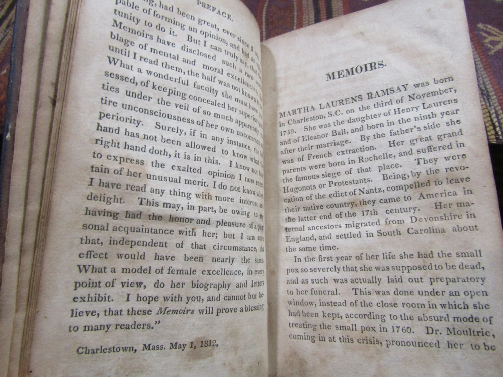 ~~Third Edition~~ ~ A Charleston, South Carolina Woman with Connections ~ ~ Wife of Dr. David Ramsay, who Published Her Diary after hear Death ~ Memoirs of the Life of Martha Laurens Ramsay, who Died in Charleston, S.C., on the 10th of June, 1811, in the 52d Year of Her Age, with an Appendix, Containing Extracts from her Diary, Letters, and Other Private Papers. And also from Letters Written to her, but her Father, Henry Laurens, 1771-1776 By David Ramsay Boston: Printed by Samuel T. Armstrong, ~ (1812) ~ ************************************************* 24mo. 280, [4] pages. Hardcover bound in original full leather. A small book measuring about 5 3/4 inches tall by 3 3/4 inches wide. The binding is rubbed and worn but sound. Gilt rules on the spine; the leather lettering piece on the spine is absent. There appears to be some old damping to the binding. Book is now in a modern removable clear mylar jacket with a handwritten label taped to the outside of the jacket. Secure hinges. Text is toned and foxed. There is heavy damping at the rear of the book. Early owner's inscription on the second front flyleaf appears to read, "Martha Hilles / Presented by her Brother Samuel Hilles" . ***************************************** We Always Accept Returns if the Item Does Not Match the Description. If You Have any Questions, Please Do Not Hesitate to Ask! *************************************************** Come visit our OPEN SHOP in Greensboro, North Carolina. Shop Hours: 10-6 Mondays ~~ Saturdays ~~Closed on Sundays~~ Pages Past -- Used & Rare Books / 1837 Spring Garden St. / Greensboro, N.C. 27403 We are proud to have serviced the Greensboro area with an open bookshop since 1996 !