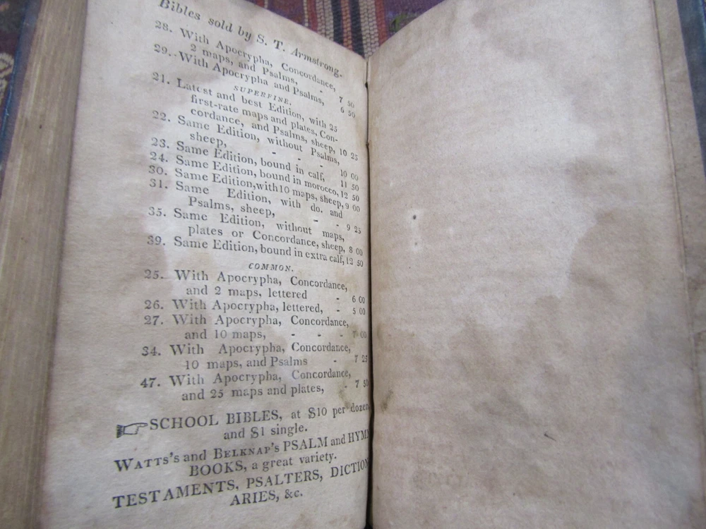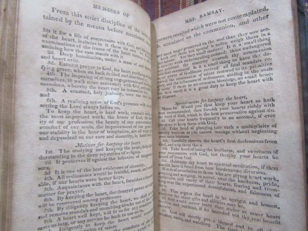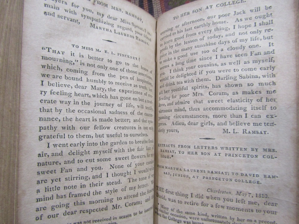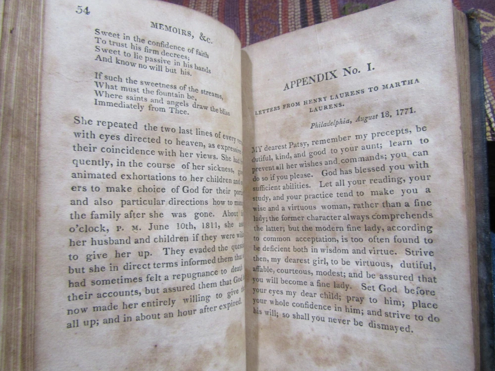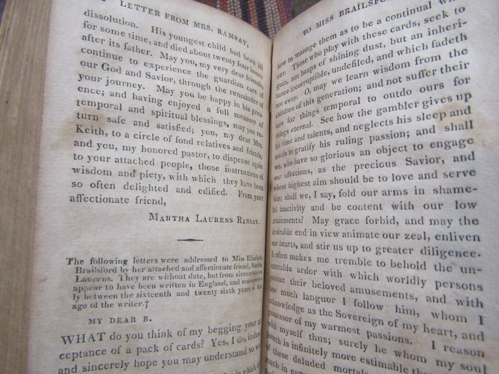 ~~Third Edition~~ ~ A Charleston, South Carolina Woman with Connections ~ ~ Wife of Dr. David Ramsay, who Published Her Diary after hear Death ~ Memoirs of the Life of Martha Laurens Ramsay, who Died in Charleston, S.C., on the 10th of June, 1811, in the 52d Year of Her Age, with an Appendix, Containing Extracts from her Diary, Letters, and Other Private Papers. And also from Letters Written to her, but her Father, Henry Laurens, 1771-1776 By David Ramsay Boston: Printed by Samuel T. Armstrong, ~ (1812) ~ ************************************************* 24mo. 280, [4] pages. Hardcover bound in original full leather. A small book measuring about 5 3/4 inches tall by 3 3/4 inches wide. The binding is rubbed and worn but sound. Gilt rules on the spine; the leather lettering piece on the spine is absent. There appears to be some old damping to the binding. Book is now in a modern removable clear mylar jacket with a handwritten label taped to the outside of the jacket. Secure hinges. Text is toned and foxed. There is heavy damping at the rear of the book. Early owner's inscription on the second front flyleaf appears to read, "Martha Hilles / Presented by her Brother Samuel Hilles" . ***************************************** We Always Accept Returns if the Item Does Not Match the Description. If You Have any Questions, Please Do Not Hesitate to Ask! *************************************************** Come visit our OPEN SHOP in Greensboro, North Carolina. Shop Hours: 10-6 Mondays ~~ Saturdays ~~Closed on Sundays~~ Pages Past -- Used & Rare Books / 1837 Spring Garden St. / Greensboro, N.C. 27403 We are proud to have serviced the Greensboro area with an open bookshop since 1996 !