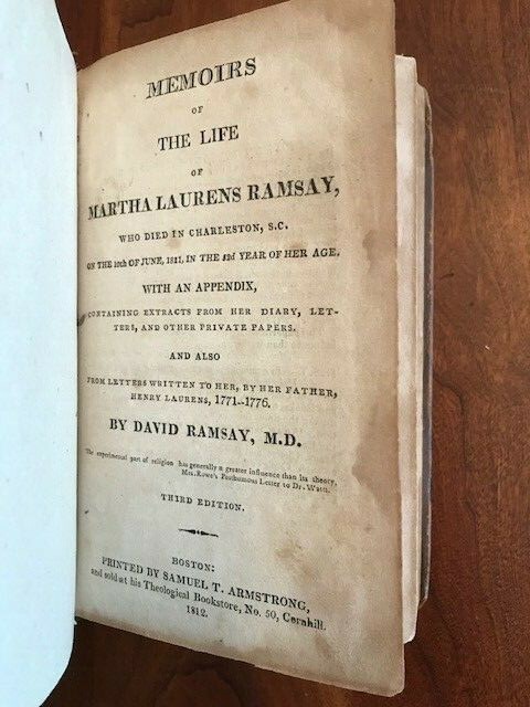Memoirs of the Life of Martha Laurens Ramsay, Who died in Charleston, S.C. on the 10th of June, 1811, in the 52nd Year of Her Age With an Appendix, containing extracts from her diary, letters, and other private papers. And also from letters written to her, by her father, Henry Laurens, 1771-1776. By David Ramsay Published: Samuel T. Armstrong, Boston, MA, 1812. 280 pp. Full leather binding. Some foxing/toning to the pages. Previous owner bookplate on front pastedown. Not Ex-Lib. I've done my best to describe the book, but if you have additional questions, please don't hesitate to send me an e-mail.