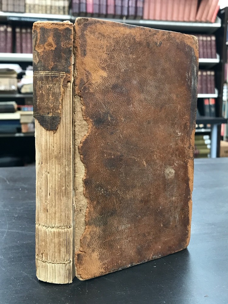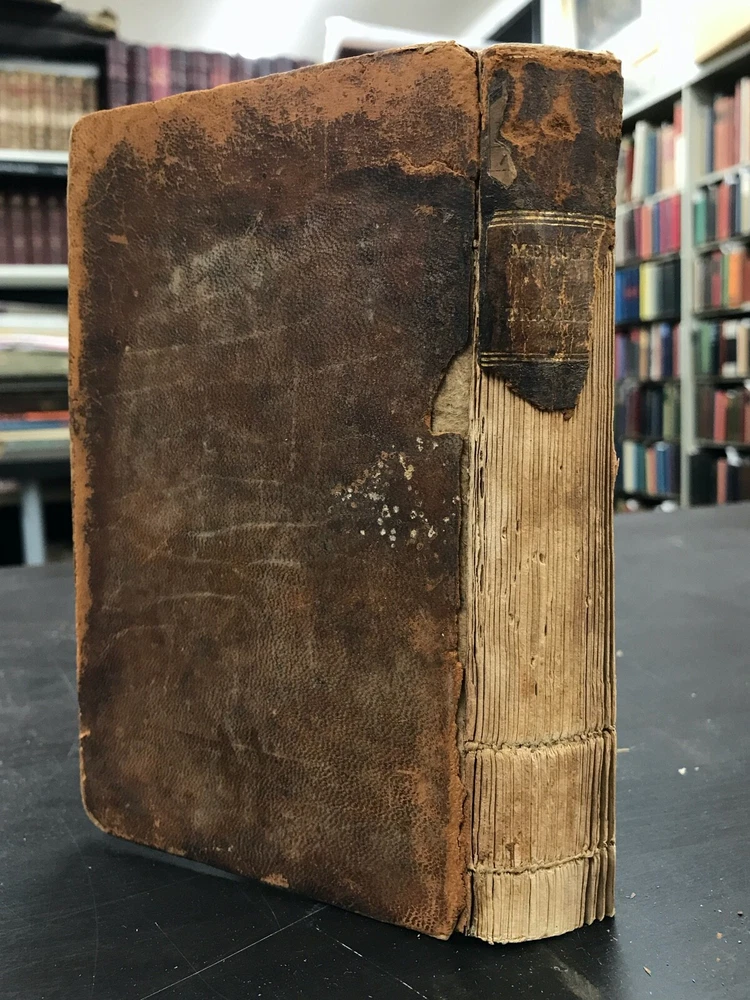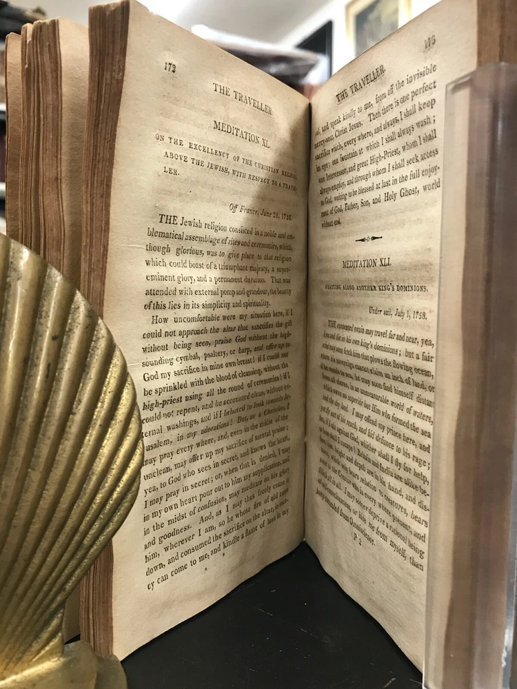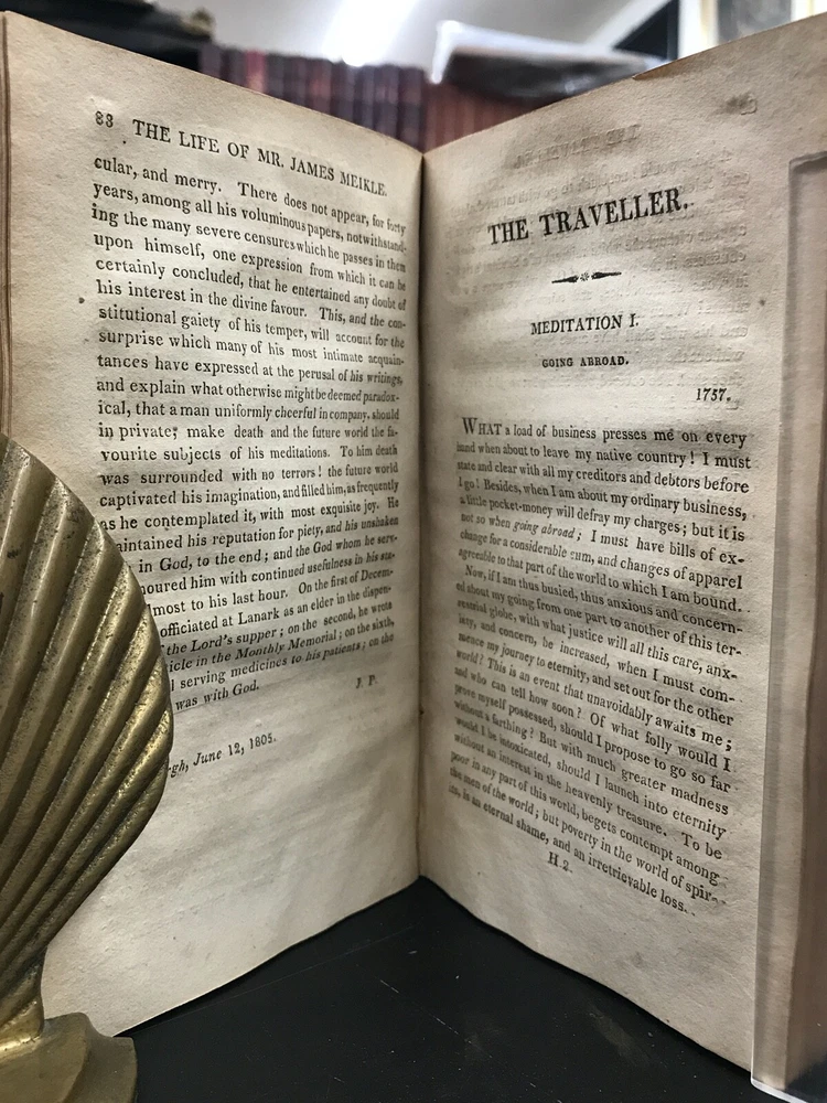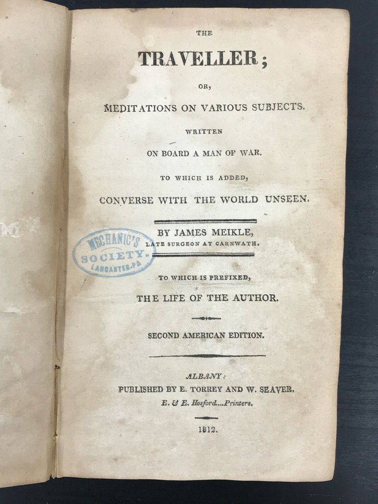 The Traveller; or, Meditations on Various Subjects. Written on Board a Man of War. To Which is Added, Converse with the World Unseen. To Which is Prefixed, the Life of the Author. Second American Edition. By James Meikle and published in Albany by E. Torrey and W. Seaver. 1812, 372 pp, 7 x 4.25", leather binding. Sold as-is with cover board and front flyleaves detached. Wear and chipping to edges of boards. Spine largely perished, along with title label. Ex-library with bookplate and stamps from the Mechanics Library Association of Lancaster, PA. Dampstaining, age-related toning throughout. Please see photographs and ask any questions prior to purchasing. James Meikle (1730-1799) was a Scottish doctor who served on the Man-O'-War Portland, on duty off the British coast and in the Mediterranean. He was intensely religious, teaching himself Hebrew while at sea. The Traveller consists mostly of religious meditations of a mystic nature, as well as material about life at sea and in ports of call. In need of some restoration, but a nice copy of a classic Christian text. FORN-ABE-MSB-0522-Shelf-580-am326