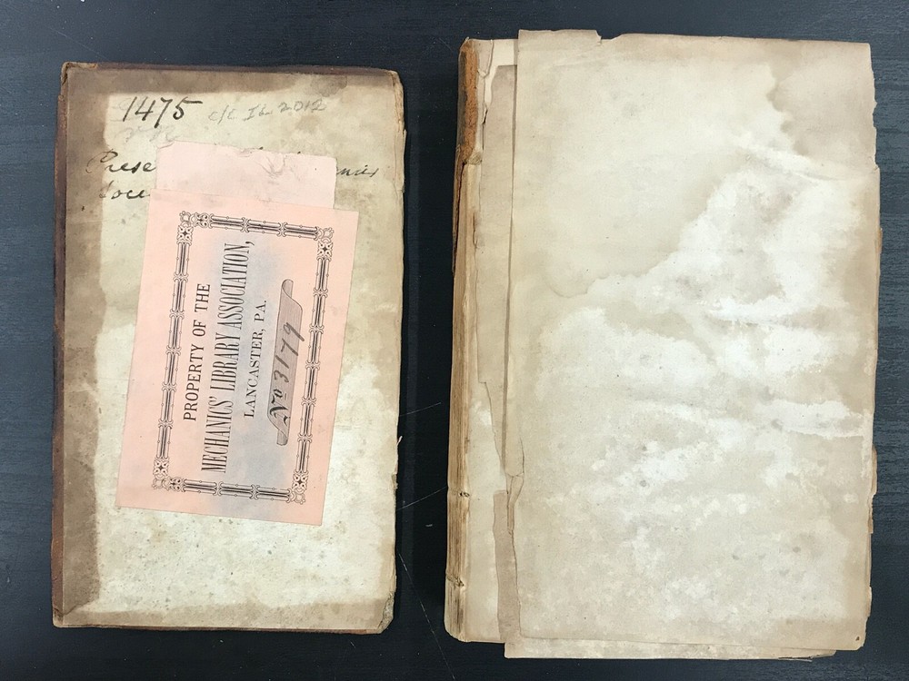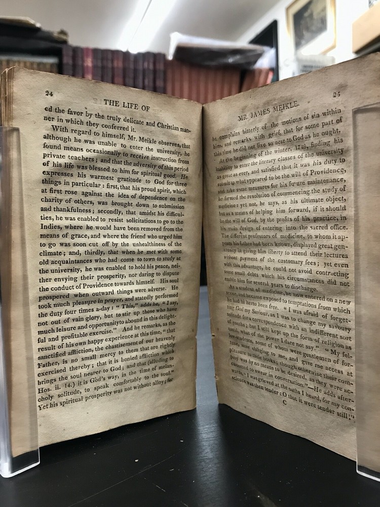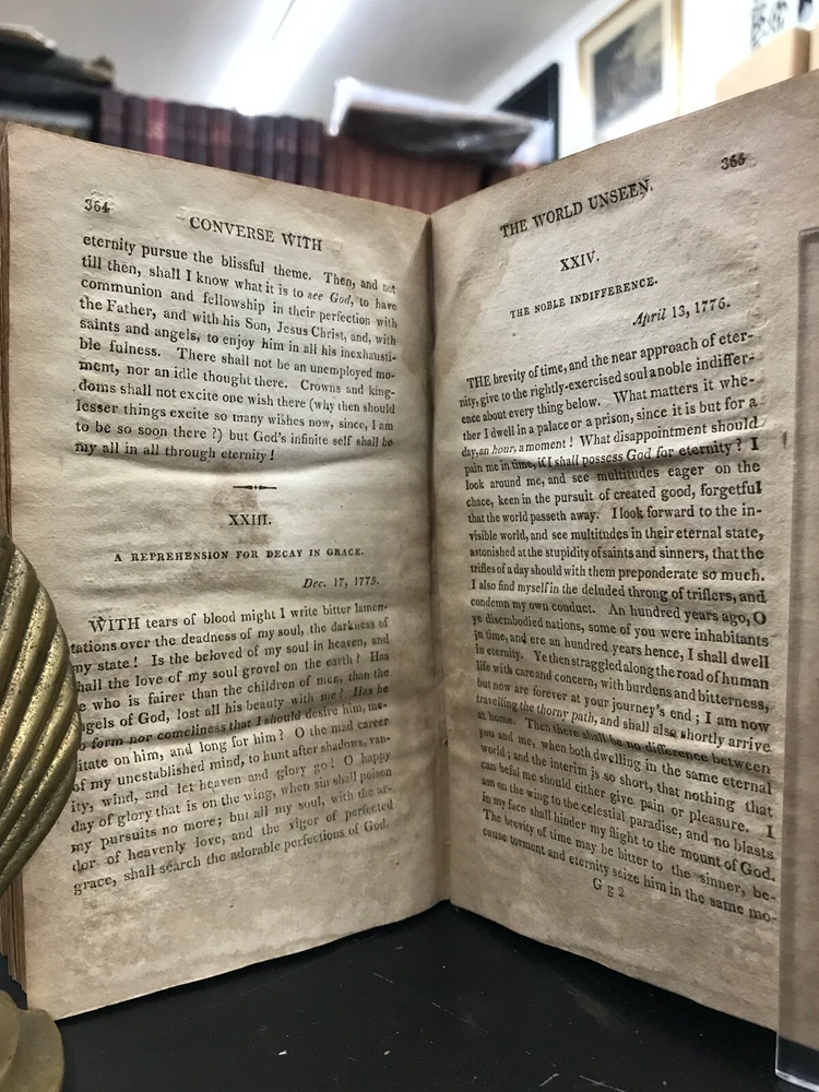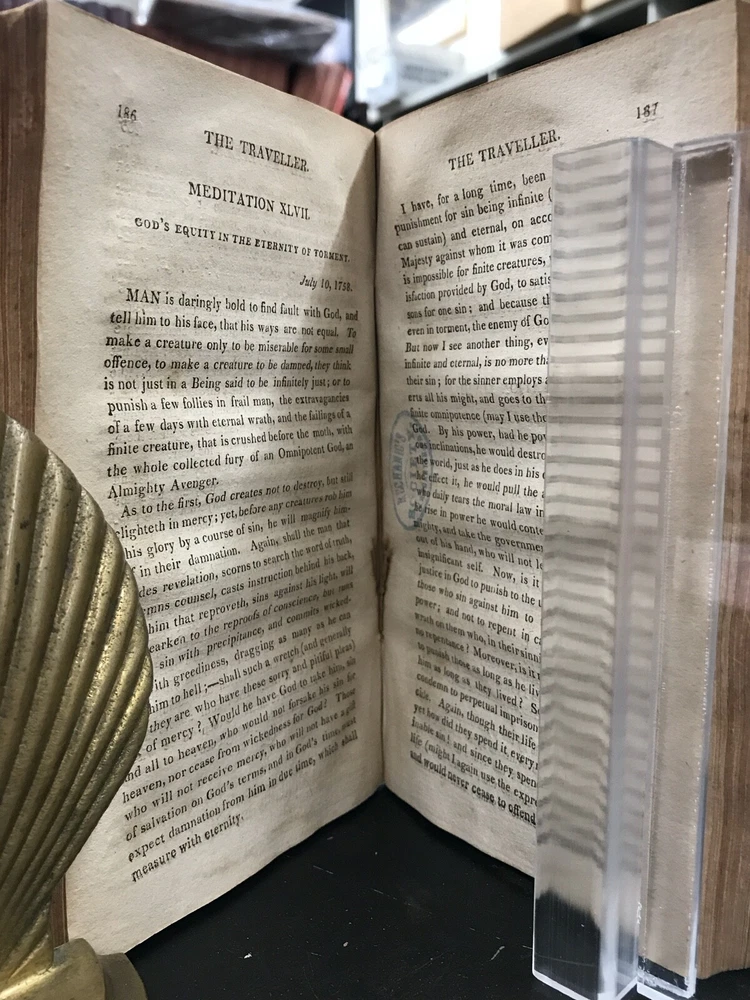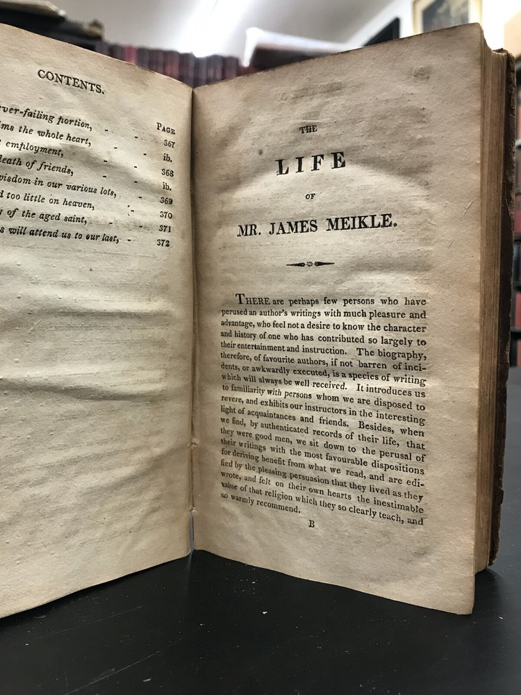 The Traveller; or, Meditations on Various Subjects. Written on Board a Man of War. To Which is Added, Converse with the World Unseen. To Which is Prefixed, the Life of the Author. Second American Edition. By James Meikle and published in Albany by E. Torrey and W. Seaver. 1812, 372 pp, 7 x 4.25", leather binding. Sold as-is with cover board and front flyleaves detached. Wear and chipping to edges of boards. Spine largely perished, along with title label. Ex-library with bookplate and stamps from the Mechanics Library Association of Lancaster, PA. Dampstaining, age-related toning throughout. Please see photographs and ask any questions prior to purchasing. James Meikle (1730-1799) was a Scottish doctor who served on the Man-O'-War Portland, on duty off the British coast and in the Mediterranean. He was intensely religious, teaching himself Hebrew while at sea. The Traveller consists mostly of religious meditations of a mystic nature, as well as material about life at sea and in ports of call. In need of some restoration, but a nice copy of a classic Christian text. FORN-ABE-MSB-0522-Shelf-580-am326