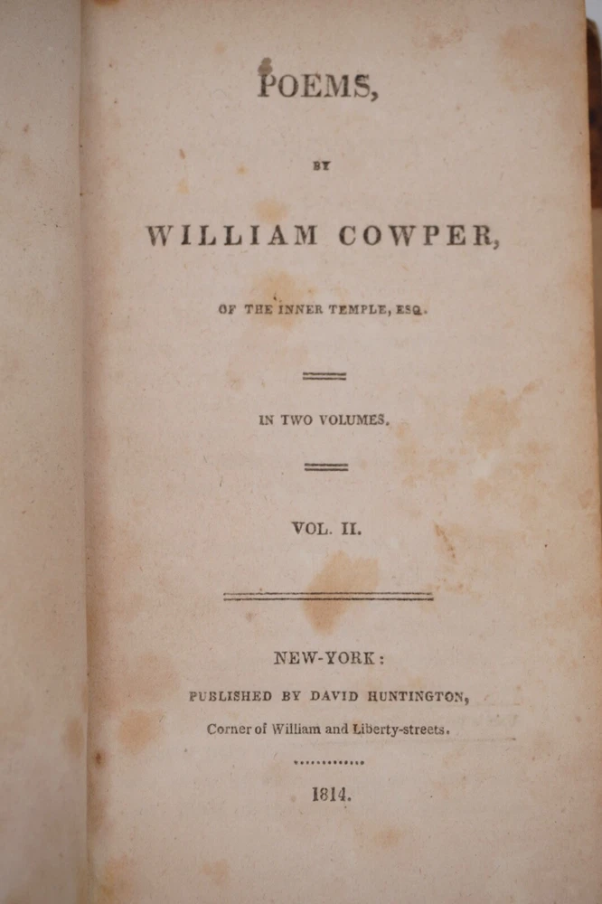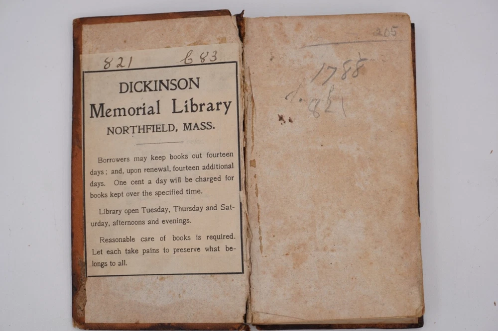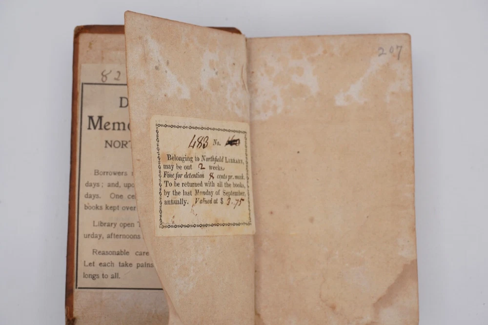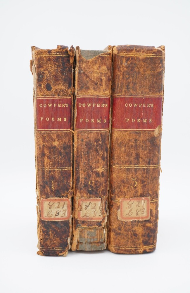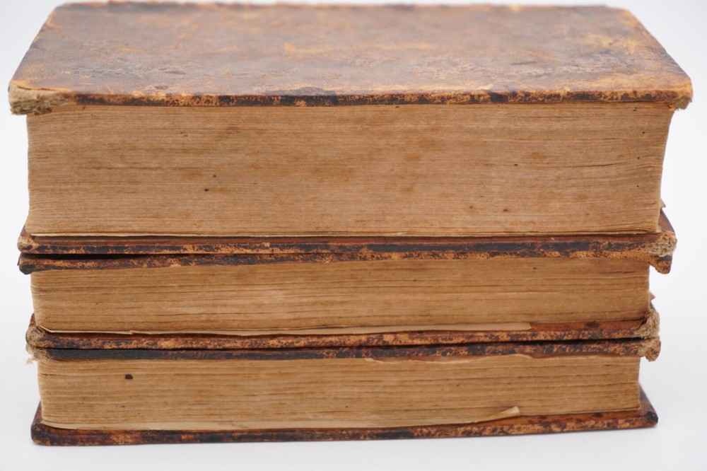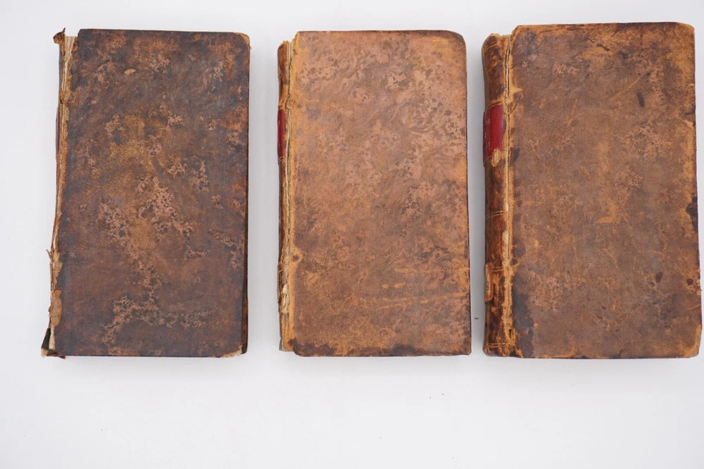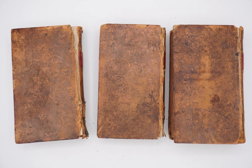 Condition is acceptable. Many library indications including spine label, plate in front, cardholders in back. Text also has moderate to heavier foxing throughout most of first 2 volumes with volume 3 being much better, examples shown. Most boards are split with back of Vol 1 only holding by 1 cord. Appears complete and no obvious pages missing except there is no frontispiece in the first volume, with Vols 1 & 2 published by David Huntington and Vol 3 a different publisher. But they are all in what looks like a contemporary early binding as a set. Also a few endpapers are starting to loosen, FEP in Vol 1 is nearly detached. Size about 3x5.25"