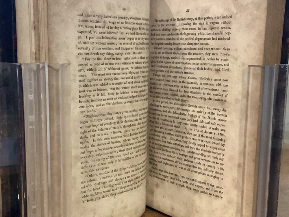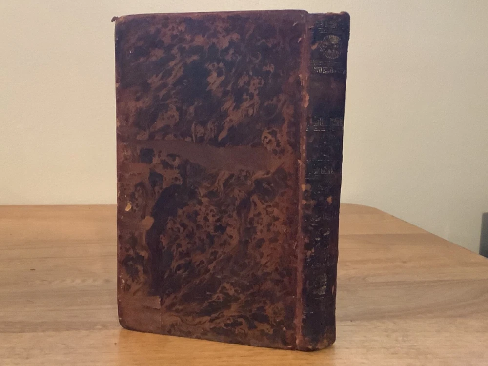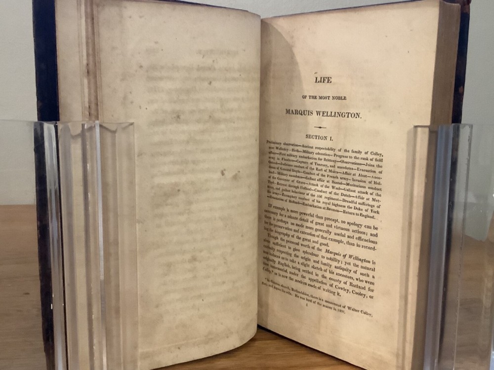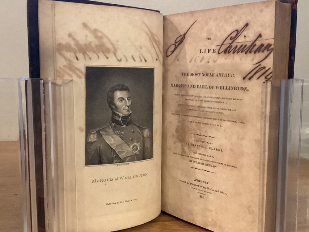 The Life of the Most Noble Arthur, Marquis and Earl of Wellington. By Francis L. Clarke William Dunlap and printed in New York City by Van Winkle and Wiley. 1814, 423 pp, 8.75 x 5.5”, 8vo, full leather hardcover. In overall good condition, with rubbing to leather and lettering on boards and spine. Hinges remain in good condition with minor wear. Text block remains bound well. Old hand inscriptions at front, including “Christmas 1814” on title page. General age-related toning to pages, along with periodic foxing and wear. Please see photographs and ask any questions prior to purchasing. A scarce look at the early life and career of Arthur Wellesley, 1st Duke of Wellington (1769-1852), a British military officer who later became Prime Minister in 1828. COLH1814BEGX-0523-aj0068