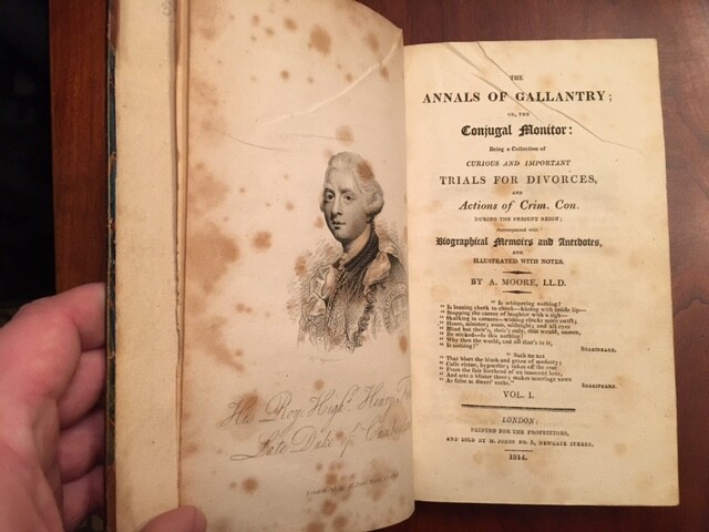 The Annals of Gallantry; Or, The Conjugal Monitor, Being a Collection of Curious and Important Trials for Divorces, And Actions of Crim. Con. During the Present Reign; Accompanied with Biographical Memoirs and Anecdotes, And Illustrated with Notes. Complete Three Volume Set. By A. Moore and George Cruikshank Published: London: Printed for the Proprietors, And Sold by M. Jones, 1814-1815. FIRST EDITION. Three volumes. Sixteen Hand-Colored Plates (One additional plate is not hand-colored), Three by George Cruikshank [Trials]. Moore, A. [Cruikshank, George, Illustrator]. [Jenkins, J., Illustrator]. The 3 color plates by Cruikshank present. Both boards detached on Volumes I and II. Only edition (in this form). The Annals of Gallantry was originally issued in 18 monthly parts from March 1, 1814 to August 1, 1815. This book aimed to amuse and titillate. The accounts in these volumes are valuable nevertheless for their accurate reports and vivid background histories. What is more, this collection is a fascinating document of English social and legal attitudes toward adultery and divorce during the age of George IV and Jane Austen. The Plates by Cruikshank, all in Volume I, are "Lady Grosvenor and the Duke of Cumberland Surprised by the Servant," "The Unwelcome Intruders" and "The Elopement of Lady W---- with Lord Paget." Cohn, A Bibliographical Catalogue of the Printed Works Illustrated by George Cruikshank 573. Previous owner bookplate on front pastedown of each volume. SCARCE. Not Ex-Lib. I've done my best to describe the book, but if you have additional questions, please don't hesitate to send me an e-mail.