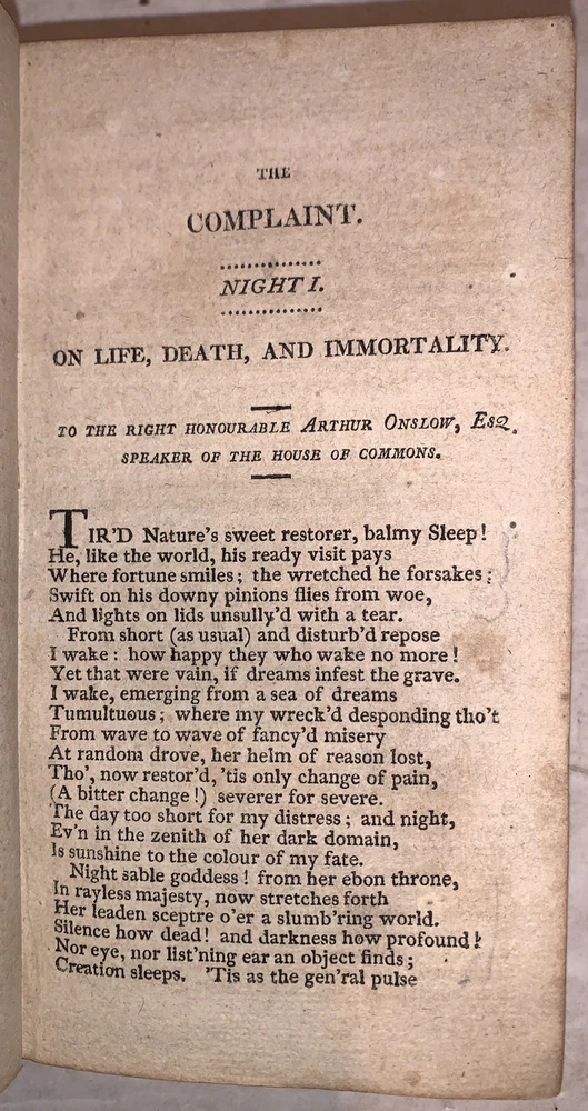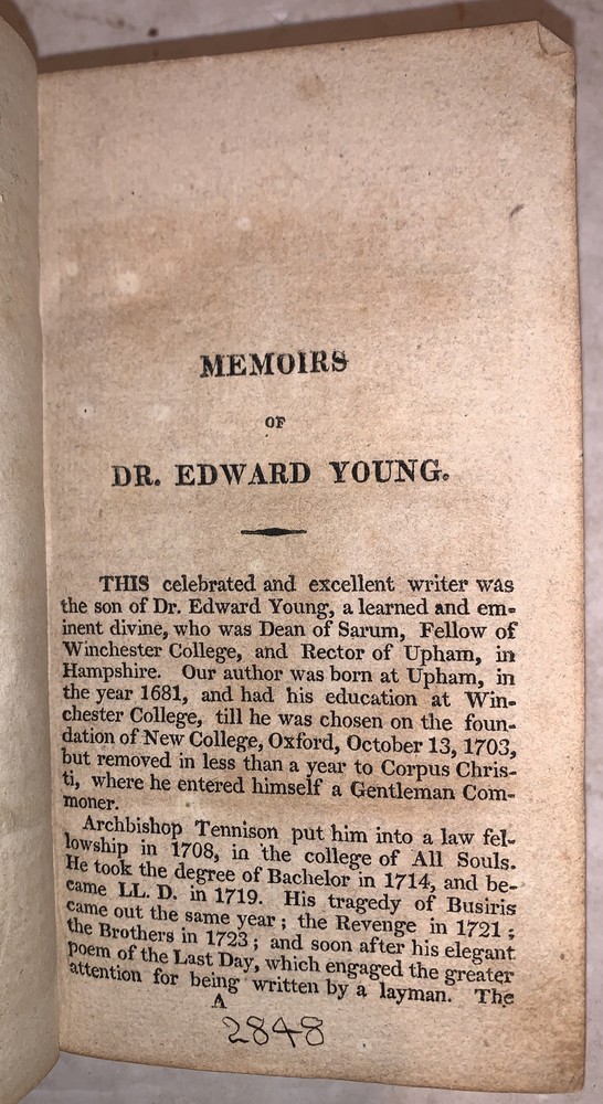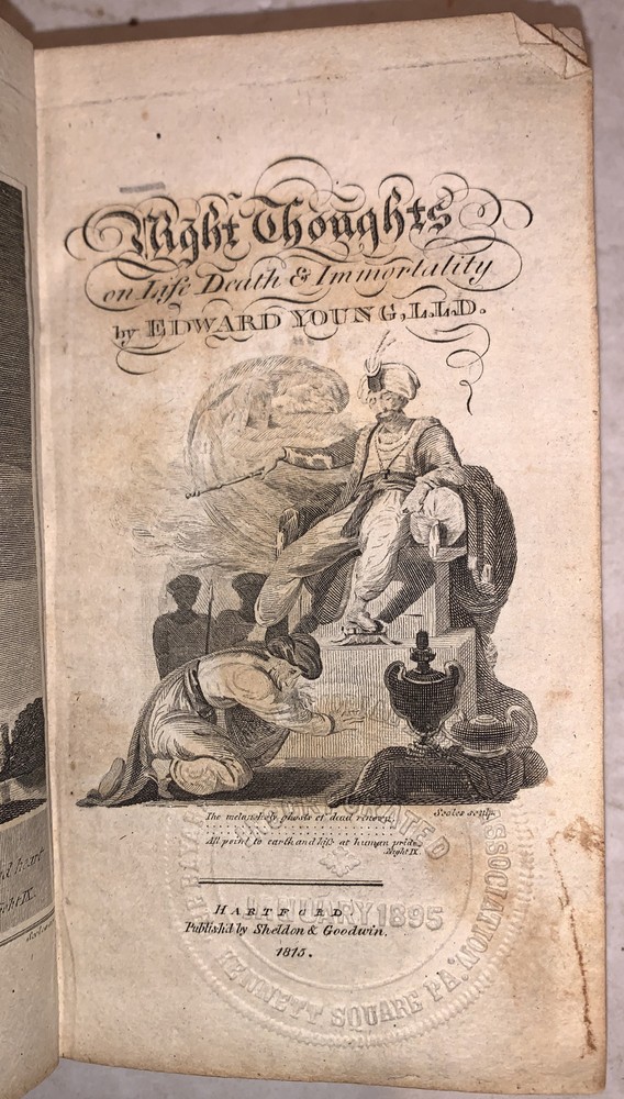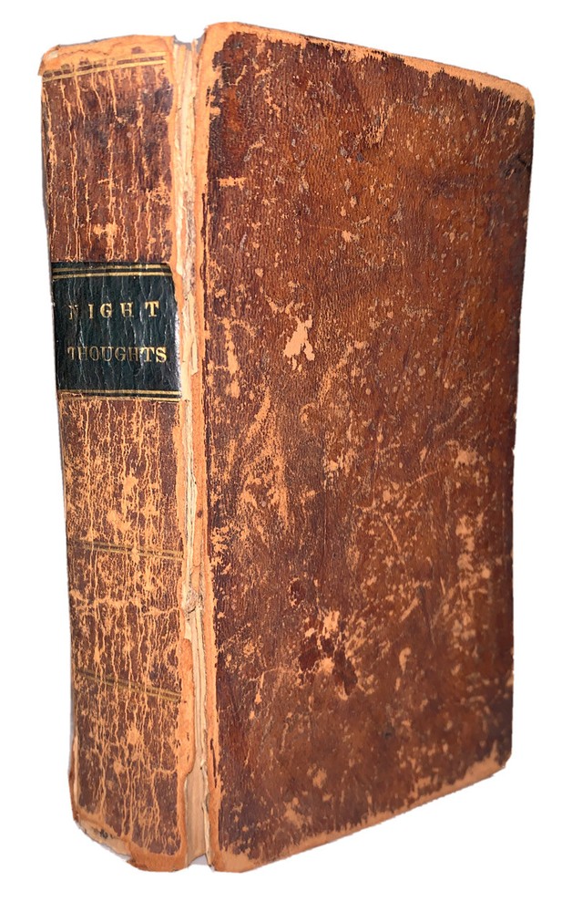 Night Thoughts on Life, Death & Immortality by Edward Young, L.LD. Hartford: Published by Sheldon & Goodwin 1815 32mo, 254, [6] pages, bound in period full leather with gilt lettered spine. Ex-library with some of the typical markings, hinges cracked, foxing and discoloration, else in good condition. If you have any questions feel free to ask and don't forget to check out my other listings.