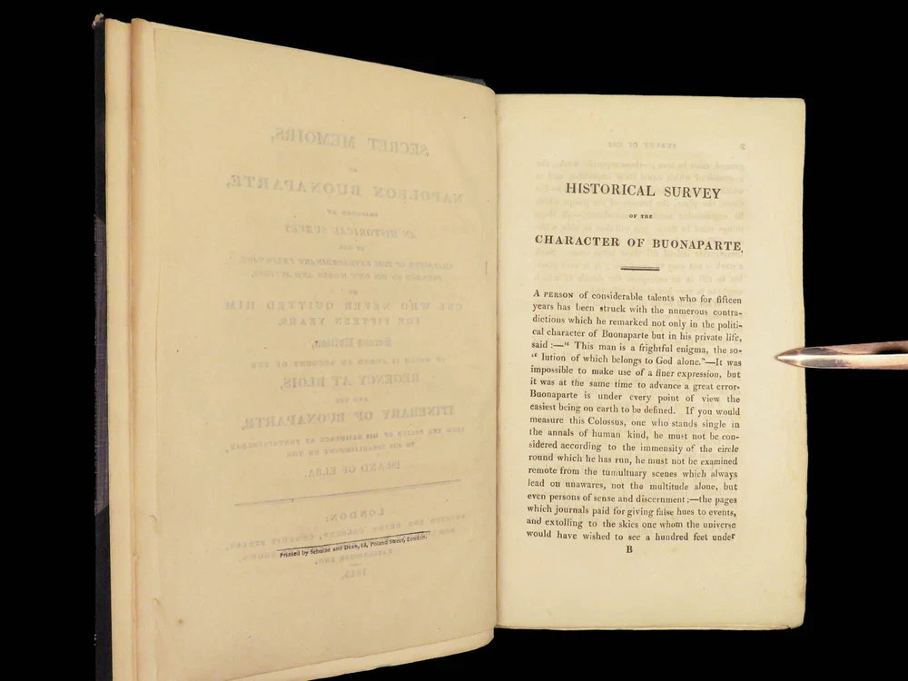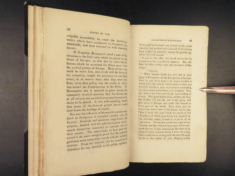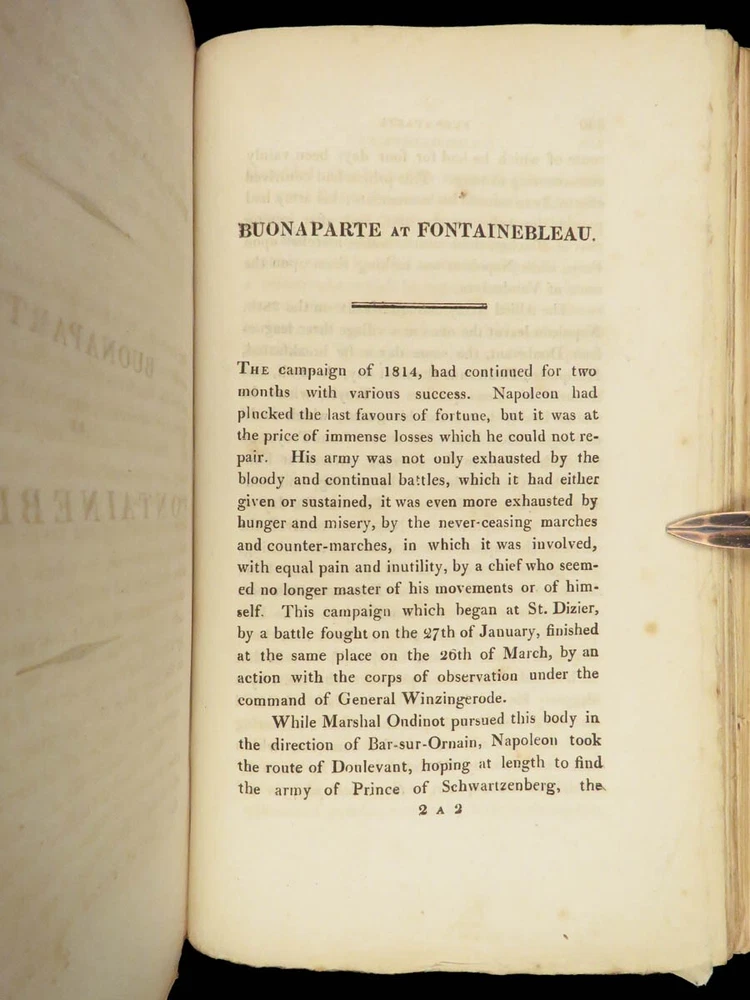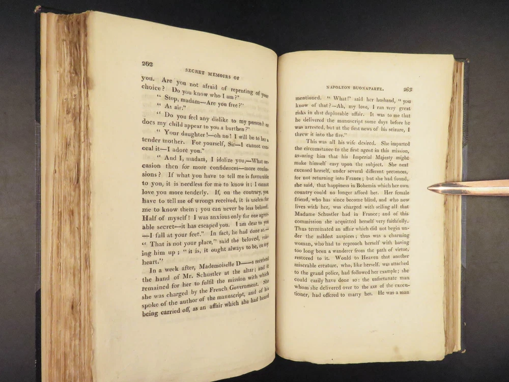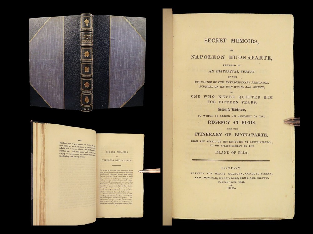 1815 SECRET Memoirs 1 ed Napoleon Bonaparte Napoleonic WARS Waterloo Revolution “Never interrupt your enemy when he is making a mistake.” – Napoléon Bonaparte Napoléon Bonaparte was the most prominent Military leader during the French Revolution and led many successful campaigns, dominated European, and global affairs for more than a decade. In the years following the French Revolution and Napoleonic Wars, the French public was interested in the life of Napoleon and his armies. Charles Doris, who claimed to have viewed Napoleon from a distance for many years, wrote a biographical sketch of Napoleon, in which he writes out of sympathy for Napoleon – noting his lack of friendships, his barbaric mindset, and his desire only to be victorious in battle. ‘ Secret Memoirs’ as it is known is a rare account of Napoleon’s life and military career, published following Napoleon’s defeat at Waterloo. Item number: #24699 Price: $499 DORIS, Charles Secret Memoirs of Napoleon Buonaparte, preceded by an historical survey of the character of this ... personnage, founded on his own words and actions, by one who never quitted him for fifteen years (Ch. Doris). Second edition, to which is added an account of the regency at Blois, and the itinerary of Bonaparte from the period of this residence at Fontainebleau to his establishment on the island of Elba. London : H. Colburn, 1815. 1 st edition Details : · Collation: Complete with all pages o [2], 46, xviii, 49-420, 16 · Language: English · Binding: Leather; secure · Size : ~8.5in X 5.5in (22cm x 14cm) Our Guarantee: Very Fast. Very Safe. Free Shipping Worldwide. Customer satisfaction is our priority! Notify us with 7 days of receiving, and we will offer a full refund without reservation! 24699