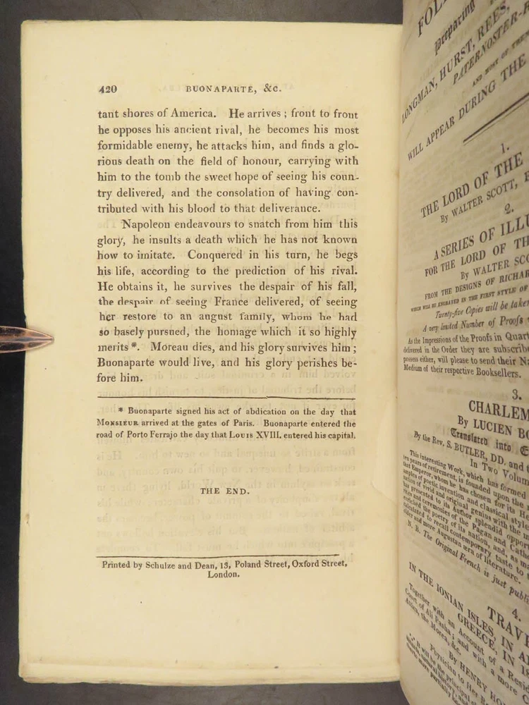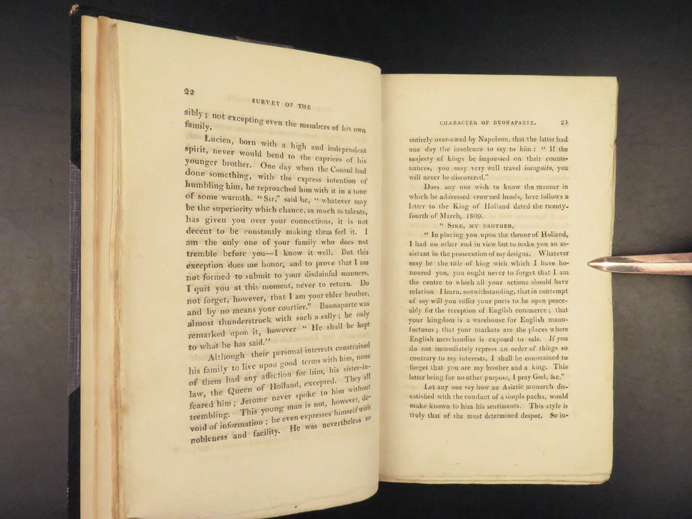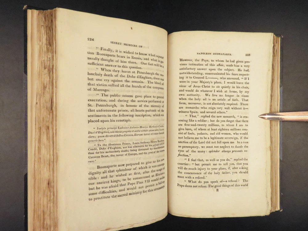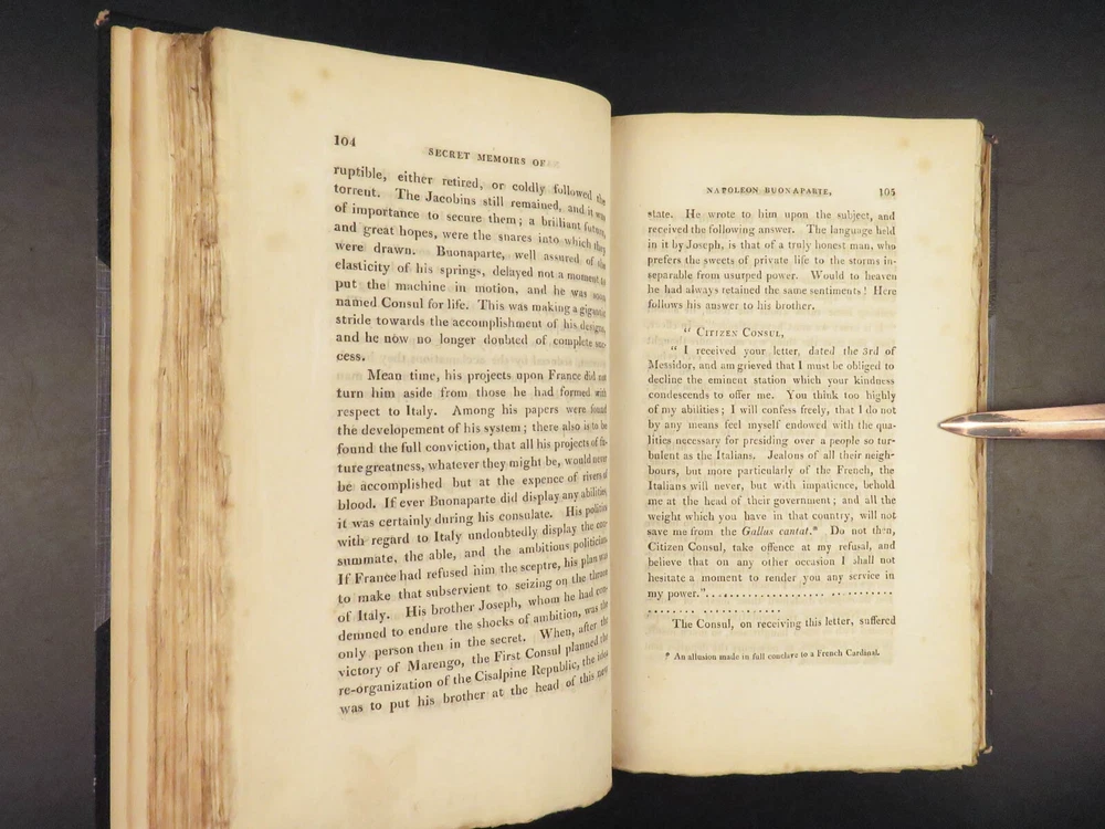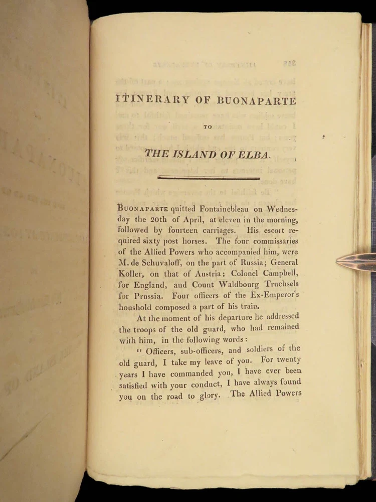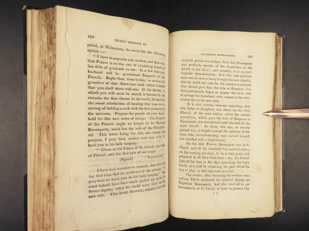 1815 SECRET Memoirs 1 ed Napoleon Bonaparte Napoleonic WARS Waterloo Revolution “Never interrupt your enemy when he is making a mistake.” – Napoléon Bonaparte Napoléon Bonaparte was the most prominent Military leader during the French Revolution and led many successful campaigns, dominated European, and global affairs for more than a decade. In the years following the French Revolution and Napoleonic Wars, the French public was interested in the life of Napoleon and his armies. Charles Doris, who claimed to have viewed Napoleon from a distance for many years, wrote a biographical sketch of Napoleon, in which he writes out of sympathy for Napoleon – noting his lack of friendships, his barbaric mindset, and his desire only to be victorious in battle. ‘ Secret Memoirs’ as it is known is a rare account of Napoleon’s life and military career, published following Napoleon’s defeat at Waterloo. Item number: #24699 Price: $499 DORIS, Charles Secret Memoirs of Napoleon Buonaparte, preceded by an historical survey of the character of this ... personnage, founded on his own words and actions, by one who never quitted him for fifteen years (Ch. Doris). Second edition, to which is added an account of the regency at Blois, and the itinerary of Bonaparte from the period of this residence at Fontainebleau to his establishment on the island of Elba. London : H. Colburn, 1815. 1 st edition Details : · Collation: Complete with all pages o [2], 46, xviii, 49-420, 16 · Language: English · Binding: Leather; secure · Size : ~8.5in X 5.5in (22cm x 14cm) Our Guarantee: Very Fast. Very Safe. Free Shipping Worldwide. Customer satisfaction is our priority! Notify us with 7 days of receiving, and we will offer a full refund without reservation! 24699