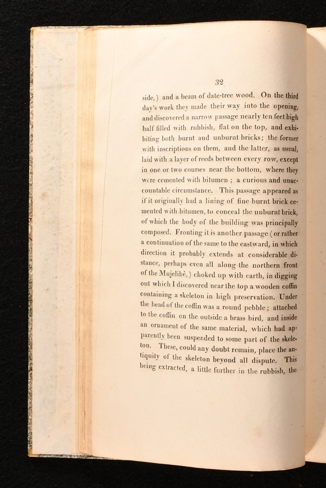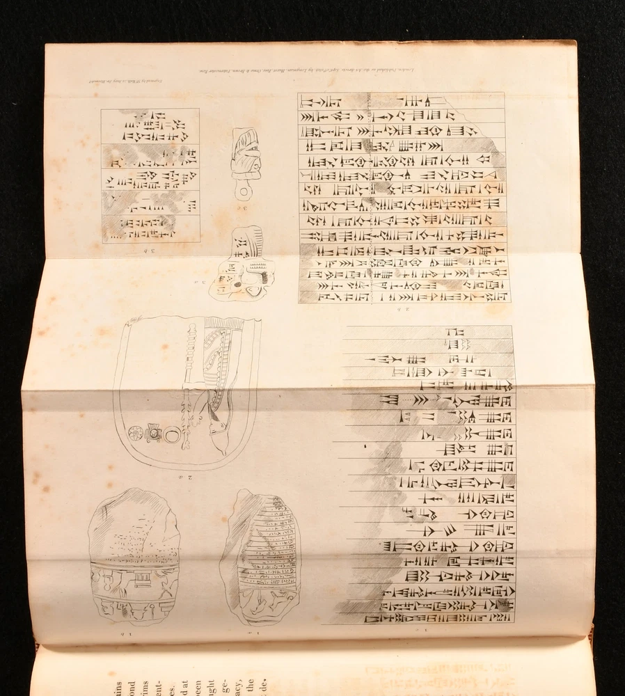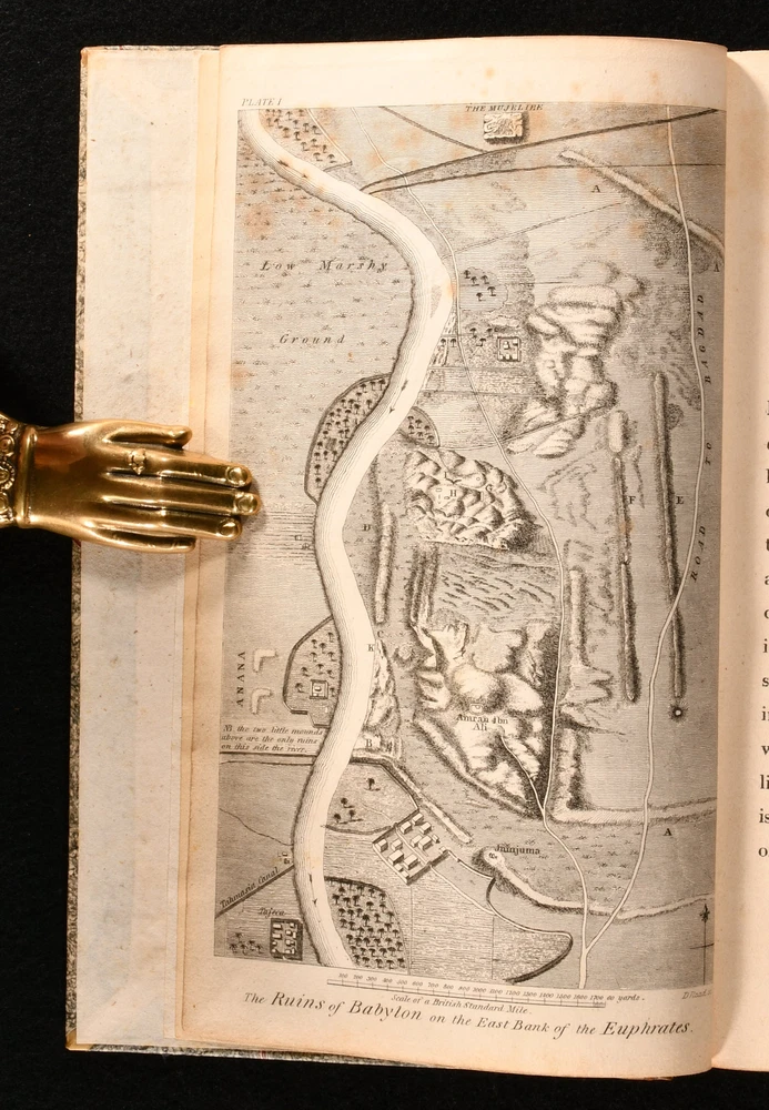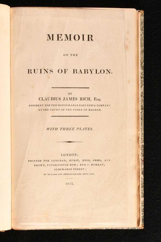 Click here to see our other books! Memoir on the Ruins of Babylon [With] Second Memoir on Babylon Claudius James Rich 1815-1818 Longman, Hurst, Rees, Orme and Brown : London 9.5" by 6" [3], iv, 2-67; [7], 2-60pp SUMMARY An extremely scarce, finely bound, first edition of Claudius James Rich's two historical works on Babylon. First Edition,Illustrated,Leather Binding Overall Condition: Very Good Indeed This book weighs 0.5 KG when packed UK Postage: £ 3.99 US Postage: £ 19.99 EU Postage : £ 15.99 European Postage: £ 16.99 Asia Postage: £ 21.99 Worldwide Postage: £ 25.99 DESCRIPTION Being the first edition of his 'Memoirs of Babylon' and his 'Second Memoir of Babylon'. Illustrated, with three plates to the first volume, and three plates to the second volume. With publishers' adverts to the second volume. Library bookplate to the front pastedown for Worcester Library. With their blind stamp to the plates. Claudius Rich was a traveller and antiquarian scholar. He was appointed a cadet in the East India Company's service, which allowed him to travel to Constantinople. He then proceeded to Alexandria as an assistant to the British consul-general, where he learned Arabic. He then travelled much of the Middle East and Asia. Upon moving to Baghdad as the British Resident in 1808, he devoted his time to investigating the geography, history and antiquities of the district. A detailed description of Babylon at the start of the nineteenth century. Here are two very scarce works, beautifully presented in a smart quarter calf binding. CONDITION In a quarter calf binding, with paper covered boards. Externally, excellent with minor shelfwear to the extremities. Bookplate to the front pastedown. Internally, firmly bound Pages are very bright. Institutional blind stamp to the plates. Minor offsetting to the title page of volume II. Occasional scattered spots. Overall Condition: Very Good Indeed GLOSSARY OF TERMS Overall Condition (Dustwrapper condition rating is shown after that for the book itself, where a dustwrapper is present) Fine - Very well preserved copy showing very little wear Very Good Indeed - Only one or two minor faults, really a very attractive copy Very Good - Quite a wide term meaning no major faults but probably several smaller ones often expected given the age of the book, but still a respectable copy Good - Meaning not very good. Some more serious faults as will be described in the condition report under 'condition' Good Only - Meaning one or more faults that could really do with repair Fair - As with good only above but with other faults leaving a compromised copy even after repair Poor - Really bad and possibly seriously incomplete. We only sell books in this condition where their rarity or value makes them attractive none the less. Major defects will be described. GUARANTEE We offer a full money back guarantee on our descriptions. Please ask for details and conditions. We prefer PAYPAL. If you pay via PAYPAL we will post the item off the same or the next working day with the postage you have selected. Please note we cannot accept USD cheques