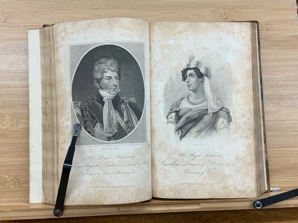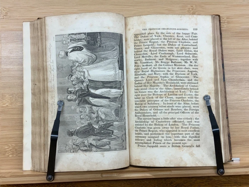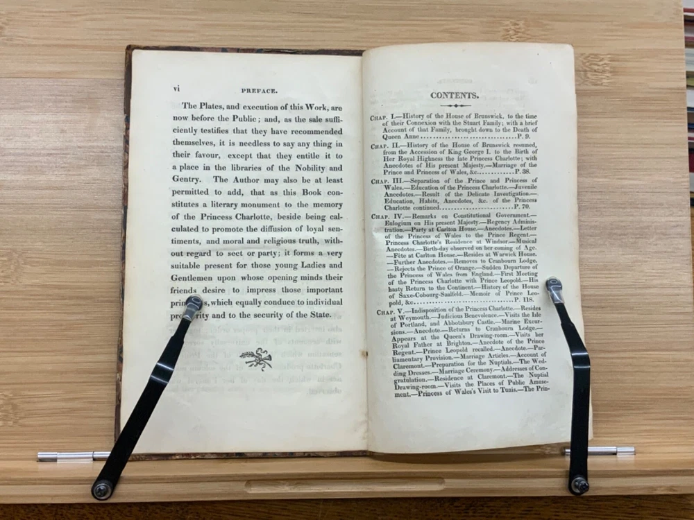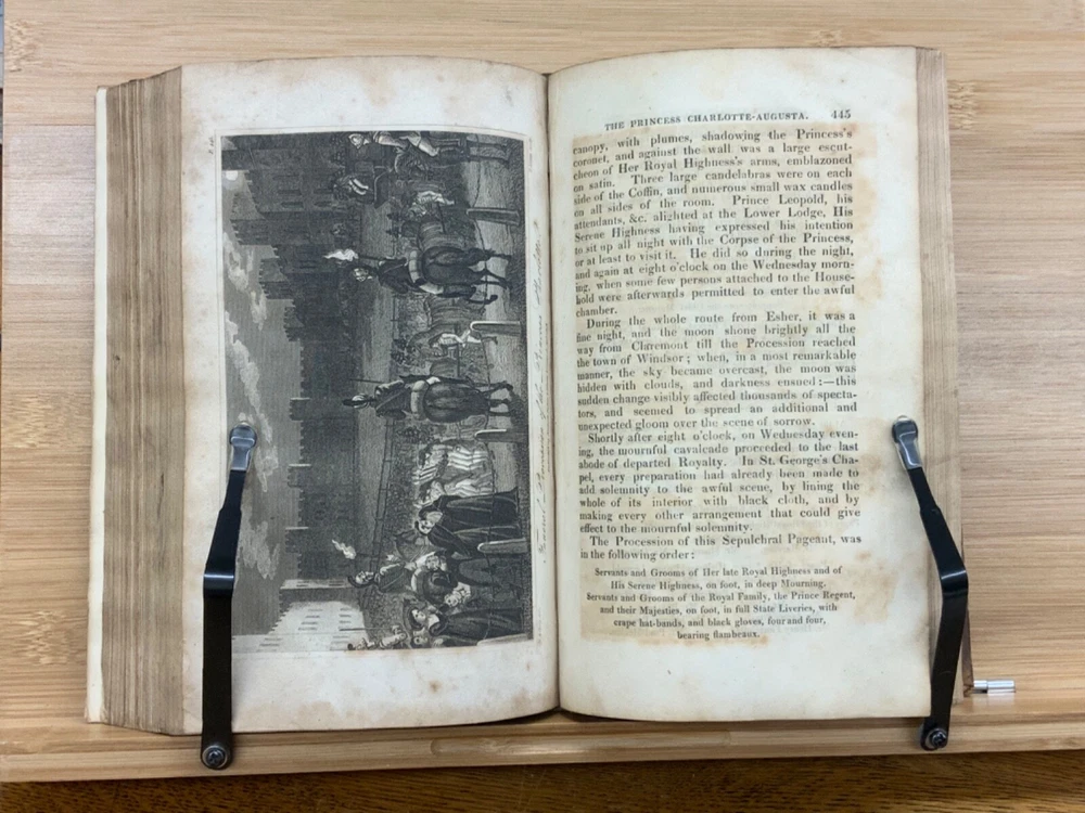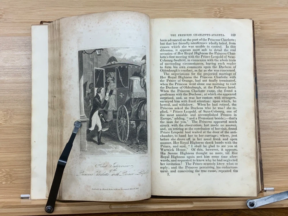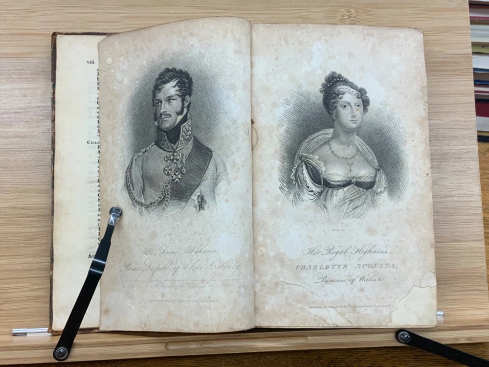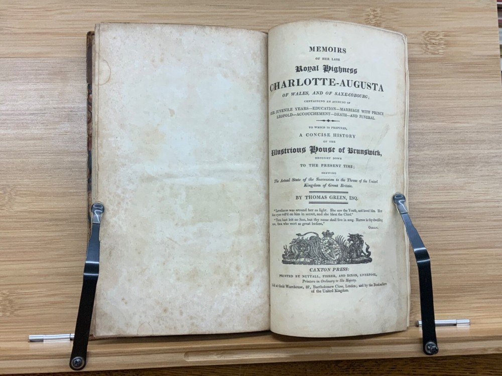 Memoirs of Her Late Royal Highness Charlotte-Augusta of Wales, and of Saxe-Cobourg; Containing an Account of Her Juvenile Years, Education, Marriage with Prince Leopold, Accouchement, Death, and Funeral. To Which is Prefixed, A Concise History of the Illustrious House of Brunswick, Brought Down To the Present Time; Shewing The Actual State of the Succession to the Throne of the United Kingdom of Great Britain. By Those Green, Esq. Easton Press: Printed by Nuttall, Fisher, and Dixon, Liverpool. 1818, 3/4 leather marbled binding, many engraved plates, 576 pp, 8.5 x 5.5", 8vo. In fair condition. Front board to viii are detached from binding. Boards are scuffed at edges & worn/bumped at corners. General scuffing to marbling on boards. Head of spine lacking - binding expose. Gilt title on spine is heavily rubbed & soiled - title illegible. Previous ownership signature on front end-page. Toning throughout text-block. Off-setting exhibited on all pages directly across from plates. All plates are present but exhibit foxing and some age-staining. Finger-soiling and ink stains found in a few instances throughout text-block. No known marginalia. Binding is intact, but fragile in some places. Please see photos. Princess Charlotte Augusta of Wales (1796-1817) was the only child of George, Prince of Wales (later George IV), and his wife, Caroline of Brunswick. She was expected to ascend the British throne after the deaths of her grandfather, George III, and her father, but died in childbirth at the age of 21, predeceasing them both. Charlotte's death set off a tremendous mourning among the British, who had seen her as a sign of hope and a contrast to both her unpopular father and mentally ill grandfather. She had been George III's only legitimate grandchild and her death prompted a succession crisis, as there was a chance the throne would pass to a distant relative. The King's aging and unmarried sons looked for wives; it was his fourth son, Prince Edward, Duke of Kent and Strathearn, who fathered the eventual heir, Victoria. This memoir of Princess Charlotte-Augusta's life was printed in February, 1818, while the princess had only died in November 1817. Possibly the first memoir of her life directly after her death. FORN-MSB-1023-0761-HK835