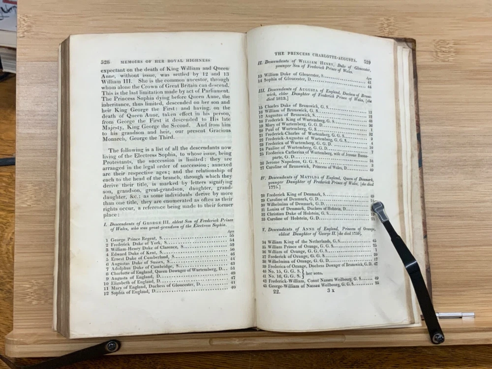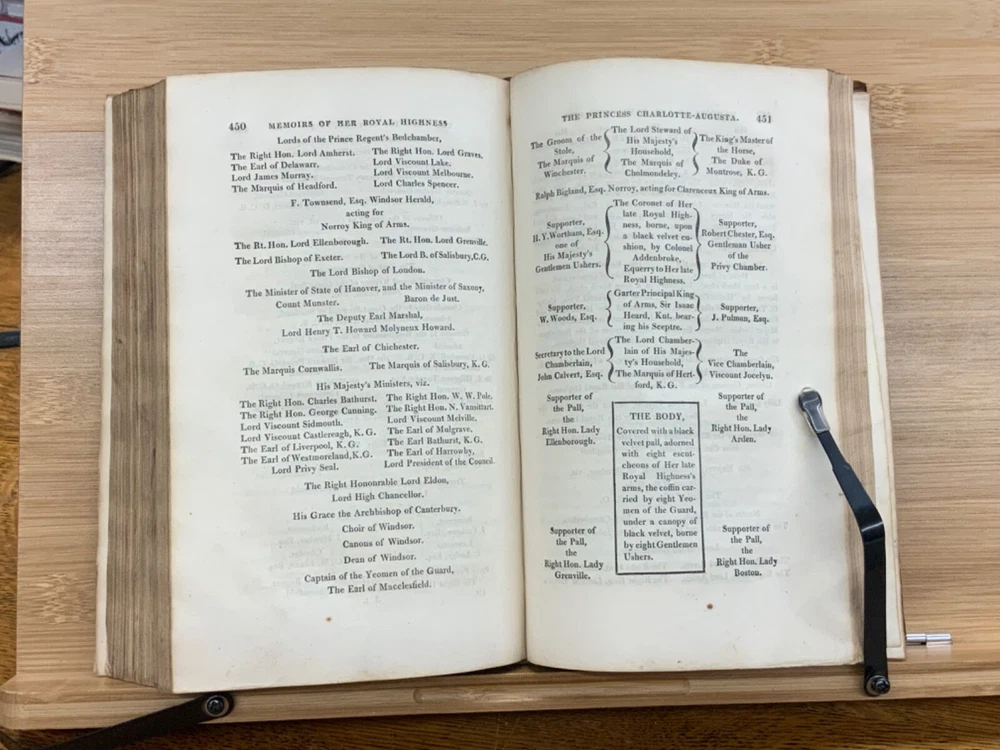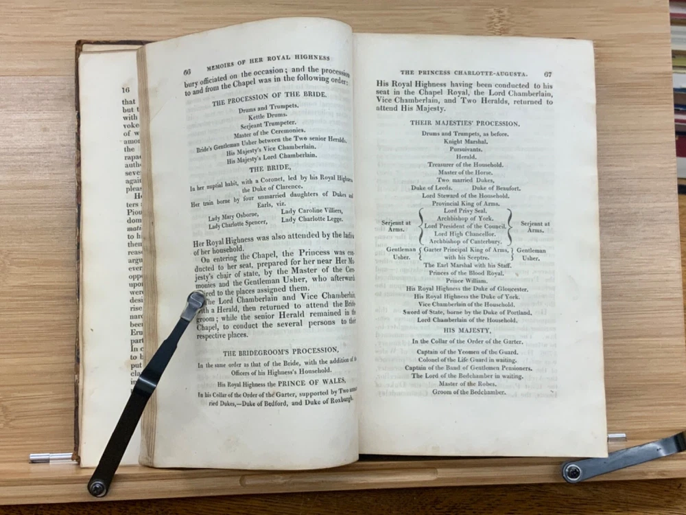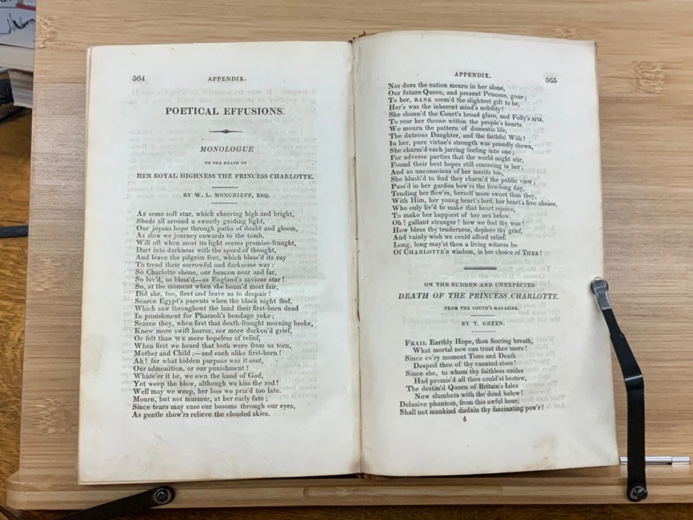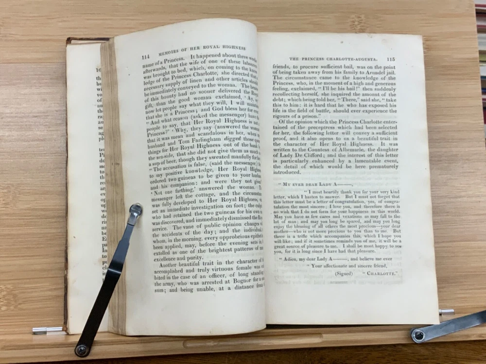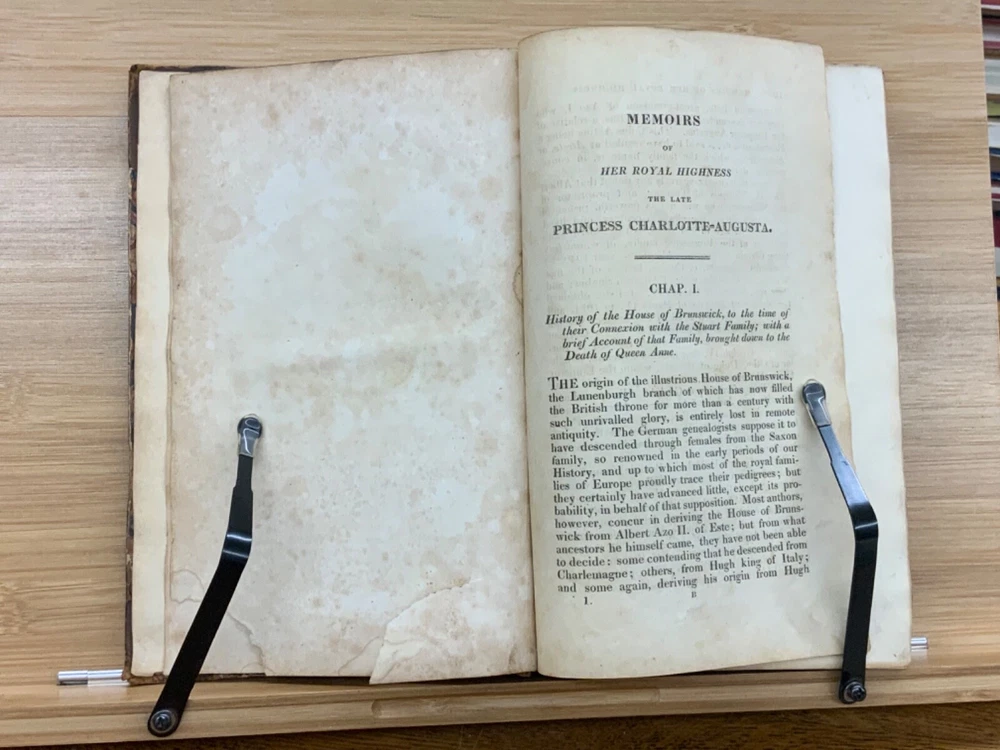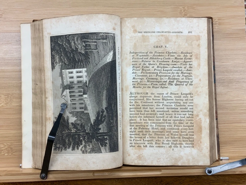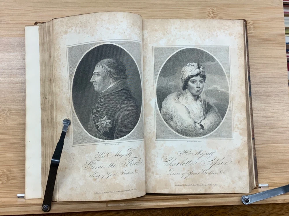 Memoirs of Her Late Royal Highness Charlotte-Augusta of Wales, and of Saxe-Cobourg; Containing an Account of Her Juvenile Years, Education, Marriage with Prince Leopold, Accouchement, Death, and Funeral. To Which is Prefixed, A Concise History of the Illustrious House of Brunswick, Brought Down To the Present Time; Shewing The Actual State of the Succession to the Throne of the United Kingdom of Great Britain. By Those Green, Esq. Easton Press: Printed by Nuttall, Fisher, and Dixon, Liverpool. 1818, 3/4 leather marbled binding, many engraved plates, 576 pp, 8.5 x 5.5", 8vo. In fair condition. Front board to viii are detached from binding. Boards are scuffed at edges & worn/bumped at corners. General scuffing to marbling on boards. Head of spine lacking - binding expose. Gilt title on spine is heavily rubbed & soiled - title illegible. Previous ownership signature on front end-page. Toning throughout text-block. Off-setting exhibited on all pages directly across from plates. All plates are present but exhibit foxing and some age-staining. Finger-soiling and ink stains found in a few instances throughout text-block. No known marginalia. Binding is intact, but fragile in some places. Please see photos. Princess Charlotte Augusta of Wales (1796-1817) was the only child of George, Prince of Wales (later George IV), and his wife, Caroline of Brunswick. She was expected to ascend the British throne after the deaths of her grandfather, George III, and her father, but died in childbirth at the age of 21, predeceasing them both. Charlotte's death set off a tremendous mourning among the British, who had seen her as a sign of hope and a contrast to both her unpopular father and mentally ill grandfather. She had been George III's only legitimate grandchild and her death prompted a succession crisis, as there was a chance the throne would pass to a distant relative. The King's aging and unmarried sons looked for wives; it was his fourth son, Prince Edward, Duke of Kent and Strathearn, who fathered the eventual heir, Victoria. This memoir of Princess Charlotte-Augusta's life was printed in February, 1818, while the princess had only died in November 1817. Possibly the first memoir of her life directly after her death. FORN-MSB-1023-0761-HK835