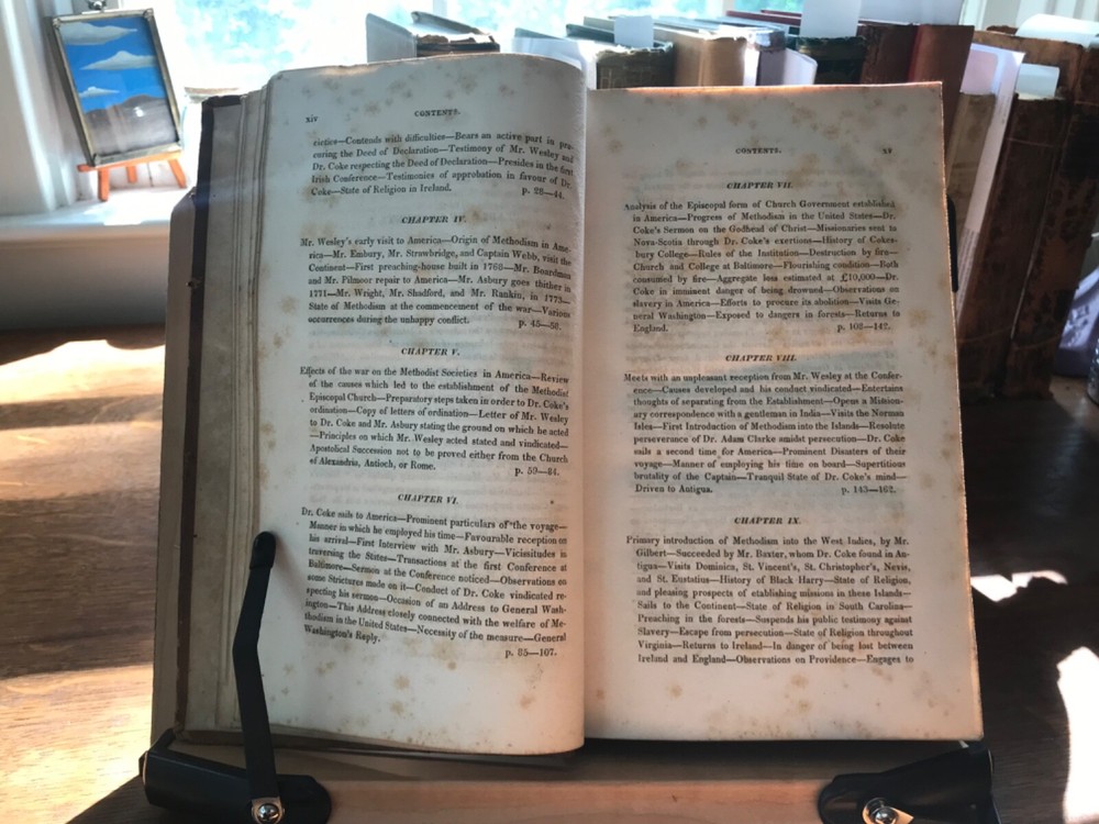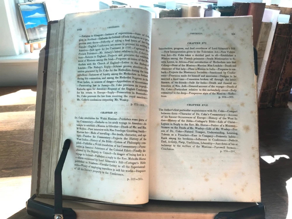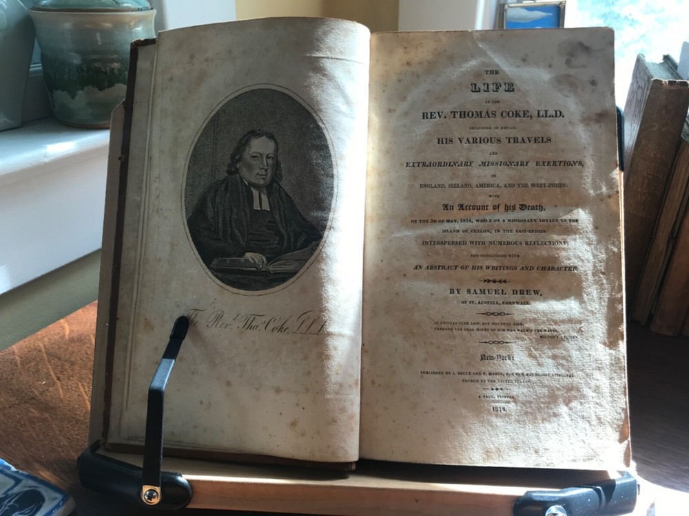 The Life of The Rev. Thomas Coke, LL.D. Including in Detail His Various Travels and Extraordinary Missionary Exertions, in England, Ireland, America and the West-Indies: With An Account of his Death, on the 3rd of Mary, 1814, While on a Missionary Voyage to the Island of Ceylon, in the East-Indies. Interspersed with Numerous Reflections; and Concluding with An Abstract of His Writings and Character, by Samuel Drew, Published by J. Soule and T. Mason, New York, A. Paul, Printer, 1818, frontis portrait of Coke, 391 pp, full leather, 9 x 5.5”, 8vo. In good condition. Light wear to extremities with minor scuffing to surface. Light peeling along edges with light abrasions to surface of leather. Corners bumped with small loss at bottom right corner of front board. Joints lightly cracked with scuffing. Spine abraded with light creasing. Original spine label intact and bright. Slight loss at head of spine. Inner hinge tender, but intact. Foxing to inner hinges and end papers. Offsetting from frontis to title. Old hand ownership dated 1829 on second fly leaf. Text is lightly age-toned with scattered foxing, heavy at times. Free of known markings or ownership. Binding remains intact. Please see photos. Thomas Coke (1747-1814) was associate of John Wesley, and participated in the founding of the Methodist Episcopal Church in America. Chapters of the book include events in America, attitudes on slavery etc. COLR1818CFGN