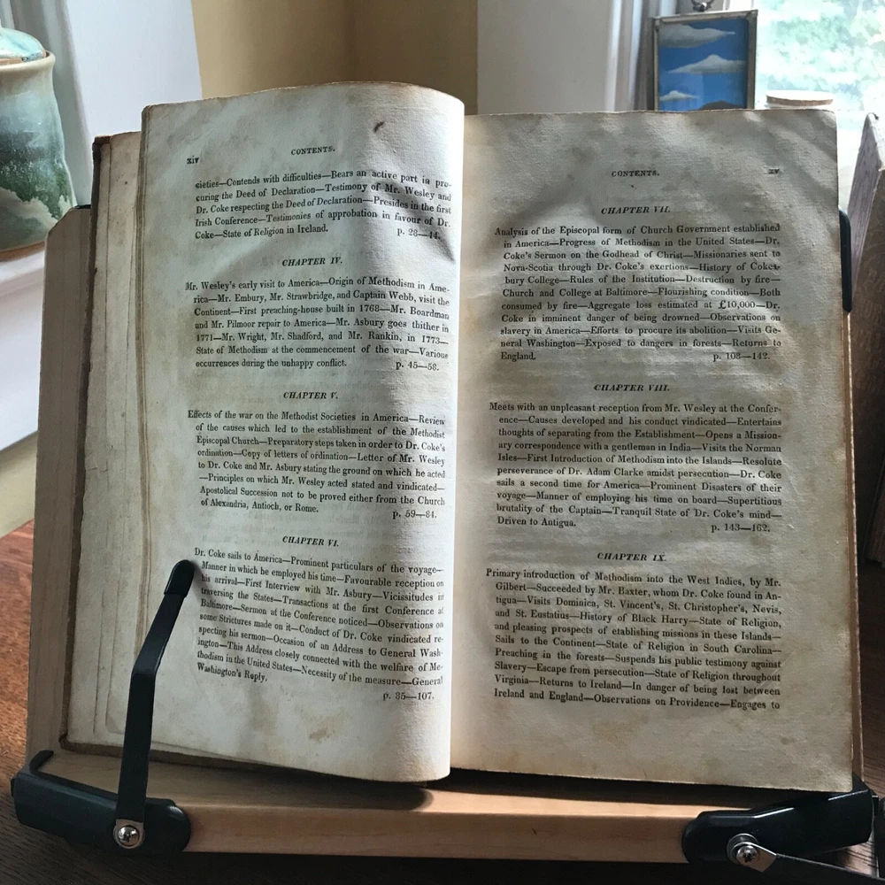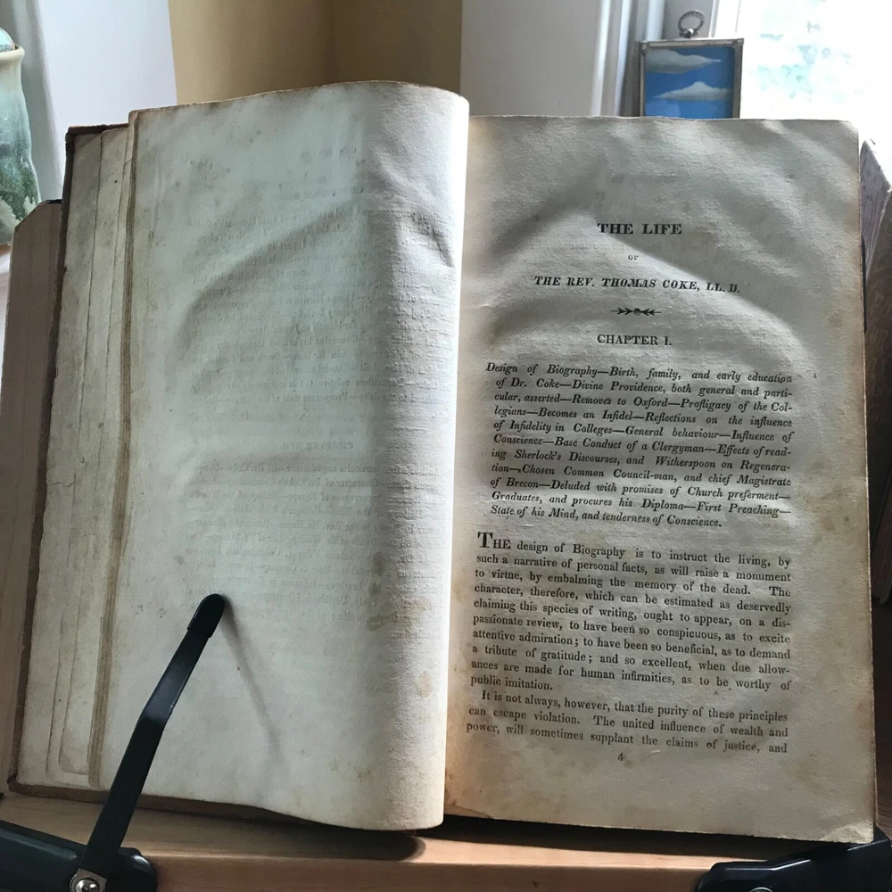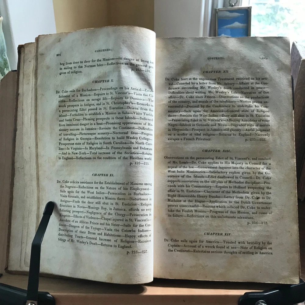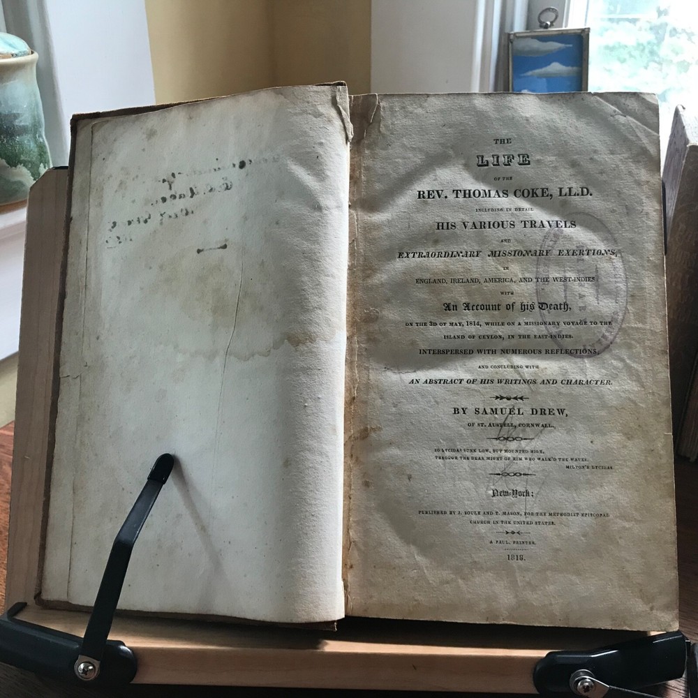 The Life of The Rev. Thomas Coke, LL.D. Including in Detail His Various Travels and Extraordinary Missionary Exertions, in England, Ireland, America and the West-Indies: With An Account of his Death, on the 3rd of Mary, 1814, While on a Missionary Voyage to the Island of Ceylon, in the East-Indies. Interspersed with Numerous Reflections; and Concluding with An Abstract of His Writings and Character, by Samuel Drew, Published by J. Soule and T. Mason, New York, A. Paul, Printer, 1818, frontis portrait of Coke, 391 pp, full leather, 9 x 5.5”, 8vo. In fair condition. Ex-library of the Library Lutheran Seminary Gettysburg. Bookplate from library on front pastedown with numerous stamps throughout. Moderate wear to extremities with scuffing to edges and corners. Scratching to surface of leather with abrasions to joints and end bands. Severe dampness staining to interior, particularly at end papers. Compliments of E.O. Wagner on second fly leaf. Light toning to interior with scattered foxing. Free of known marginalia. Binding intact. Please see photos. Thomas Coke (1747-1814) was associate of John Wesley, and participated in the founding of the Methodist Episcopal Church in America. Chapters of the book include events in America, attitudes on slavery etc. FORN-Shelf-665- COLR1818ABCN