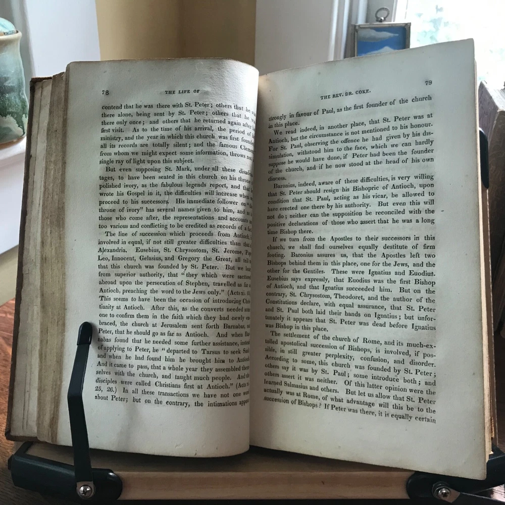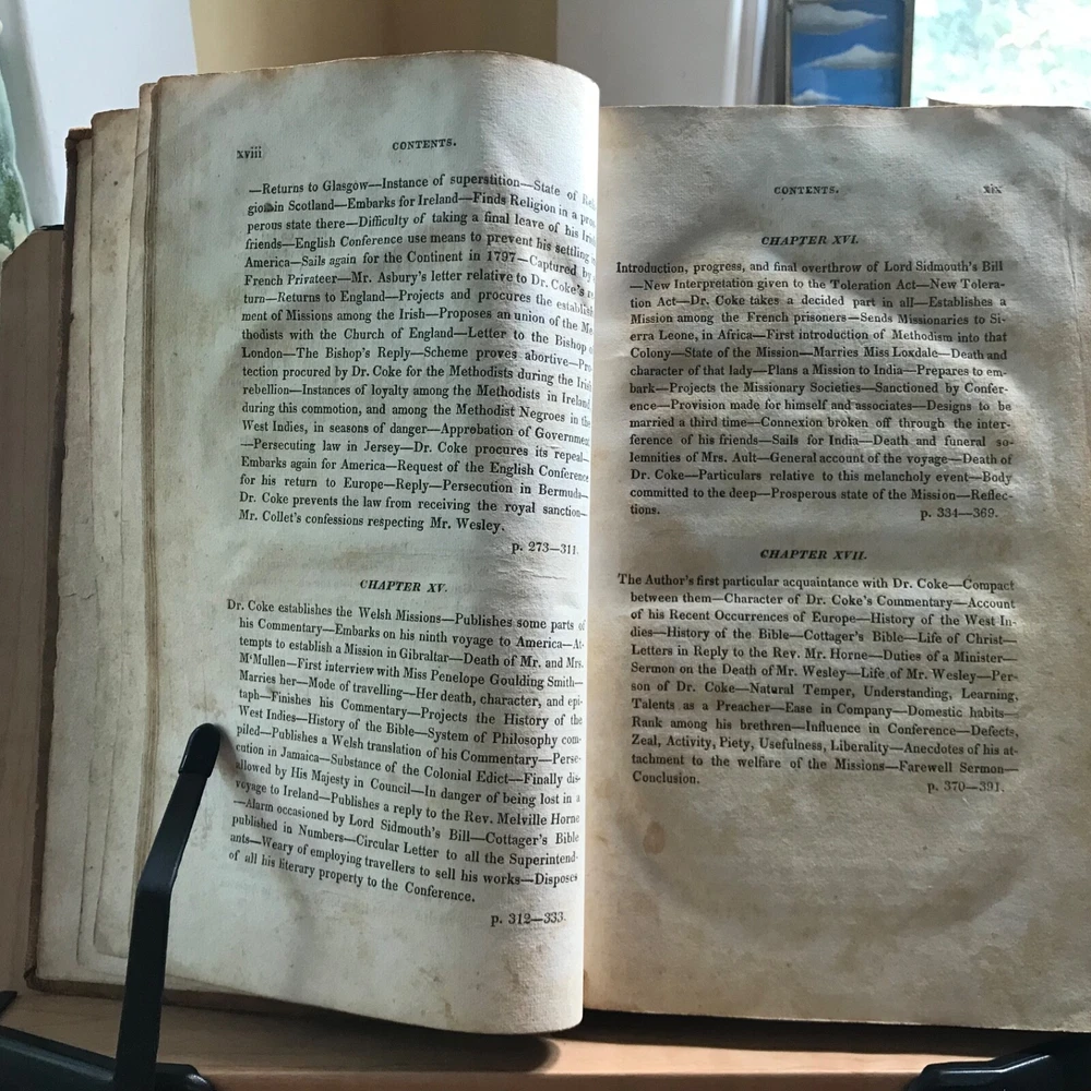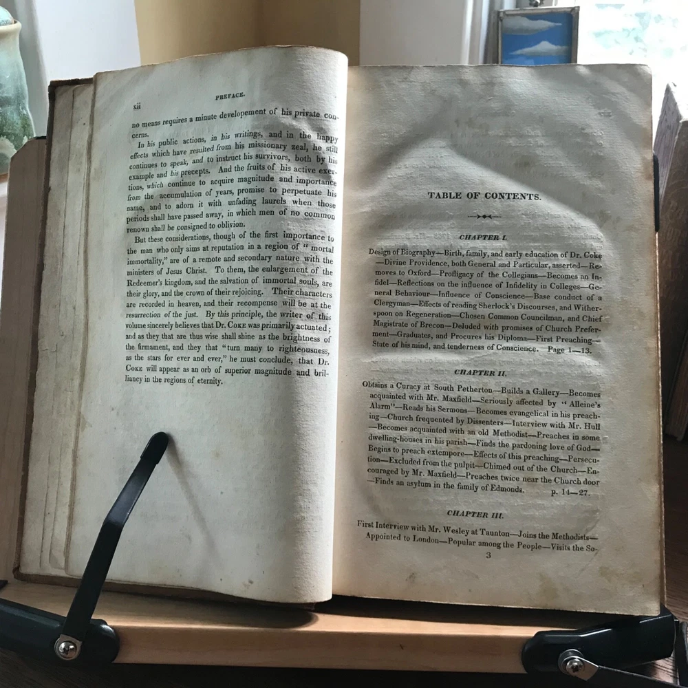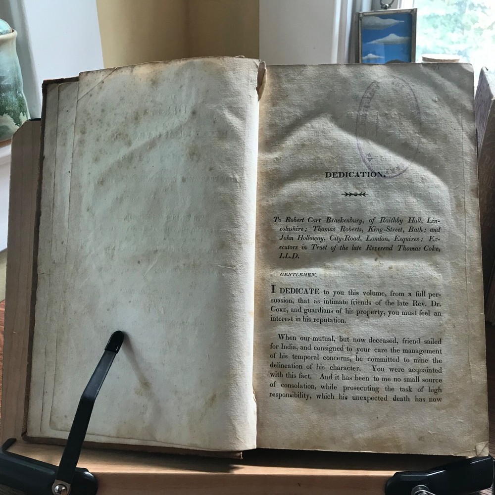 The Life of The Rev. Thomas Coke, LL.D. Including in Detail His Various Travels and Extraordinary Missionary Exertions, in England, Ireland, America and the West-Indies: With An Account of his Death, on the 3rd of Mary, 1814, While on a Missionary Voyage to the Island of Ceylon, in the East-Indies. Interspersed with Numerous Reflections; and Concluding with An Abstract of His Writings and Character, by Samuel Drew, Published by J. Soule and T. Mason, New York, A. Paul, Printer, 1818, frontis portrait of Coke, 391 pp, full leather, 9 x 5.5”, 8vo. In fair condition. Ex-library of the Library Lutheran Seminary Gettysburg. Bookplate from library on front pastedown with numerous stamps throughout. Moderate wear to extremities with scuffing to edges and corners. Scratching to surface of leather with abrasions to joints and end bands. Severe dampness staining to interior, particularly at end papers. Compliments of E.O. Wagner on second fly leaf. Light toning to interior with scattered foxing. Free of known marginalia. Binding intact. Please see photos. Thomas Coke (1747-1814) was associate of John Wesley, and participated in the founding of the Methodist Episcopal Church in America. Chapters of the book include events in America, attitudes on slavery etc. FORN-Shelf-665- COLR1818ABCN