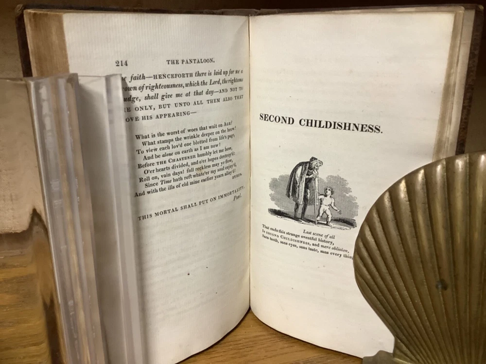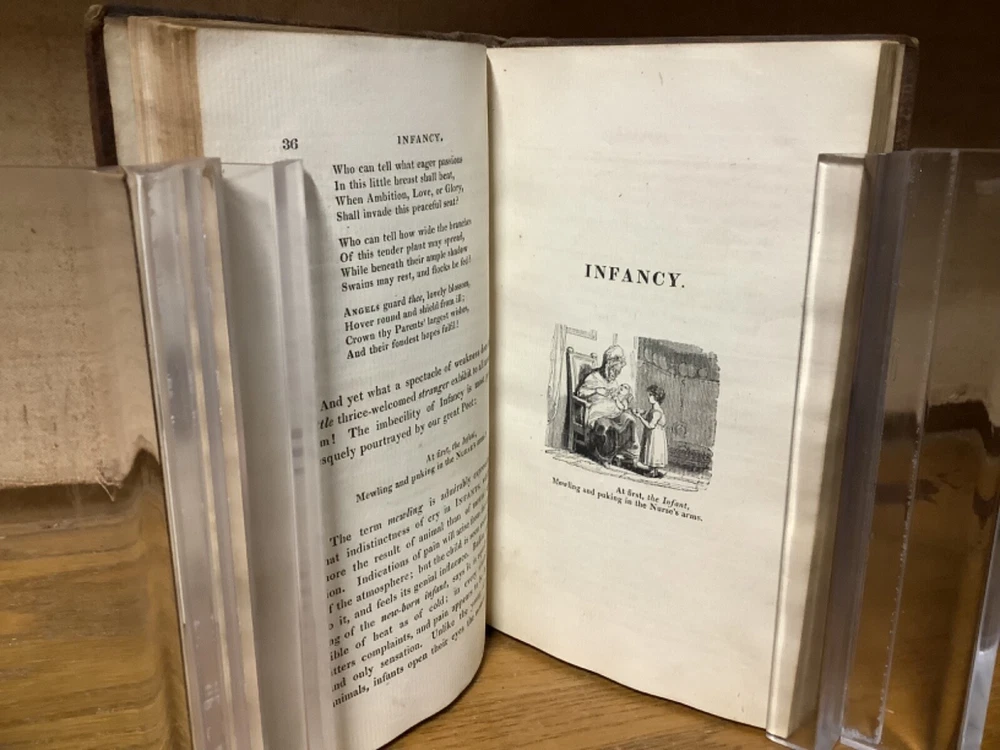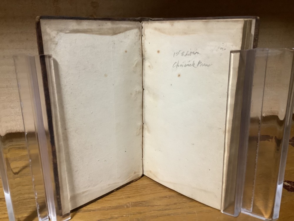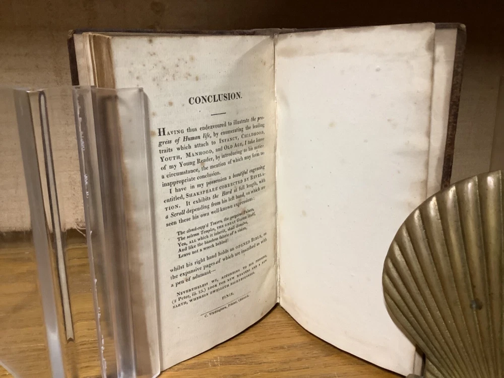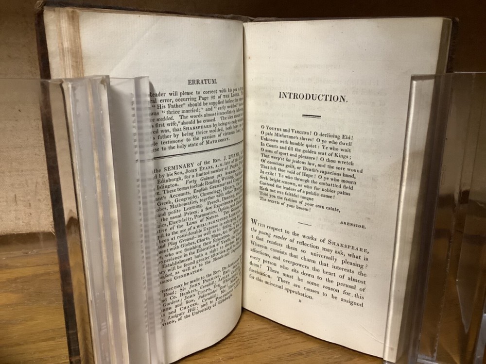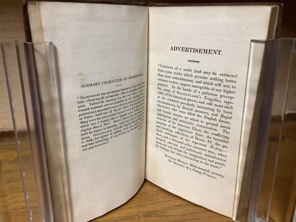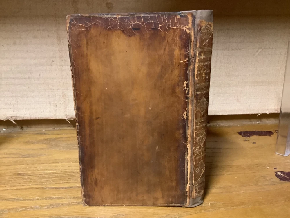 The Progress of Human Life: Shakespeare’s Seven Ages of Man; Illustrated by a Series of Extracts in Prose and Poetry. For the Use of Schools and Families: With a View to the Improvement of the Rising Generation. Introduced by a Brief Memoir of Shakespeare and His Writings. By John Evans and printed in Chiswick by Charles Whittingham. 1818, 252 pp, 7” x 4.75”, 8vo, hardcover rebaked full leather. In good rebacked condition, with the spine rebound in cloth underneath leather. Light rubbing and wear to boards, primarily along edges and corners. Some loss of original leather to head and heel of spine. Hinges remain in good condition. At least one known instances of pages being rebound in the wrong order, with some errors between pages 35 and 45. Small black-and-white sketches at th start of each part of life. General age-related toning to pages, along with periodic foxing and wear. Please see photographs and ask any questions prior to purchasing. A scarce piece intended for younger readers. Nicely rebound into a good reading copy. COLL1818ABCB-0324-aj1354