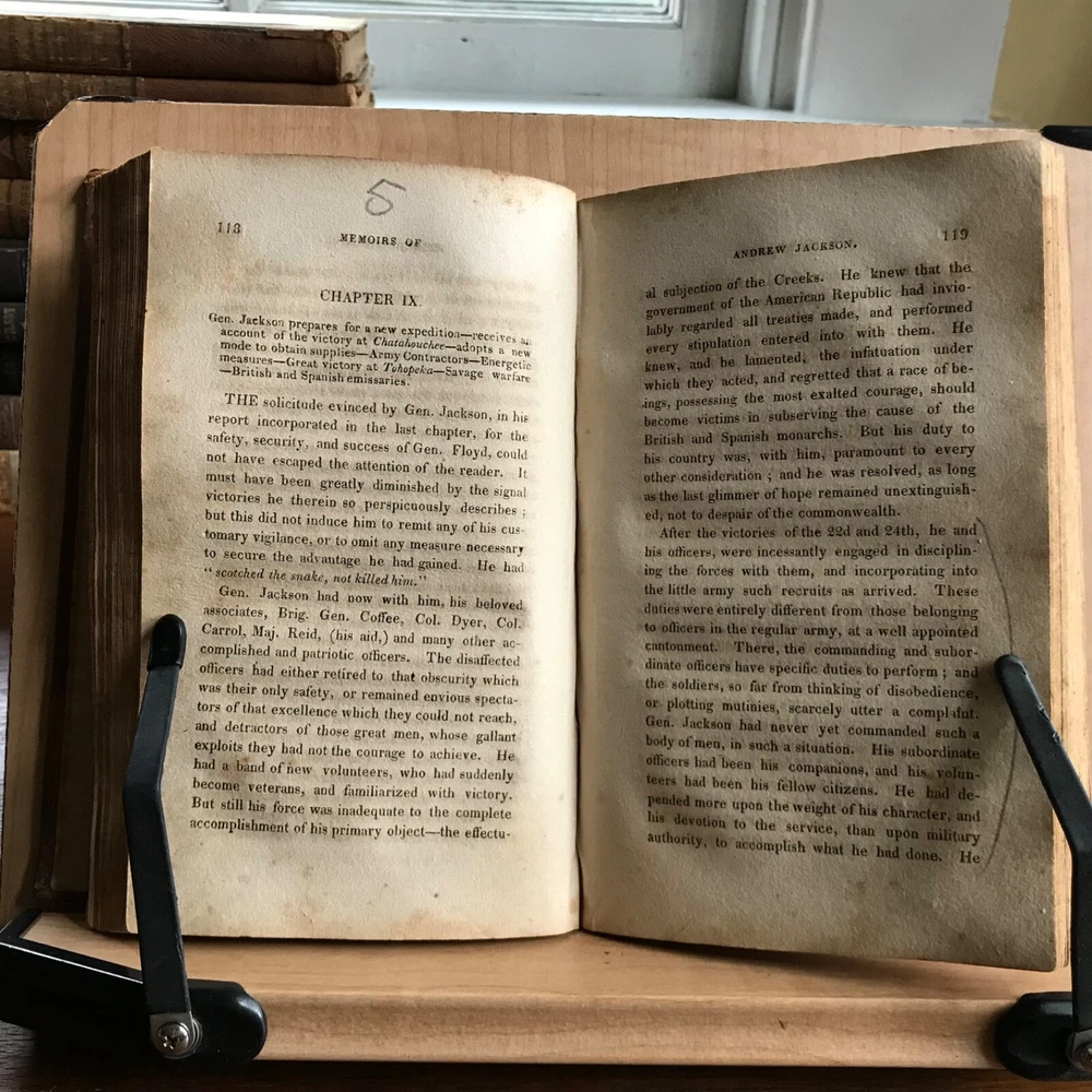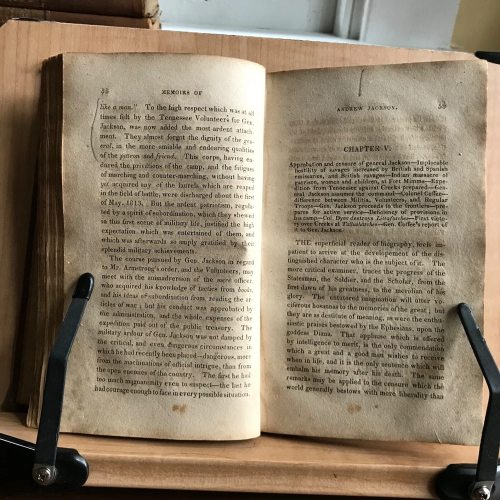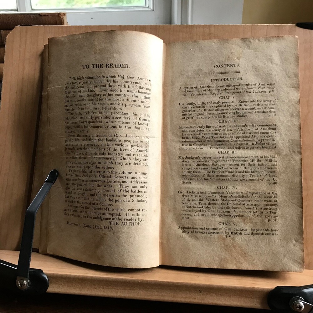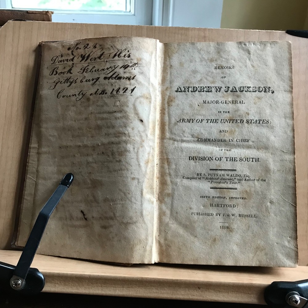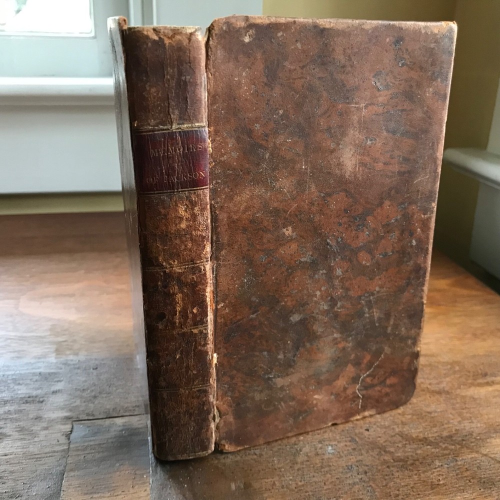 Memoirs of Andrew Jackson, Major-General in the Army of the United States; and Commander in Chief of the Division of the South, S. Putnam Waldo, Fifth Edition, Improved, Published by J. & W. Russell, Hartford, 1819, 336 pp, full leather, 7 x 4.5”, 12mo. In fair condition. Lacking frontispiece. Front board is nearly detached and hanging on by the cords. Moderate wear to extremities with scuffing to corners and end bands. Joints tender. Scuffed in appearance, however leather remains rich in color. Old hand notations on front fly leaf and title page. Interior slightly soiled with moderate foxing and toning. Free of known marginalia. Binding remains intact. End papers soiled. Please see photos. COLU1819BDHN FORN0756 HKVAR1223