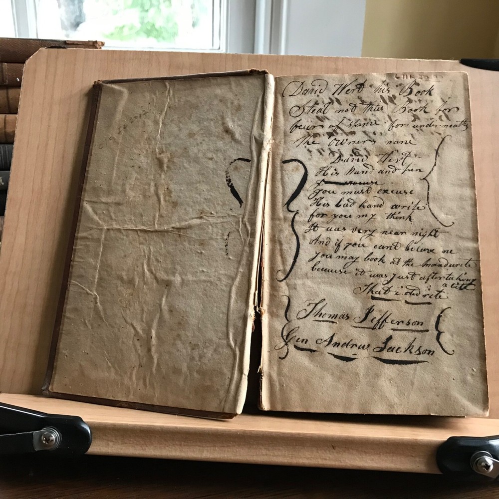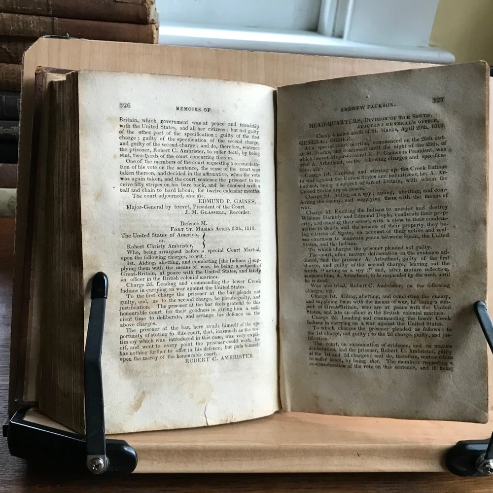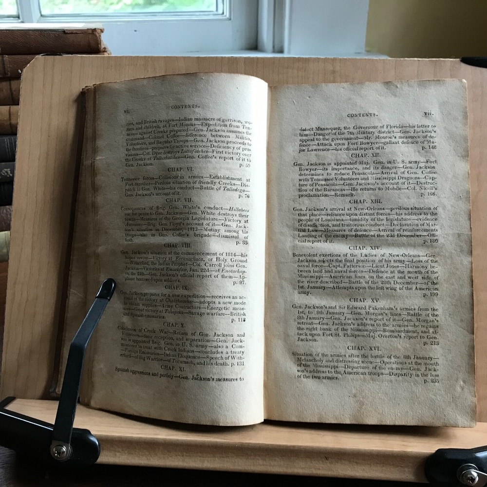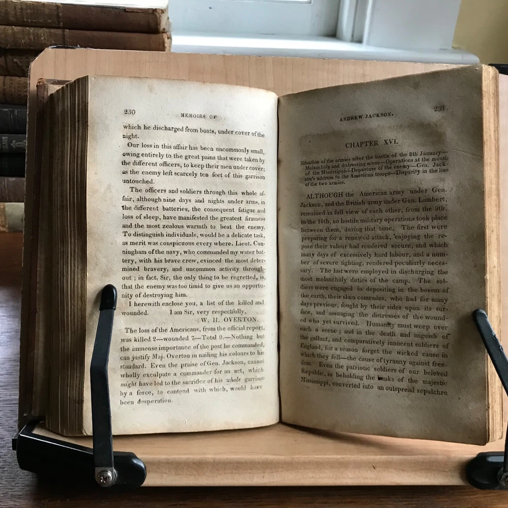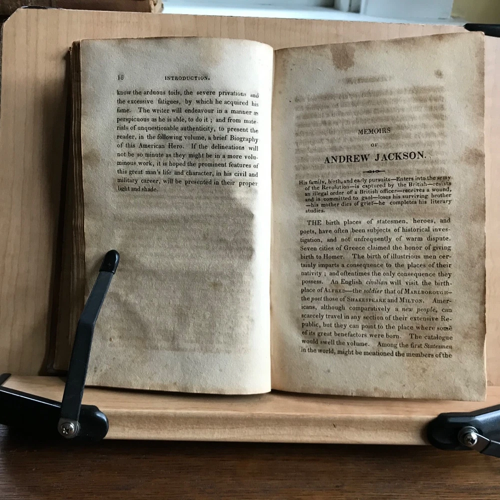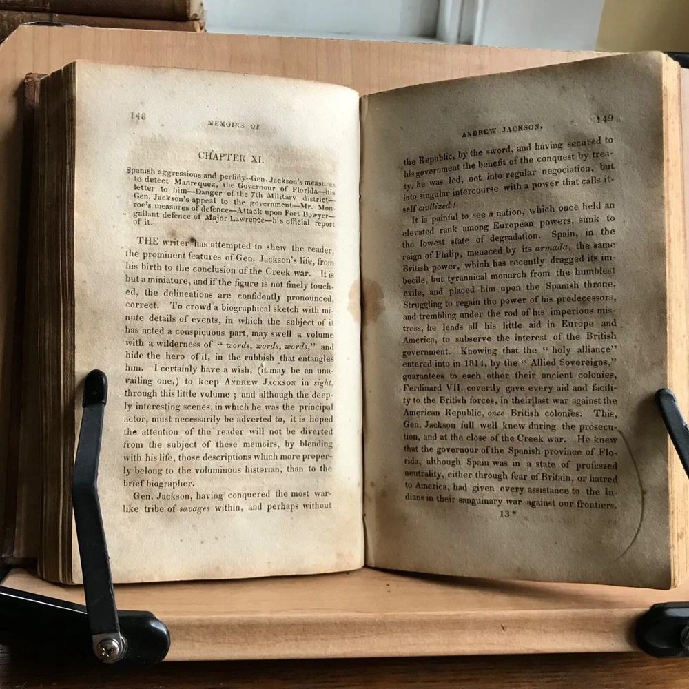 Memoirs of Andrew Jackson, Major-General in the Army of the United States; and Commander in Chief of the Division of the South, S. Putnam Waldo, Fifth Edition, Improved, Published by J. & W. Russell, Hartford, 1819, 336 pp, full leather, 7 x 4.5”, 12mo. In fair condition. Lacking frontispiece. Front board is nearly detached and hanging on by the cords. Moderate wear to extremities with scuffing to corners and end bands. Joints tender. Scuffed in appearance, however leather remains rich in color. Old hand notations on front fly leaf and title page. Interior slightly soiled with moderate foxing and toning. Free of known marginalia. Binding remains intact. End papers soiled. Please see photos. COLU1819BDHN FORN0756 HKVAR1223