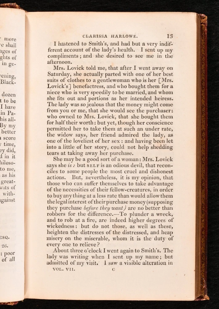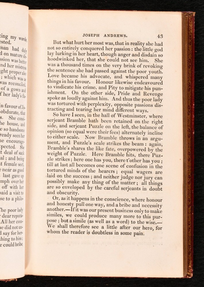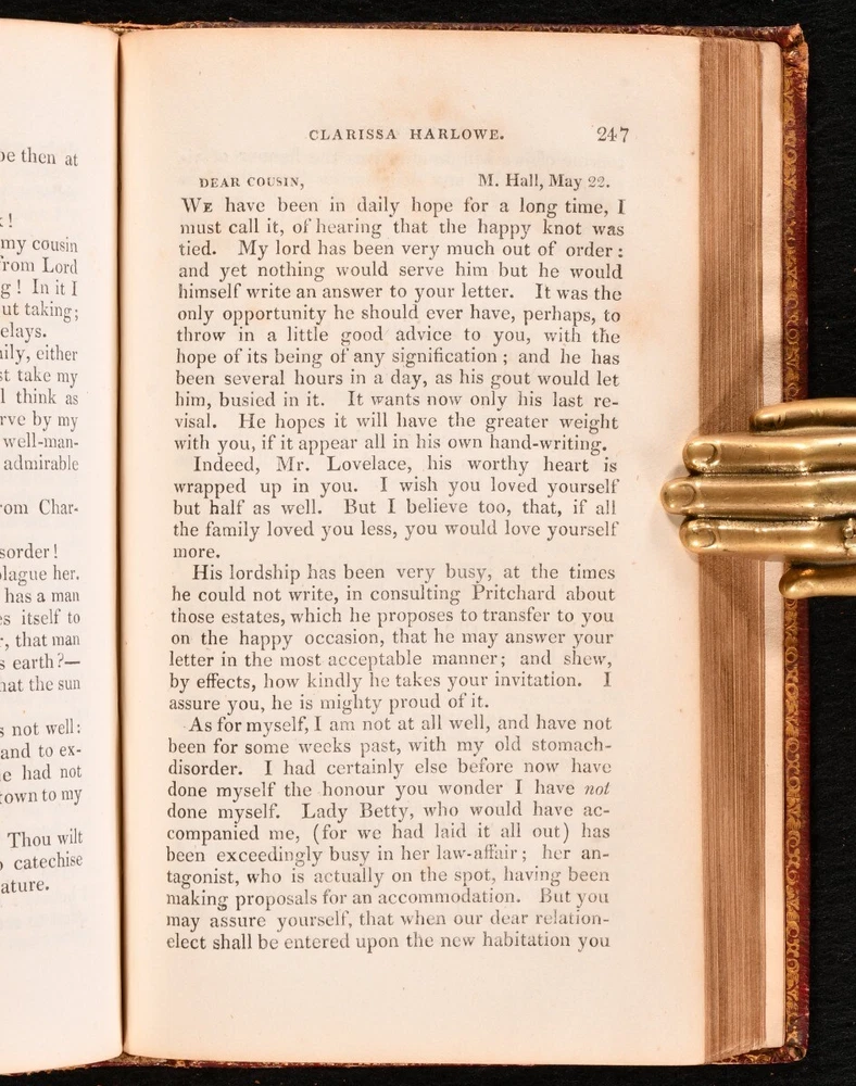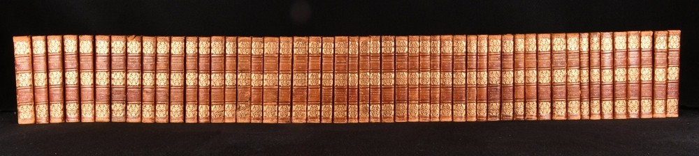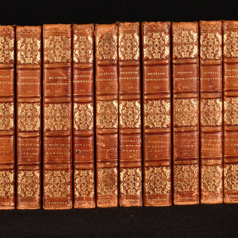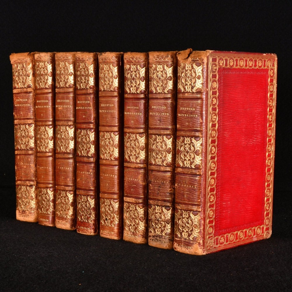Click here to see our other books! The British Novelists; with an Essay and Prefaces Biographical and Critical ed. Mrs. Barbauld 1820 F. C. and J. Rivington; W. Lowndes et al. : London 7" by 4" SUMMARY A gorgeous collection of British novels from the seventeenth and early eighteenth century, comprising such writers as Maria Edgeworth, Fanny Burney, Samuel Johnson and Daniel Defoe. Bound in contemporary full leather with lovely gilt detail. Leather Binding Overall Condition: Good This book weighs 30 KG when packed UK Postage: £ 4.49 US Postage: £ 99.99 EU Postage : £ 49.99 European Postage: £ 99.99 Asia Postage: £ 187.99 Worldwide Postage: £ 276.99 DESCRIPTION A scarce, complete collection in fifty volumes. This is a new edition, bound in delightful contemporary full straight grain morocco, with tooled gilt detail to the spine and borders. Edited by Anna Letitia Barbauld. Barbauld was a prominent poet and children's author, known for being amongst the first writers to consider children as an audience, publishing 'Lessons for Children' and 'Hymns in Prose for Children'. Forgotten by history due to Romantic poets such as Wordsworth and Coleridge shunning her works in their Conservative years, she has recently seen a revival in interest, with feminist literary critics turning their attention to her writings. Acquired from the library of Audrey Pleydell-Bouverie, an English socialite and the illegitimate granddaughter of King Edward VII. She was featured by Cecil Beaton in 'The Book of Beauty'. Amongst her circle were Elizabeth Bowes-Lyon, Coco Chanel, Salvador Dali, Winston and Clementine Churchill and Nancy Mitford. Ownership bookplate of James Farrer to the front pastedown of each volume. Comprising: 'Clarissa; or, the History of a Young Lady' by Samuel Richardson, complete in eight volumes. 'The History of Sir Charles Grandison, in a series of Letters' by Samuel Richardson, complete in seven volumes. 'The Life and Surprising Adventures of Robinson Crusoe' by Daniel Defoe, complete in two volumes. 'The History of the Adventures of Joseph Andrews, and his friend Mr. Abraham Adams' by Henry Fielding, complete in a single volume. 'The History of Tom Jones, a Foundling' by Henry Fielding, complete in three volumes. 'The Old English Baron: a Gothic Story' and 'The Castle of Otranto: a Gothic Story' by Horance Walpole. 'History of Pompey the Little' by Mr. Coventry and 'The Vicar of Wakefield' by Dr. Goldsmith. 'The Female Quixote; or, the Adventures of Arabella' by Mrs. Lennox, complete in two volumes. 'The History of Rasselas' by Samuel Johnson, and 'Almoran and Hamet' by Dr. Hawkesworth. 'The History of Lady Julia Mandeville' and 'Nature and Art' by Mrs. Inchbald. 'A Simple Story' by Mrs. Inchbald. 'The Man of Feeling' and 'Julida de Roubigne' by Henry Mackenzie. 'The Expedition of Humphry Clinker' by Tobias Smollett in two volumes. 'The Spiritual Quixote' by Richard Graves, in two volumes. 'Zeluco' by Dr. Moore in two volumes. 'The Old Manor House' by Charlotte Smith in two volumes. 'Evelina; or the History of a Young Lady's Introduction to the World' by Fanny Burney in two volumes. 'Cecelia; or, Memoirs of an Heiress' by Fanny Burney in three volumes. 'The Romance of the Forest' by Ann Radcliffe in two volumes. 'The Mysteries of Udolpho, a Romance' by Ann Radcliffe in three volumes. 'Man as he is not; or, Hermsprong' by Robert Bage. 'Belinda' by Maria Edgeworth, in two volumes. Collated, complete. A delightful library set comprising British novels of the eighteenth and early nineteenth centuries. CONDITION In a full straight grain morocco binding. Externally a trifle worn: rubbing to the heads and tails of the spines and extremities of all volumes. Particular wear to the head of volume 8, some loss to the spine of volume 16 exposing the binding, and a little wear to the front joints of volumes 34 and 40. Loss to the lower corner of the front board of volume 48. A mark to the front board of volume 7, which also affects the spine. Some small marks to the front board of volumes 10, 28, 34 resulting in loss to the leather. Ownership bookplate to the front pastedown of each volume (occasionally upside down to the rear pastedown). Internally, generally firmly bound. Front endpaper is loose but present to volume I. Front hinge has failed to volume I, and has nearly failed to volume 16 after the front endpaper, but is secure at the top. Otherwise, volumes are firmly bound, bar the odd slightest strain to the hinges. Pages are a little spotted, particularly to the first and final leaves. A few pencil marks to the title page of volume 27 and a crossed out pencil inscription to the rear blank of volume 34. Slight tidemarks to the first and final leaves of volumes 33 and 43. Pencil inscription relating to the reader's opinion of the work on the final leave of volume 46 and blanks of 47. Overall Condition: Good GLOSSARY OF TERMS Overall Condition (Dustwrapper condition rating is shown after that for the book itself, where a dustwrapper is present) Fine - Very well preserved copy showing very little wear Very Good Indeed - Only one or two minor faults, really a very attractive copy Very Good - Quite a wide term meaning no major faults but probably several smaller ones often expected given the age of the book, but still a respectable copy Good - Meaning not very good. Some more serious faults as will be described in the condition report under 'condition' Good Only - Meaning one or more faults that could really do with repair Fair - As with good only above but with other faults leaving a compromised copy even after repair Poor - Really bad and possibly seriously incomplete. We only sell books in this condition where their rarity or value makes them attractive none the less. Major defects will be described. GUARANTEE We offer a full money back guarantee on our descriptions. Please ask for details and conditions. We prefer PAYPAL. If you pay via PAYPAL we will post the item off the same or the next wor