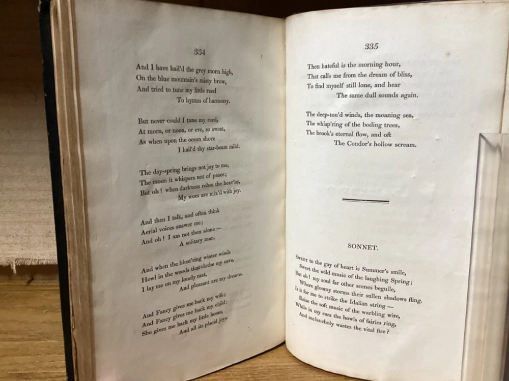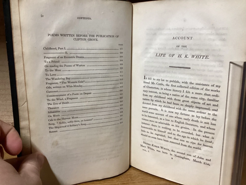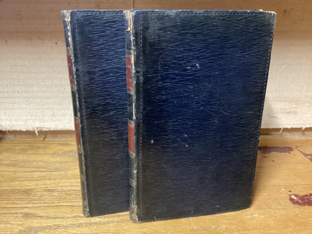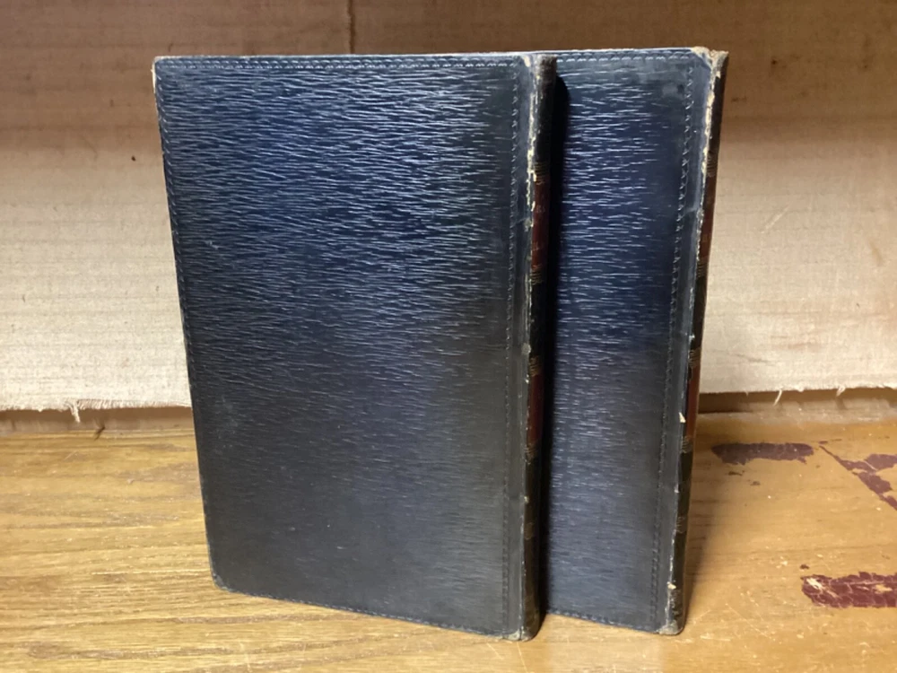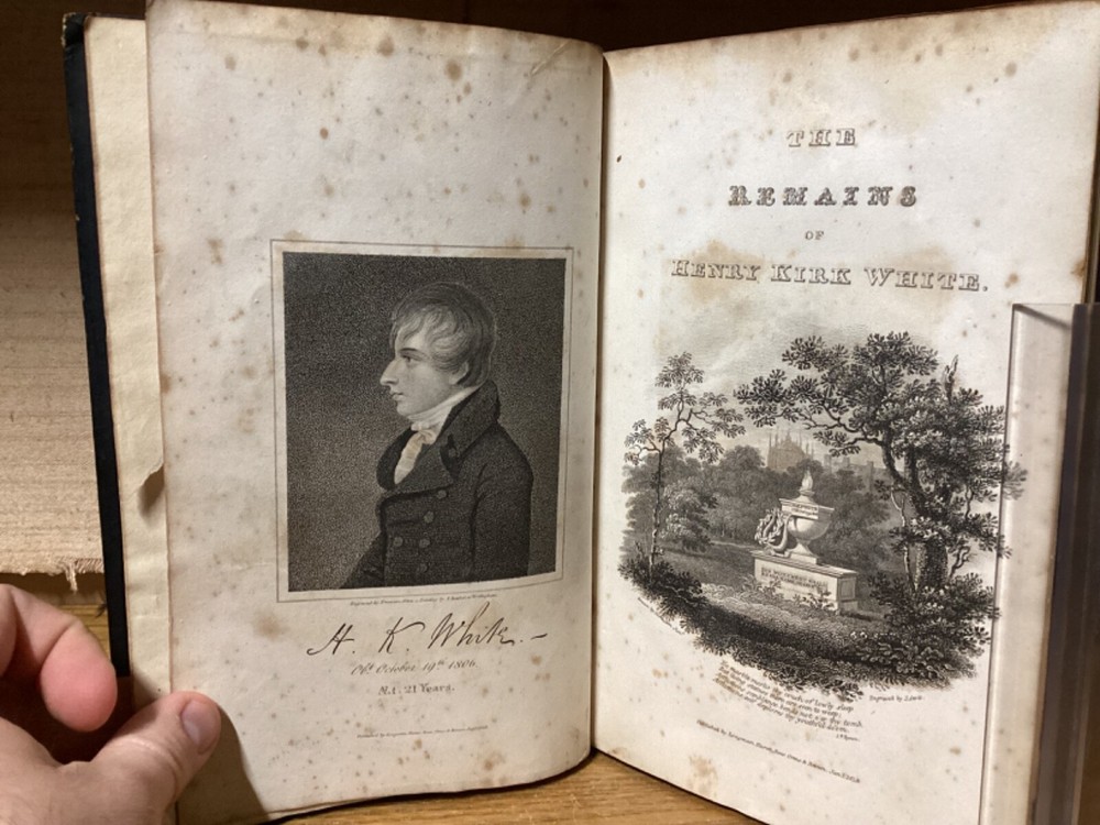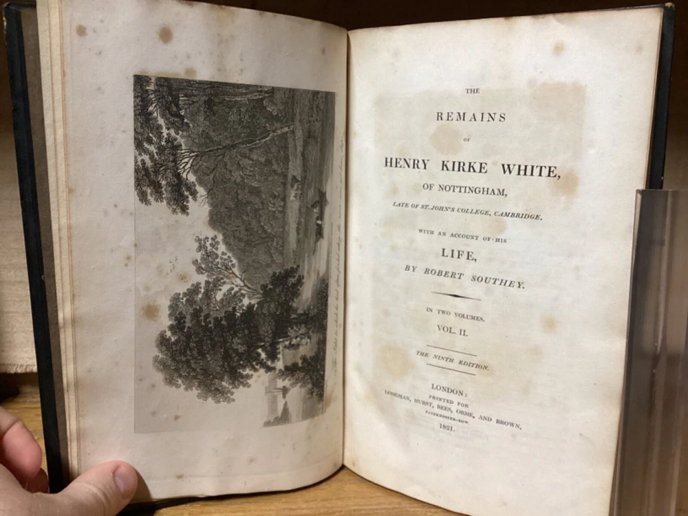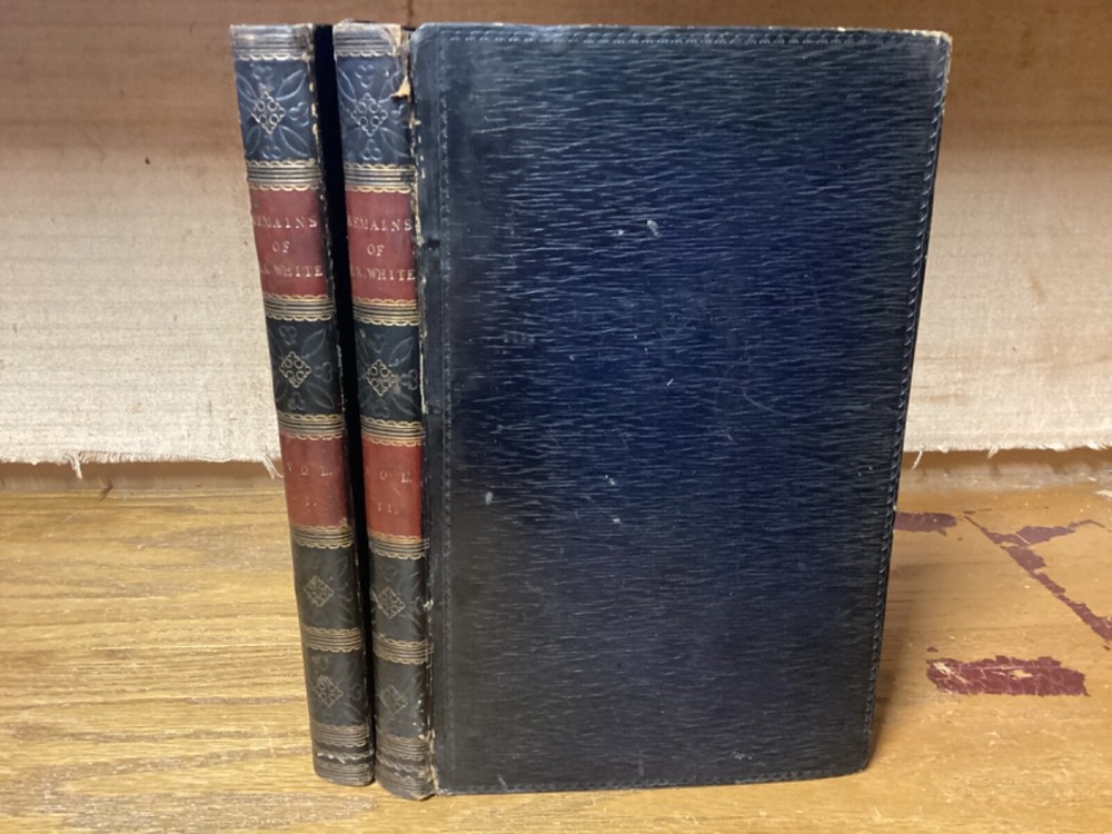 The Remains of Henry Kirke White, of Nottingham, Late of St. John’s College, Cambridge: With an Account of His Life, by Robert Southey. The Ninth Edition. Printed in London for Longman, Hurst, Rees, Orme, and Brown. 1821. In two volumes. 336 and 316 pp. 8.5” x 5.5”. 8vo. Hardcover black full leather. Overall good, with light scuffing and wear to boards, primarily along edges and corners. Some bumping and wear to binding at head and heel of spine. Cracking to front hinge of Volume I, with lesser wear to remaining hinges. Bookplates to front pastedowns. Frontispiece illustrations adjacent to both title pages. General age-related toning to pages, along with periodic foxing and wear. Please see photographs and ask any questions prior to purchasing. A scarce and attractively-bound set on the life, works, and correspondence of Henry Kirke White (1785-1806). An English poet and hymn writer, White’s career was tragically cut short at the age of 21, following a bout of consumption that was worsened by excessive work. COLL1821ADGP