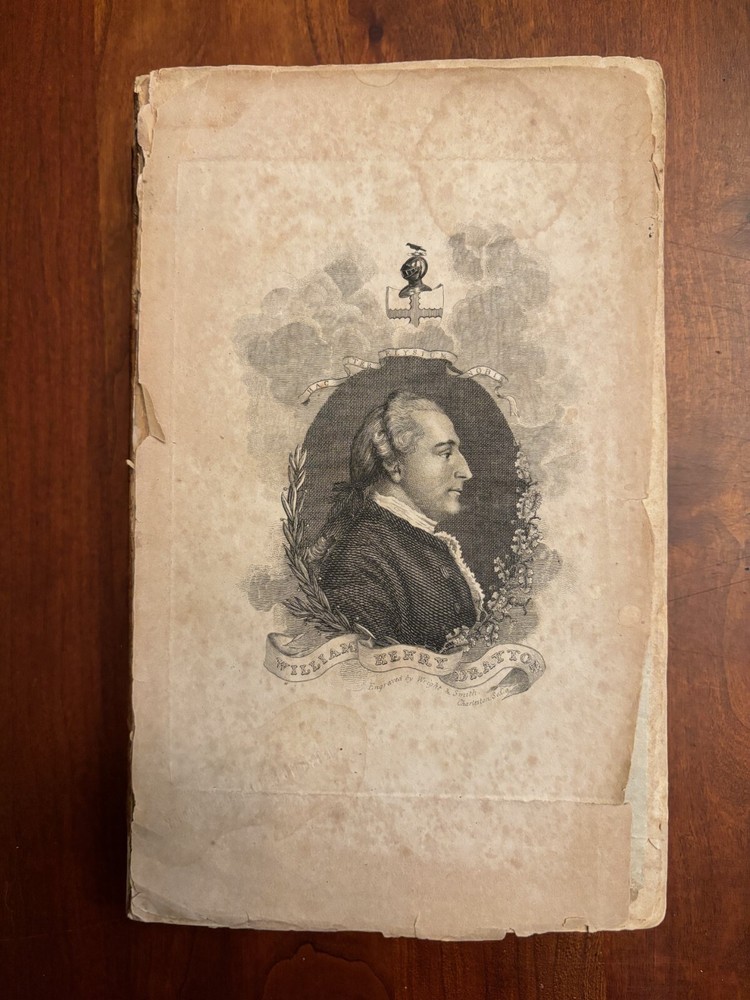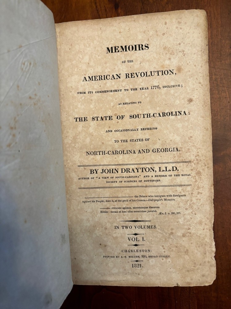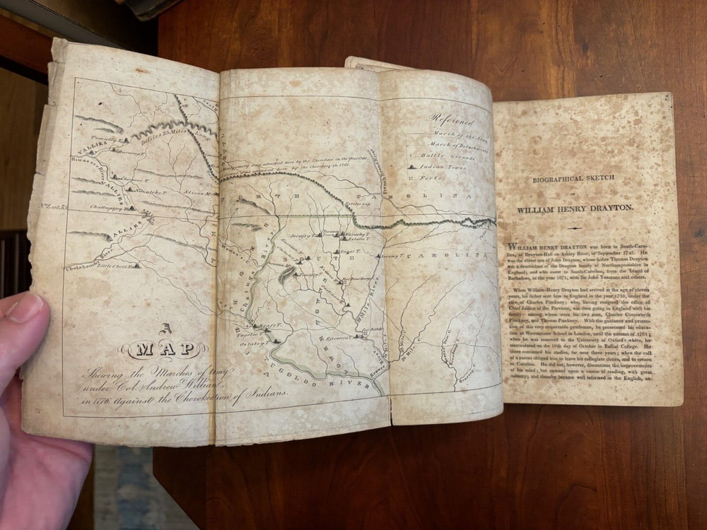 Memoirs of the American Revolution, from its Commencement to the year 1776, inclusive; as relating to the State of South Carolina: and occasionally referring to the States of North-Carolina and Georgia. Volume I only. By John Drayton Published: A. E. Miller, Charleston, 1821. FIRST EDITION. Volume I only (of a Two-Volume Set). 1st edition. Full leather, front board absent, spine faded and dry, ffep missing, frontis portrait of William Henry Drayton is present, along with the folding map of Williamson’s marches against Cherokee Indians, 5,25" x 8.25”, 430 pp + biographical sketch of William Henry Drayton i-xxvii pp, paper foxed but otherwise VG, needs rebinding, A basic source for the history of the American Revolution in the southern colonies, based largely on material the author inherited from his father, William Henry Drayton, who was an active leader of the Revolution. The author served twice as governor of South Carolina, and was deeply interested in its history from an early age. This history of the early stages of the Revolution in South Carolina was the product of his retirement, and was published a year before his death. It remains one of the standard works. Howes D491, "aa"; Gephart 4764; Sabin 20914. An incredibly SCARCE American Revolutionary history! I've done my best to describe the book, but if you have additional questions, please don't hesitate to send me an e-mail.