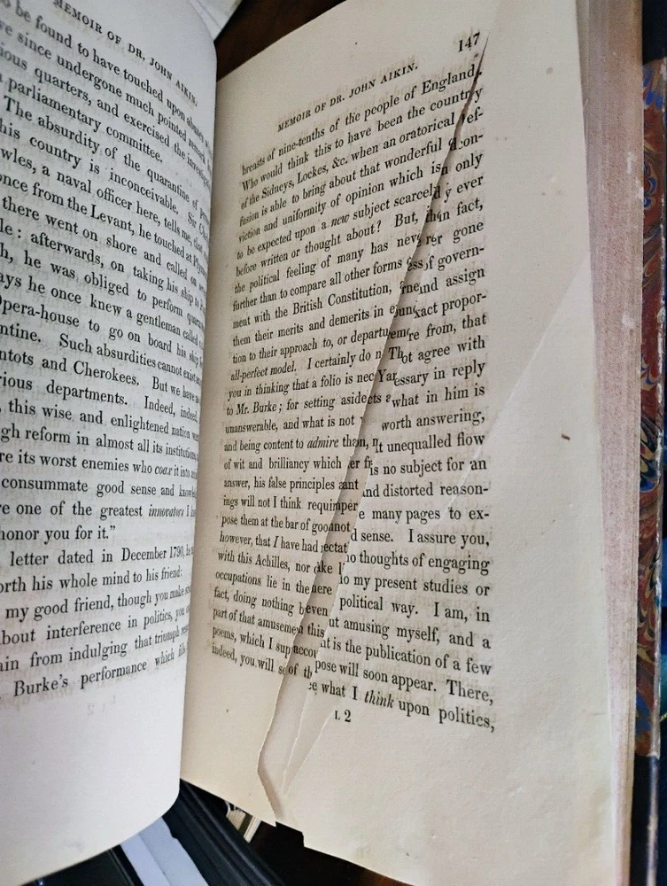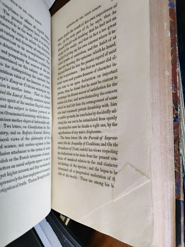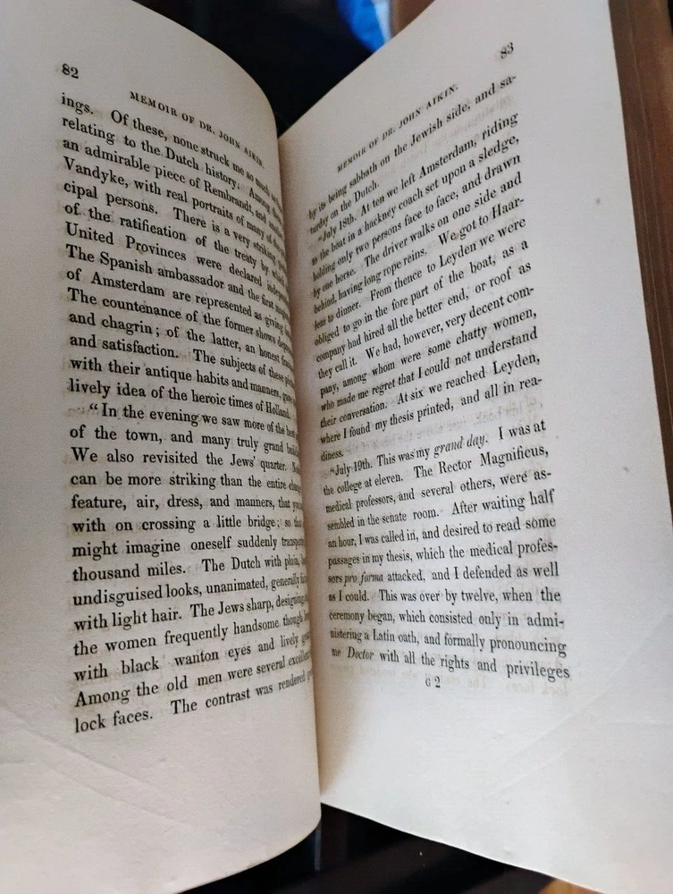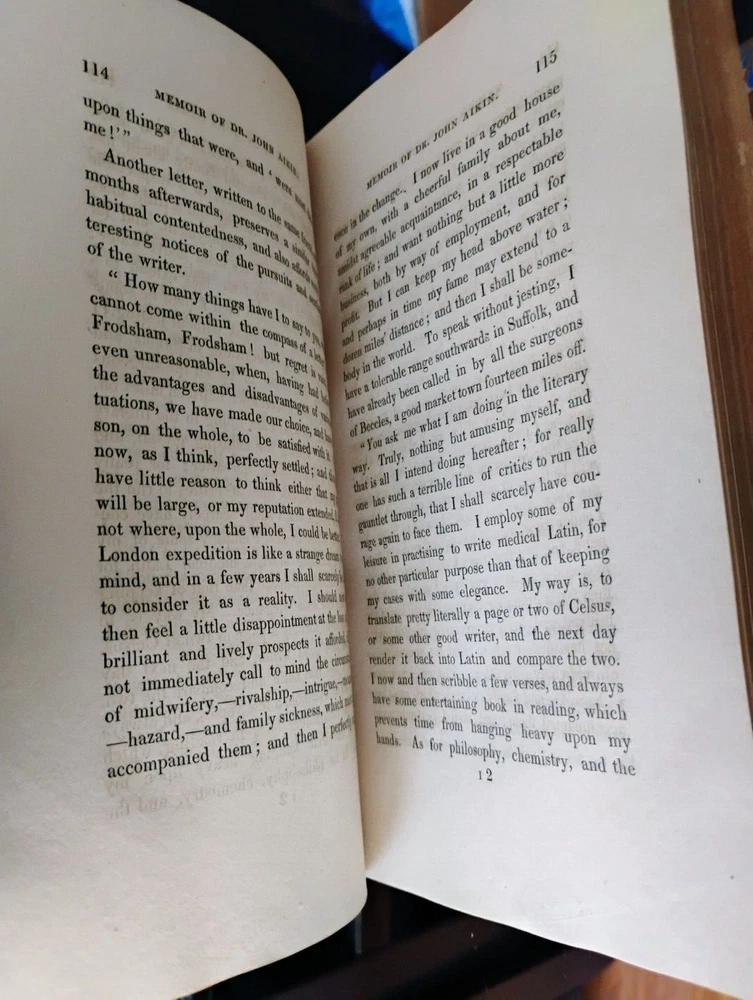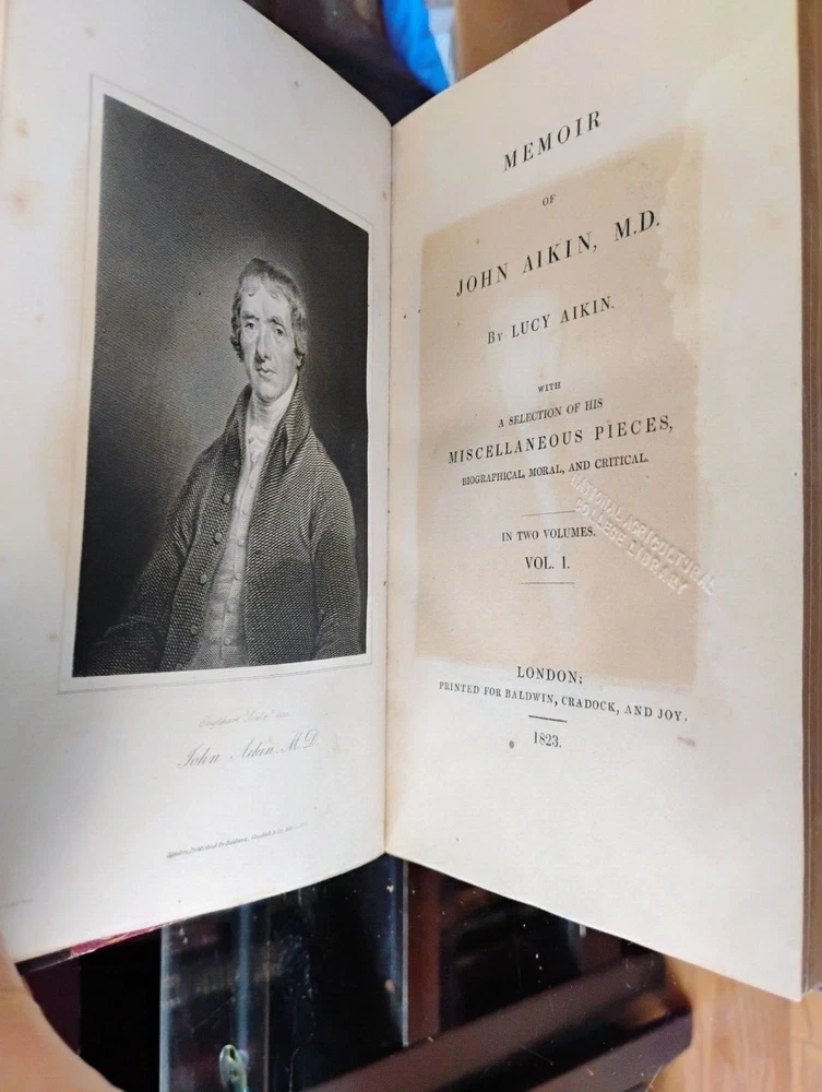Memoir Of John Aikin, M.D. Lucy Aikin 1823 3/4 leather binding, marbled boards, ex- lib marking on spine, marbled pastedown/ FFEP, bookplate on pastedown, embossment on title page, one page has a rip, lib pocket to rear pastedown. Otherwise internally clean and bright. Please let me know if you have any questions. Please let me know if you have any questions. Expanding to Ebay in 2022. Shipping with be with USPS Media Mail to keep costs down. I can ship with different methods if requested. 30 day returns.