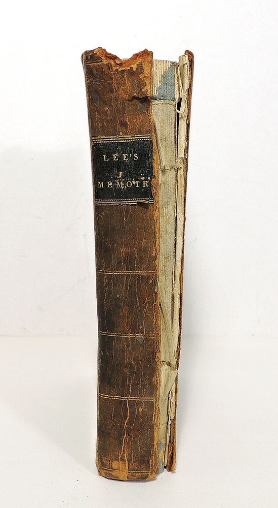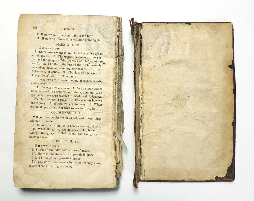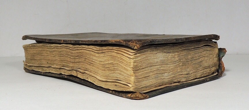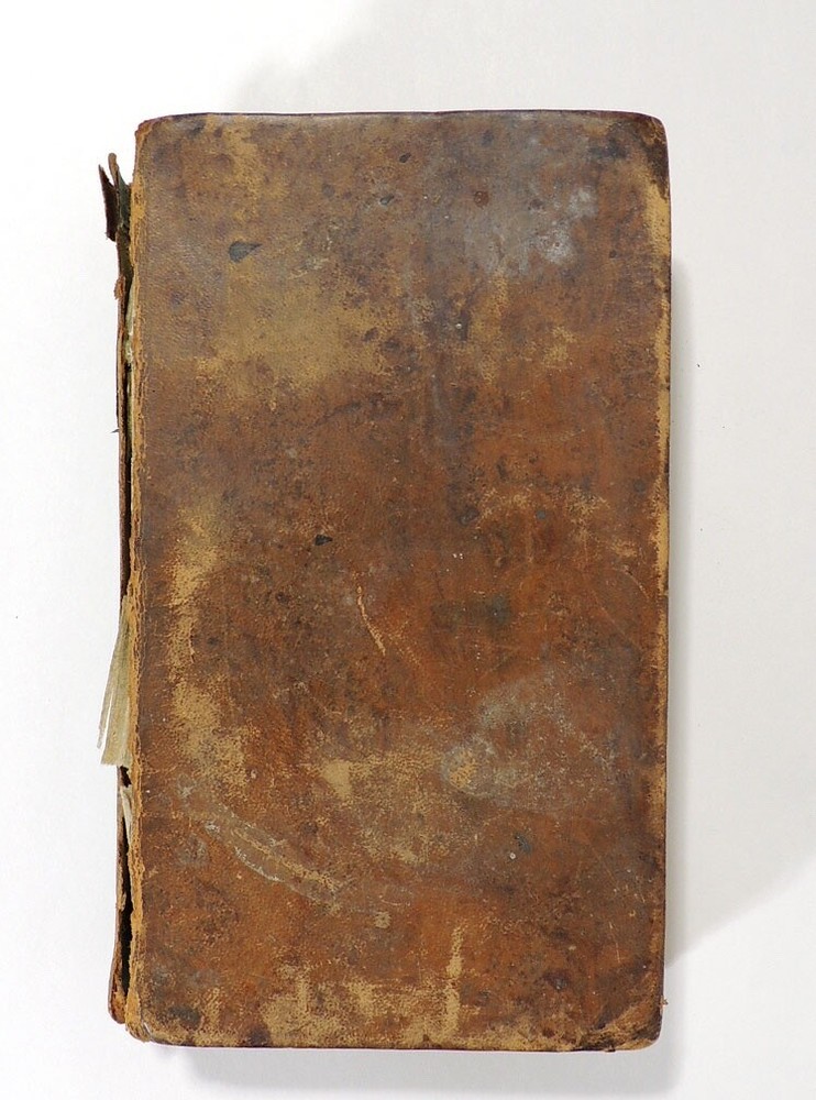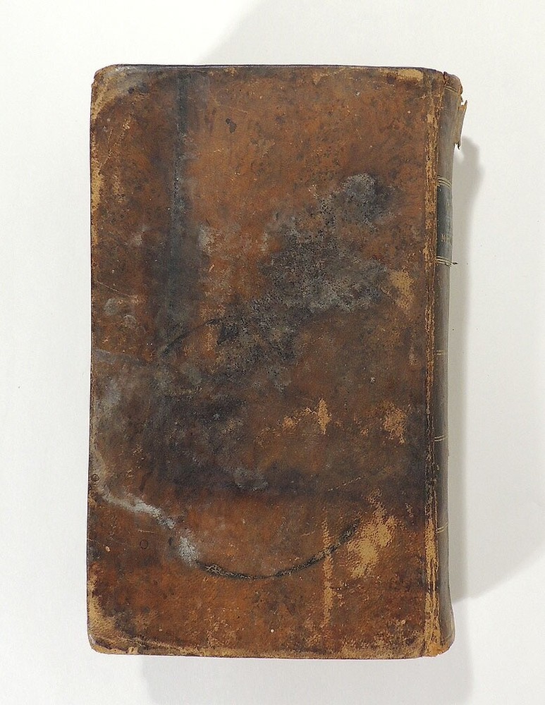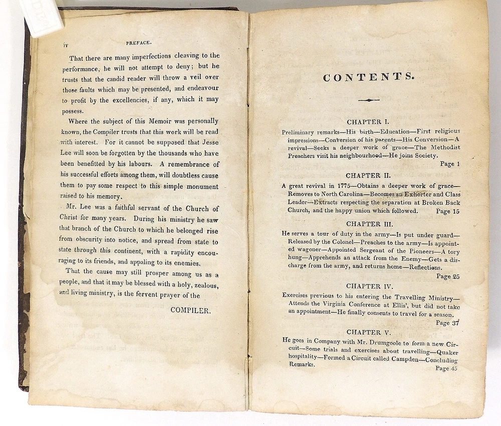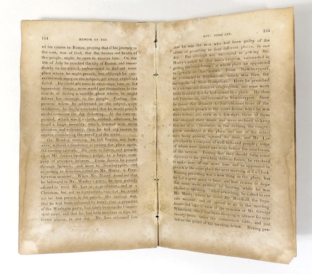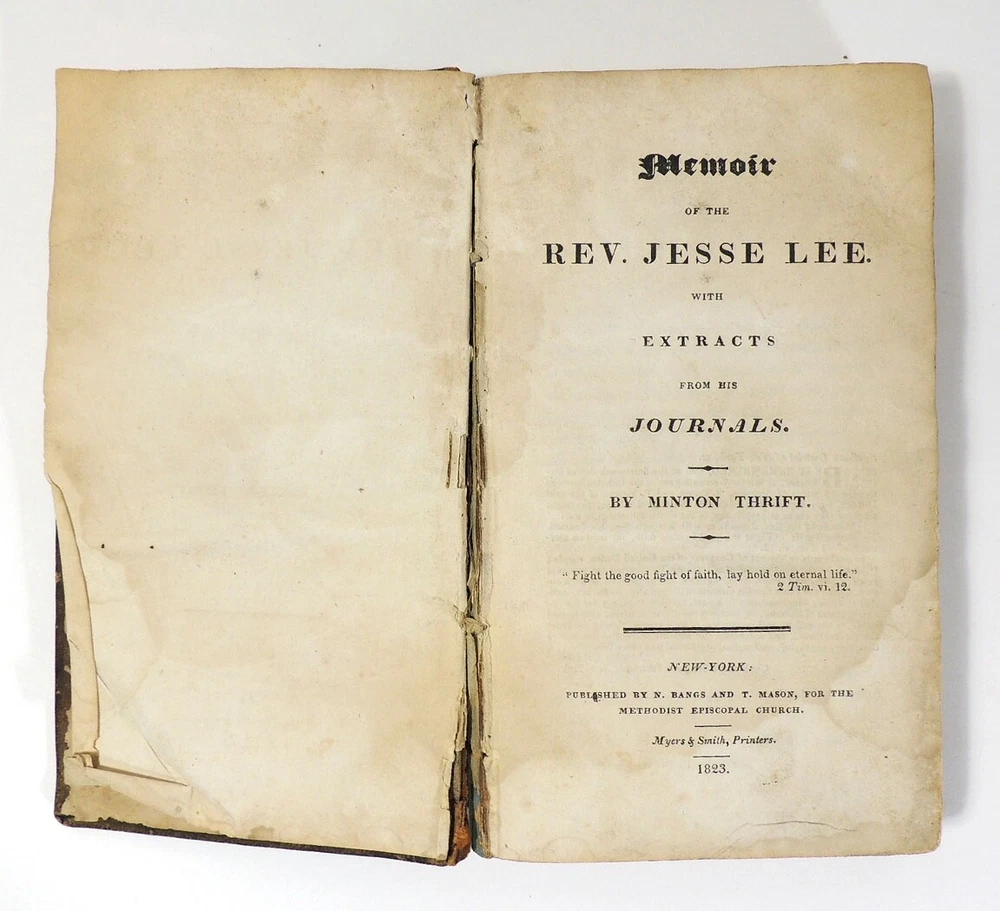 Memoir of The Rev. Jesse Lee with Extracts From His Journals by Minton Thrift, 1823 first edition. Virginia clergyman who established Methodism in New England. The leather covers of this 202 year old book are in poor condition. The spine and back cover are detached and the front is hanging on by threads. I didn’t see any writing. The pages have wrinkling and discoloration from age. It has 358 pages (missing the last 2 pages).