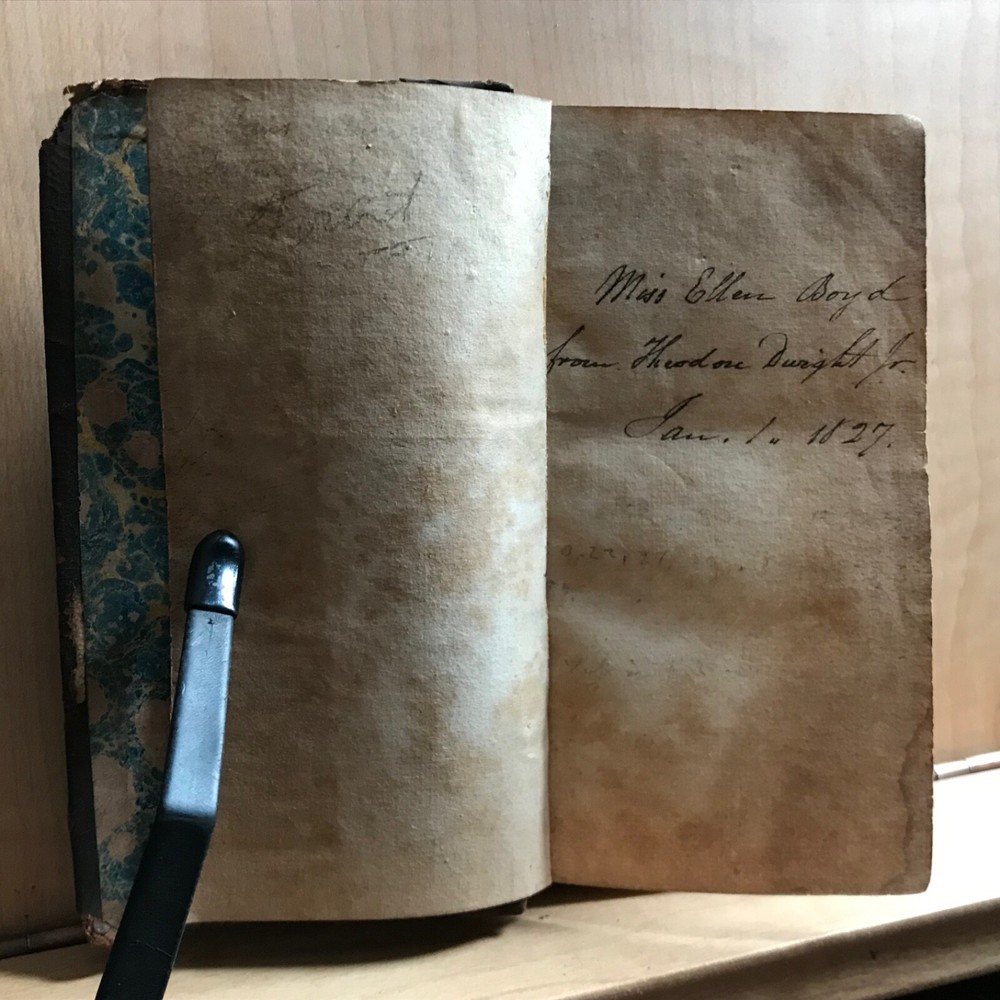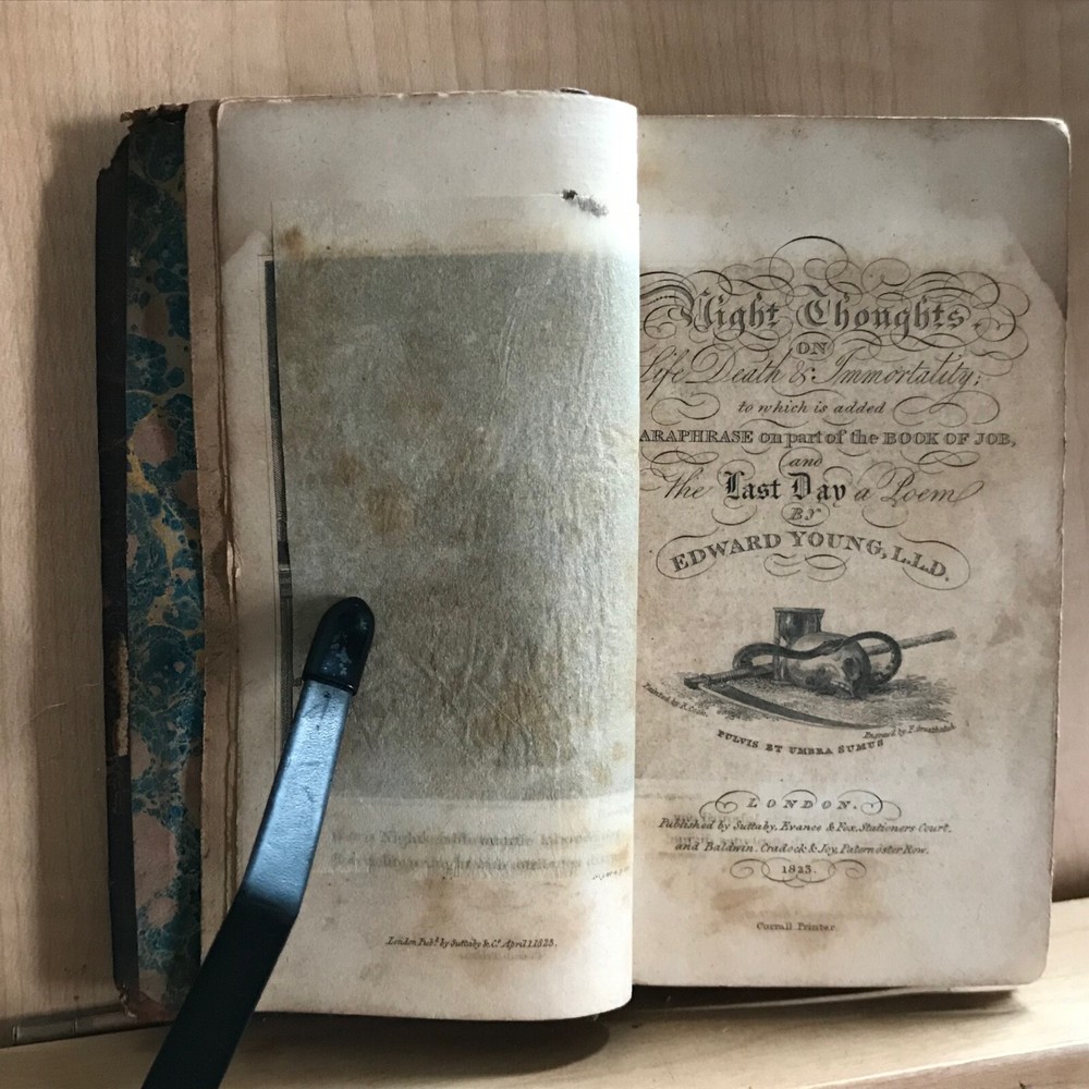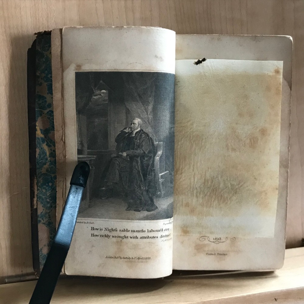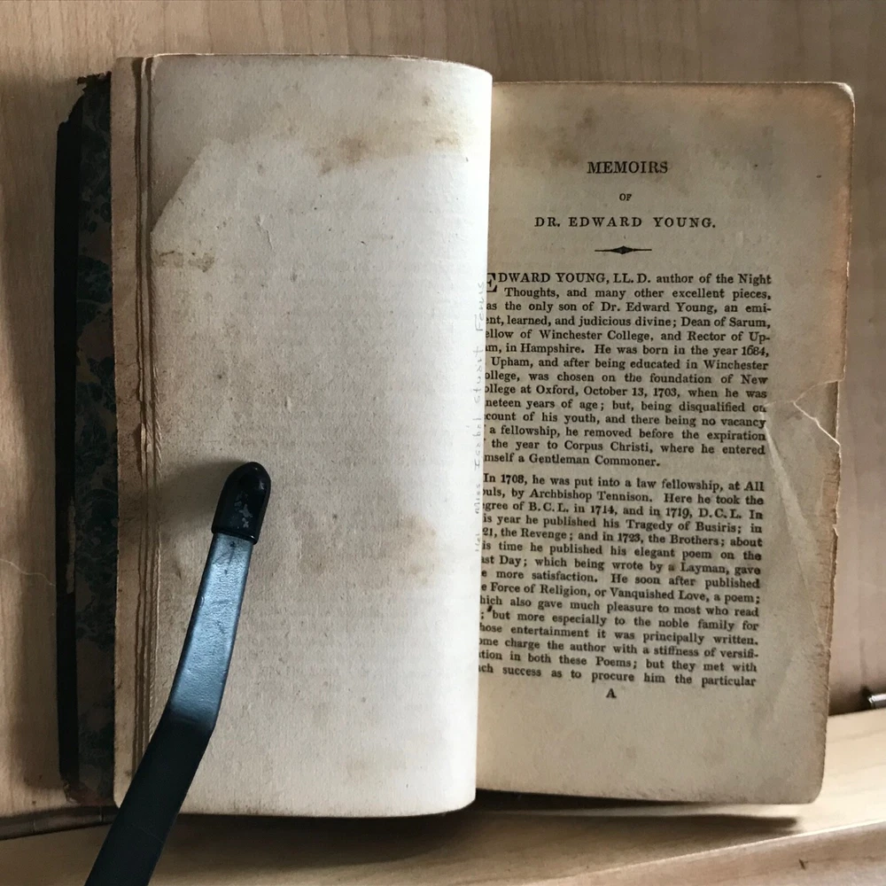 Night Thoughts on Life, Death and Immortality; to Which is Added Paraphrase on part of the Book of Job and the Last Day Poem, Edward Young, LL.D, Published by Suttaby, Evance & Fox, London, 1823, 300 pp, plus index, original leather, 5.5 x 3.25”, 32mo. In fair condition. Moderate wear to extremities. Leather desiccated, flaking and dry. Hinges quite rubbed. Spine desiccated as well with flaking and rubbing. Gilt finishing remains, but is quite rubbed. Gutters have been repaired with non-archival fabric tape. Marbled end papers soiled. “Miss Ellen Boyd from Theodore Dwight Jan. 1st 1827” on front flyleaf. His fifth daughter, Augusta Moore Dwight (b. 1840) signed it October 29th, 1858 on the second flyleaf. Interior toned and somewhat soiled. Scattered foxing throughout. Tissue guard to frontispiece is toned and soiled. Binding intact. Please see photos. Written in blank verse, Young’s poem describes the musings on death over a series of nine “nights” in which he ponders the loss of his wife and friends, and laments human frailties. Night-Thoughts had a very high reputation for many years after its publication, but is best known for a major series of illustrations by William Blake in 1797. Our edition does not contain said Blake illustrations. Owned by Theodore Dwight (1796-1866) and given to his wife-to-be, Eleanor Boyd. Dwight was the American author of The Northern Traveler. He tragically died in a train accident while traveling to Newark, New Jersey. This was a gift to their daughter Augusta Moore Dwight (b. 1840). COLL1823ABFZ-FORN-TUB0007 HK02/24