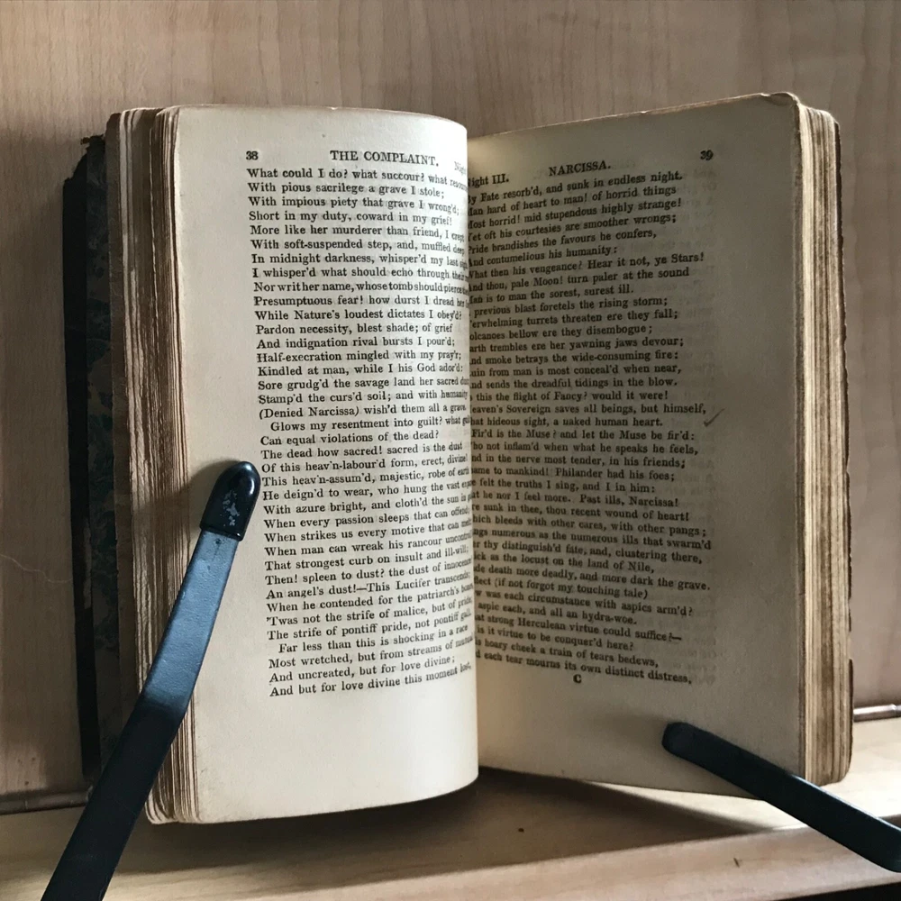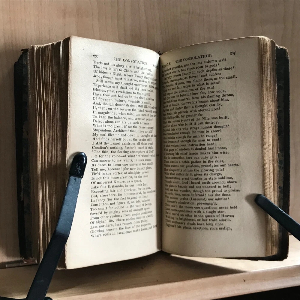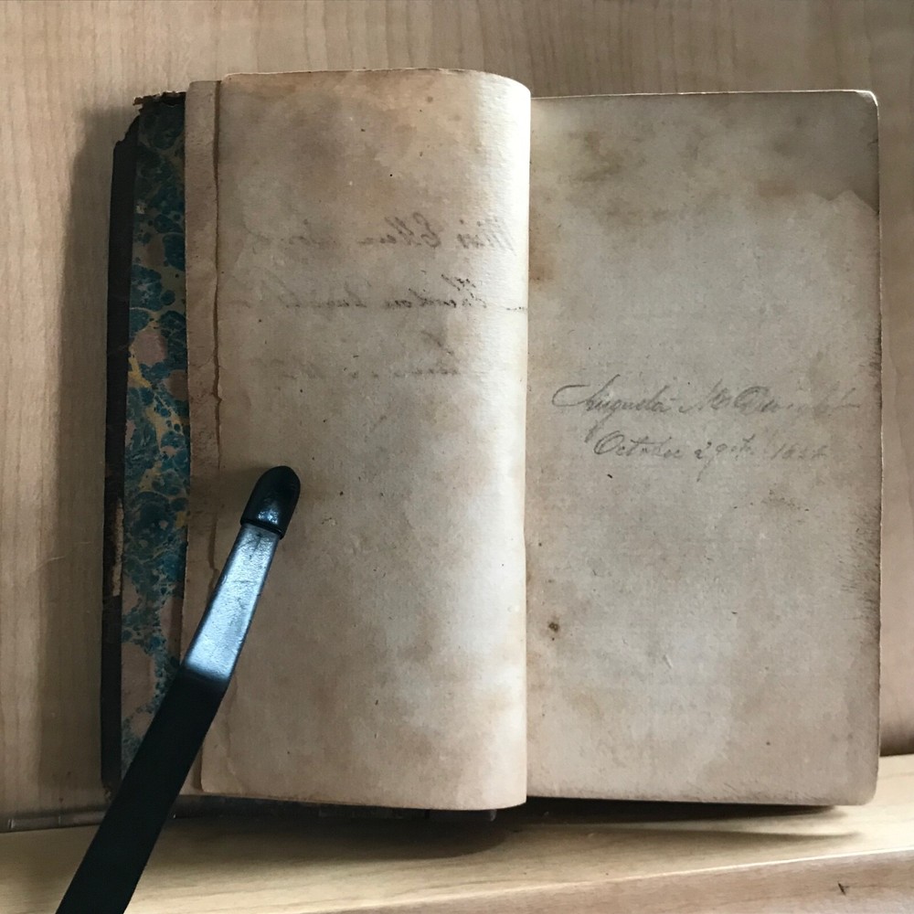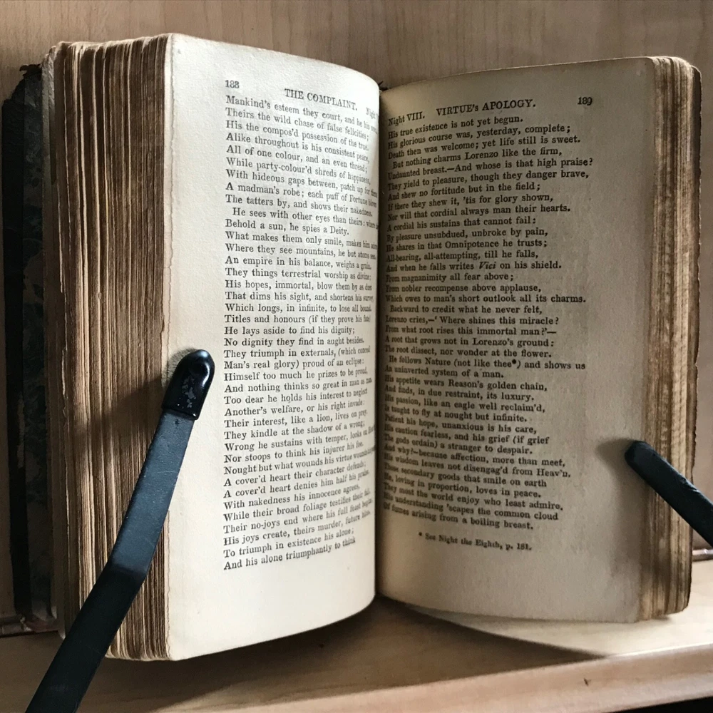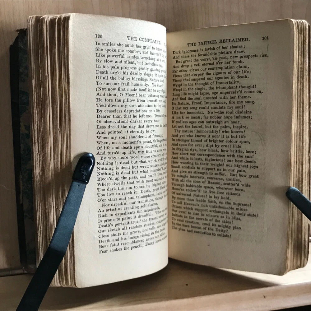 Night Thoughts on Life, Death and Immortality; to Which is Added Paraphrase on part of the Book of Job and the Last Day Poem, Edward Young, LL.D, Published by Suttaby, Evance & Fox, London, 1823, 300 pp, plus index, original leather, 5.5 x 3.25”, 32mo. In fair condition. Moderate wear to extremities. Leather desiccated, flaking and dry. Hinges quite rubbed. Spine desiccated as well with flaking and rubbing. Gilt finishing remains, but is quite rubbed. Gutters have been repaired with non-archival fabric tape. Marbled end papers soiled. “Miss Ellen Boyd from Theodore Dwight Jan. 1st 1827” on front flyleaf. His fifth daughter, Augusta Moore Dwight (b. 1840) signed it October 29th, 1858 on the second flyleaf. Interior toned and somewhat soiled. Scattered foxing throughout. Tissue guard to frontispiece is toned and soiled. Binding intact. Please see photos. Written in blank verse, Young’s poem describes the musings on death over a series of nine “nights” in which he ponders the loss of his wife and friends, and laments human frailties. Night-Thoughts had a very high reputation for many years after its publication, but is best known for a major series of illustrations by William Blake in 1797. Our edition does not contain said Blake illustrations. Owned by Theodore Dwight (1796-1866) and given to his wife-to-be, Eleanor Boyd. Dwight was the American author of The Northern Traveler. He tragically died in a train accident while traveling to Newark, New Jersey. This was a gift to their daughter Augusta Moore Dwight (b. 1840). COLL1823ABFZ-FORN-TUB0007 HK02/24