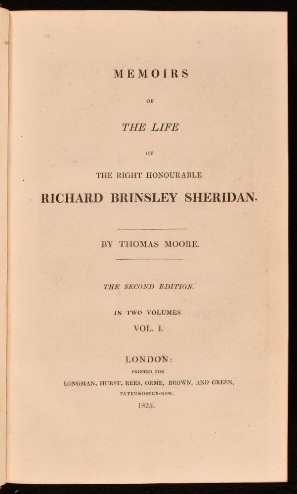Click here to see our other books! Memoirs of the Life of the Right Honourable Richard Brinsley Sheridan Thomas Moore 1825 Longman, Hurst, Rees, Orme, Brown, and Green : London 8.5" by 5.5" viii, 543; iv, 492pp. SUMMARY A complete two volume set of the second edition of the memoirs of Anglo-Irish writer, Richard Brinsley Sheridan. Folding Plates,Illustrated,Leather Binding Overall Condition: Very Good This book weighs 1.5 KG when packed UK Postage: £ 3.99 US Postage: £ 23.99 EU Postage : £ 18.99 European Postage: £ 19.99 Asia Postage: £ 31.99 Worldwide Postage: £ 32.99 DESCRIPTION Complete in two volumes. Second edition. Volume one is illustrated with a portrait frontispiece and a fold-out facsimile letter .Collated complete. A biographical account of Richard Brinsley Sheridan, an Anglo-Irish writer, playwright, and Whig politician who sat in the House of Commons from 1780 until 1812. Written by Thomas Moore, an Irish writer, poet, and lyricist remembered for his Irish Melodies. CONDITION Bound in half calf with patterned boards. Externally, smart with light rubbing to the extremities. Light loss to the head of the spine of volume two. Joints cracked but generally firm. Rear board detached to volume one. Internally, firmly bound. Pages are very bright and clean with the odd spot. Overall Condition: Very Good GLOSSARY OF TERMS Overall Condition (Dustwrapper condition rating is shown after that for the book itself, where a dustwrapper is present) Fine - Very well preserved copy showing very little wear Very Good Indeed - Only one or two minor faults, really a very attractive copy Very Good - Quite a wide term meaning no major faults but probably several smaller ones often expected given the age of the book, but still a respectable copy Good - Meaning not very good. Some more serious faults as will be described in the condition report under 'condition' Good Only - Meaning one or more faults that could really do with repair Fair - As with good only above but with other faults leaving a compromised copy even after repair Poor - Really bad and possibly seriously incomplete. We only sell books in this condition where their rarity or value makes them attractive none the less. Major defects will be described. GUARANTEE We offer a full money back guarantee on our descriptions. Please ask for details and conditions. We prefer PAYPAL. If you pay via PAYPAL we will post the item off the same or the next working day with the postage you have selected. Please note we cannot accept USD cheques