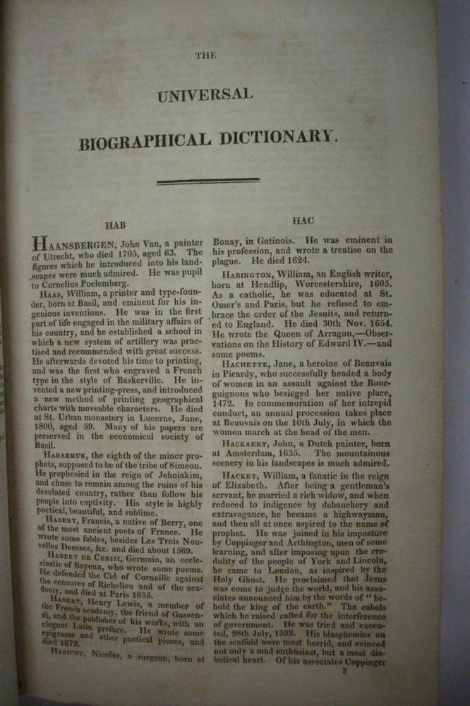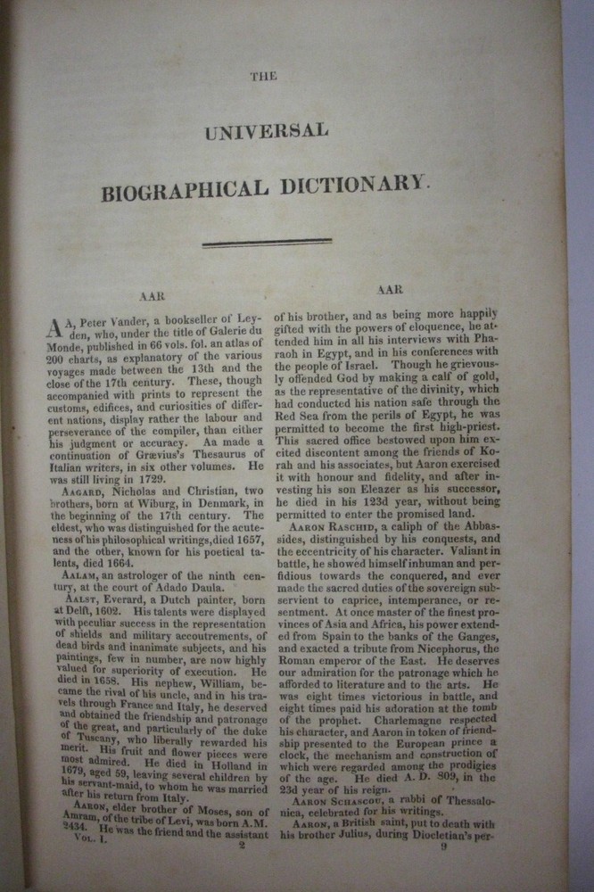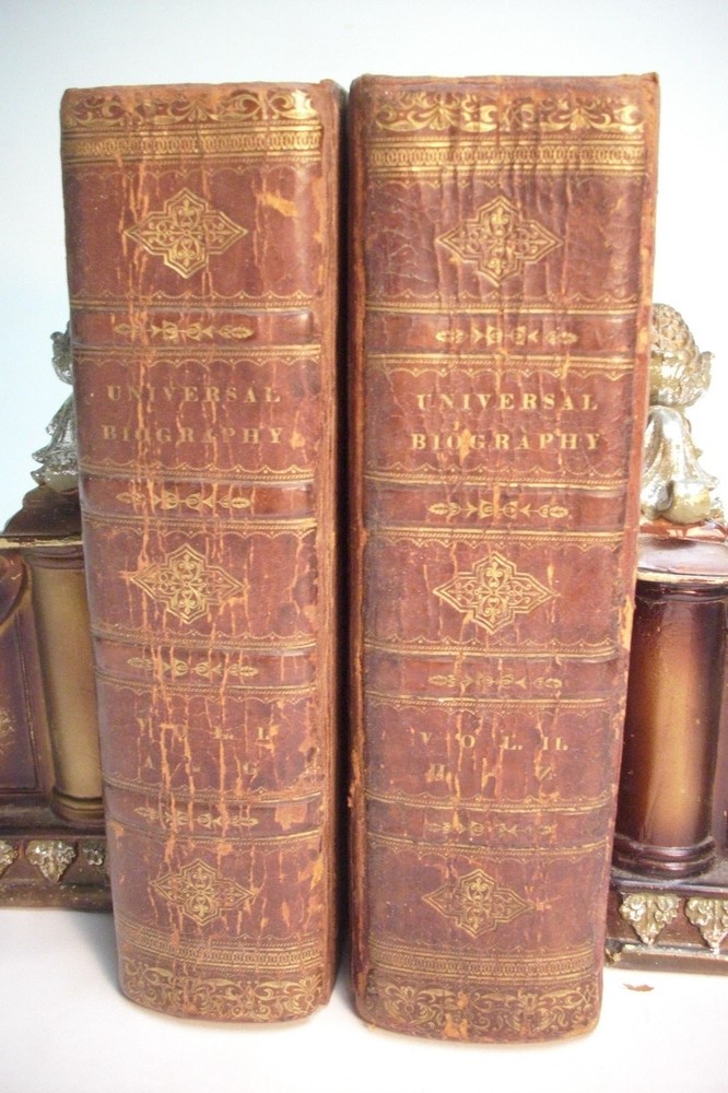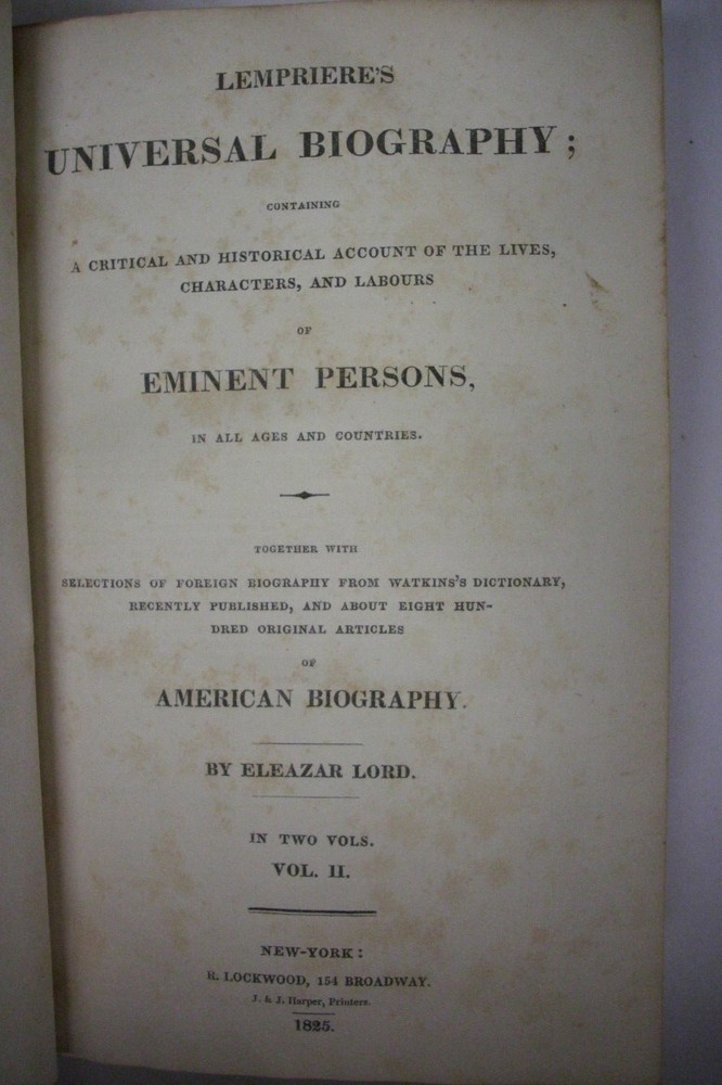 You are bidding on a rare set of antique hardcover books titled Lampriere's Universal Biography; Containing a Critical and Historical Account of the Lives, Characters, and Labours of Eminent Persons in All Ages and Countries. Together with Selections of Foreign Biography from Watkin's Dictionary, Recently Published, and above Eight Hundred Original Articles of American Biography. By Eleazor Lord. Published in New York by R. Lockwood, J. & J. Harper, Printers, 1825. This is the very scarce and collectible First Edition. The set is complete in two volumes and you are bidding on both volumes. It is a matching set. Eleazar Lord was an American author, educator, deacon of the First Protestant Dutch Church and first president of the Erie Railroad, also known from his literal interpretations of the creation-evolution controversy.Lord was engage in banking; founded the Manhattan insurance company, and served as its president 1821-34; was the first president of the Erie Railroad company; was a prominent friend of the New York university, and assisted in founding theological seminaries at East Windsor, Connecticut, and Auburn, New York.His principal works are "Principles of Currency"; "Geological Cosmogony": and an edition of "Lempriere's Biographical Dictionary," with numerous additions. This antique recased full-leather set with raised bands and stamped gilt lettering and ornament to spines has gilt borders to the front and rear covers. The books shows external wear, with cracking and minor chipping to the spines, and some minor loss to edges and corners. The bindings are sound, with reinforced hinges. The edges of the text blocks are speckled and have yellow spotting. The foxed endpapers and blank preliminaries have antique bookplates of William Prescott and Franklin Dexter attached. The pages exhibit light foxing. It is possible that the William Prescott bookplate is that of the famous American historian and Hispanist, William H. Prescott. Would make a super addition to a collection. Great gift idea! (Inventory: Box 68-C) Track Page Views With Auctiva's FREE Counter