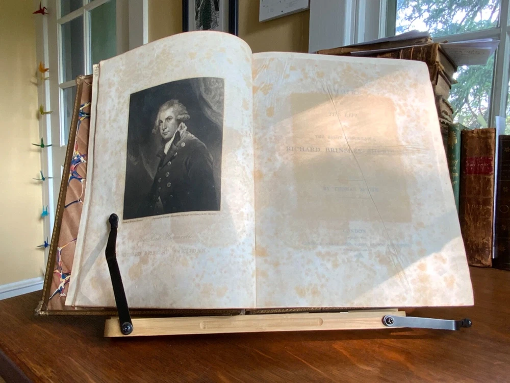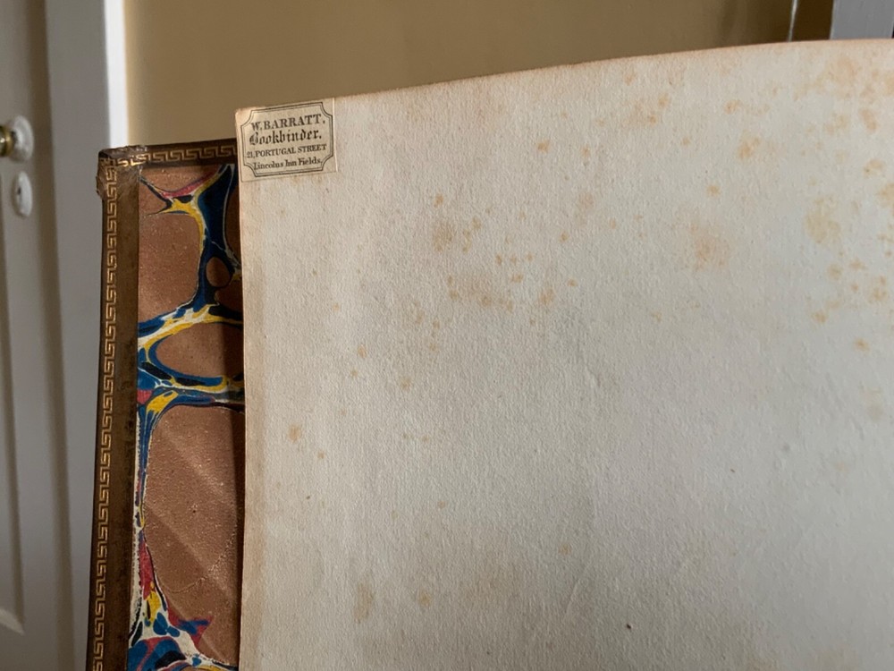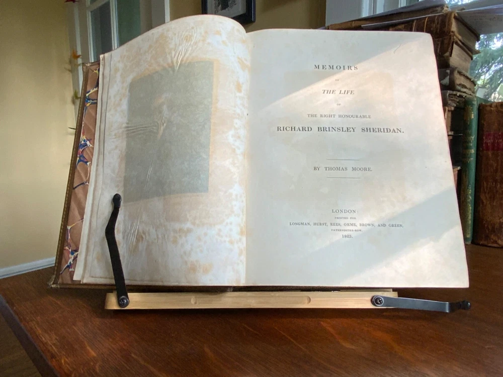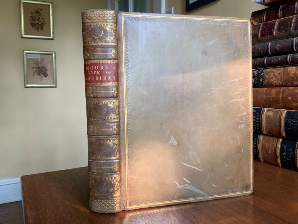 Memoirs of the Life of The Right Honourable Richard Brinkley Sheridan. By Thomas Moore, Longman, Hurst, Rees, Orme, Brown, and Green, London, 1825, frontispiece of Sheridan, 719 pp, full light brown leather, 11 x 9”, 4to. In good condition. Light wear to extremities with minor scuffing along edges and corners. Boards exhibit scuffing with marks and rubbing. Corners slightly crushed. Joints slightly tender with light creasing and minor cracking at the bottom edge of rear board. Gilt compartments have minor rubbing to decorative pomegranates. Presents handsomely. All edges marbled. Bookplate of Charles William Packe on front pastedown. Binder’s ticket of W. Barratt, Bookbinder Lincolns Inn Fields on rear of fly. Foxing to frontis and tissue guard. Offsetting from plate to title. Internally good with light toning and minor instances of foxing. Free of known marginalia. Binding tight and intact. Please see photos. Finely bound signed binding by W. Barratt. Previously owned by Charles Packe (1792-1867) a British Conservative Party politician. He inherited Prestwold Hall upon his father’s death in 1837, and later acquired Glen Hall and an 18-acre estate in southern Leicestershire. On his death, Packe owned nearly 2,500 acres in Leicestershire and had amassed a gross personal wealth of 35,000 pounds. First edition of Thomas Moore’s biography of the playwright and politician Richard Brinsley Sheridan (1751-1816). COLL1825CKLB-623