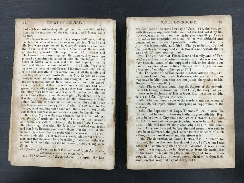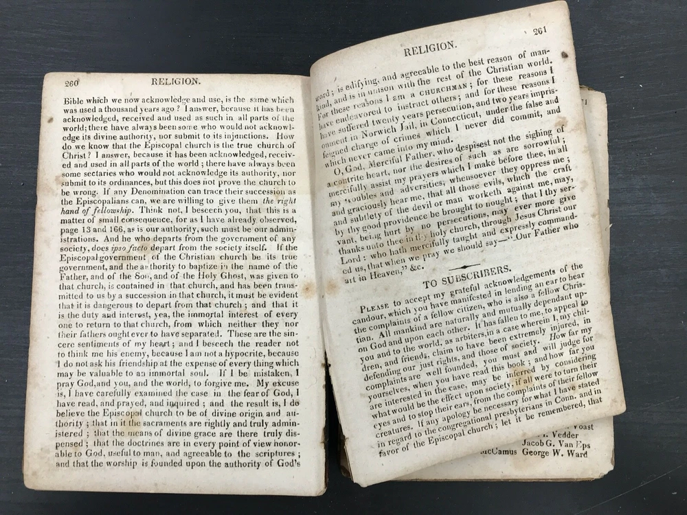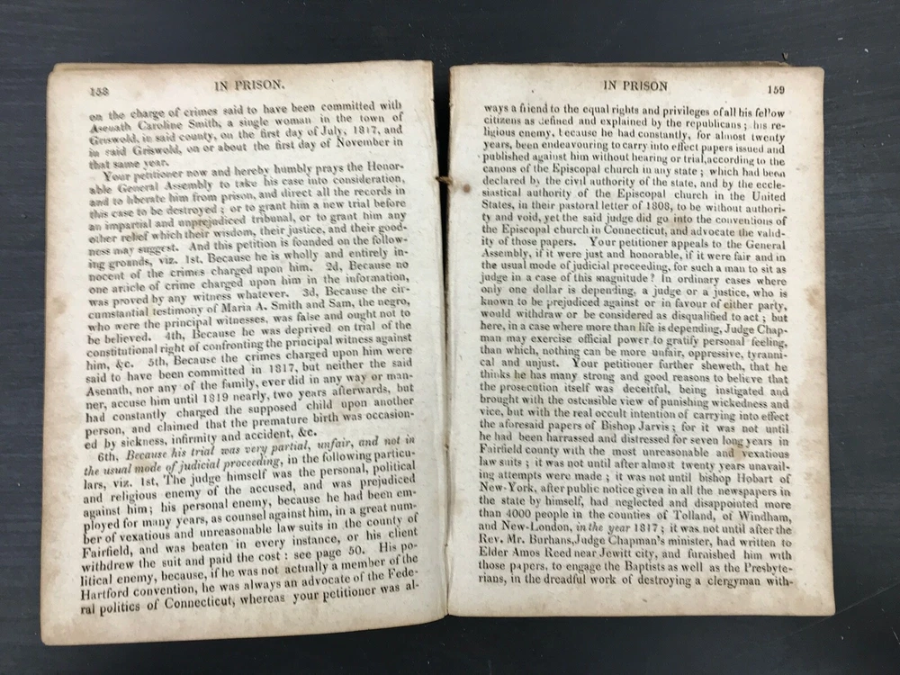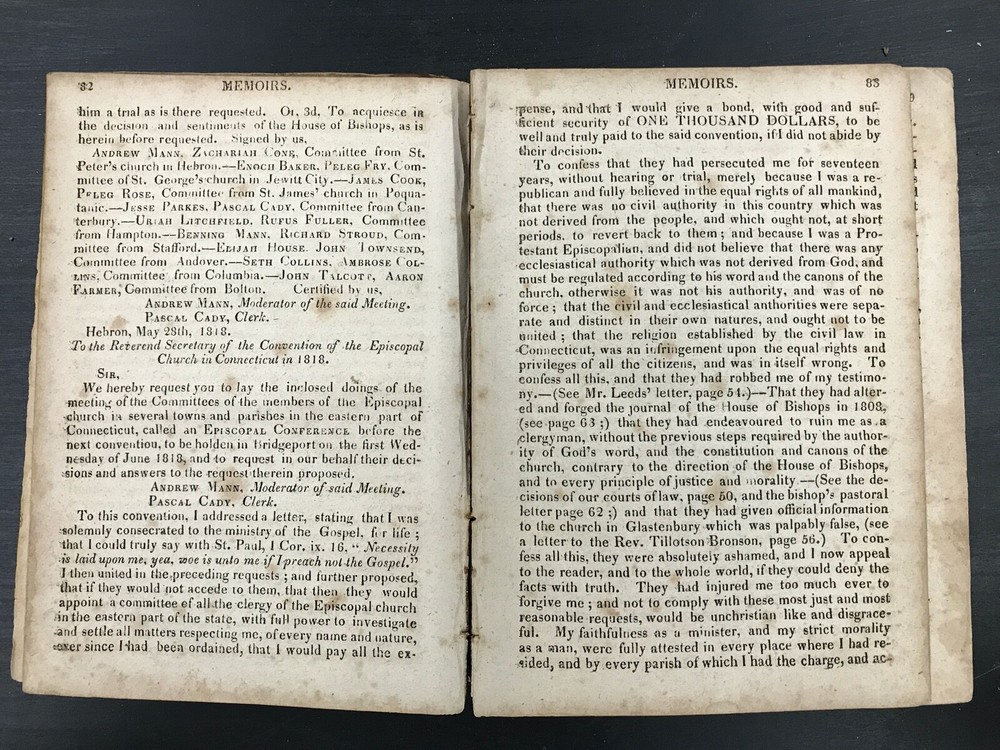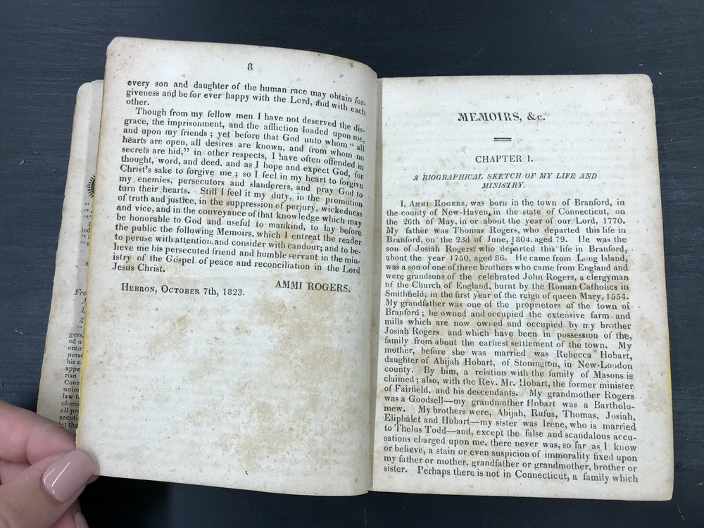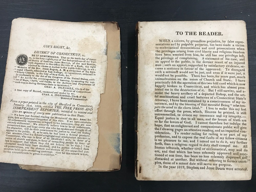 Memoirs of the Rev. Ammi Rogers, A.M. A Clergyman of the Episcopal Church, Educated at Yale College in Connecticut, Ordained in Trinity Church in the City of New York,—Persecuted in the State of Connecticut, on Account of Religion and Politics, for Almost Twenty Years; And Finally, Falsely Accused and imprisoned in Norwich Jail, for Two Years on the Charge of Crimes Said to Have Been Committed in the Town of Griswold, in the County of New London, When He Was Not Within About One Hundred Miles of the Place, and Of Which He Was Absolutely as Innocent as the Judge Who Pronounced the Sentence, or As Any Other Person in the World. Composed, Compiled, and Written by the Said Ammi Rogers. Second Edition. Printed in Schenectady, NY by G. Ritchie, Jr. 1826, 272 pp, 6.5 x 4.5", 1/2 leather binding. Sold as-is with font board detached. Significant rubbing and chipping to edges of boards and spine. Spine surface perished. Text block in 5 parts, but complete. Ex-library with bookplate from the Presbyterian Historical Society Library. Title page disbound. Page edges worn; page 271 (subscriber's list) torn without loss. General age-related toning and some staining to pages, but text is clean and legible. Please see photographs and ask any questions prior to purchasing. A scarce volume, comprising the autobiography and refutation of Rev. Ammi Rogers (1770-1852). Rogers was an Episcopal Minister who was, as he tells it, met with years of persecution at the hands of his fellow clergymen over his unpopular religious and political views (in 1801, Rogers had publicly called for the complete separation of church and state). In 1820, this retaliatory behavior culminated in Rogers being accused of impregnating an unwed teenage girl, Asenath C. Smith, then terminating the pregnancy. The ensuing trial and guilty verdic paved the way for the first anti-abortion law in the United States. In Roger's retelling of the events, his conviction was entirely unjust, as supported by Asenath Smith's recanting of her testimony after his release from prison. Vindicated in the eyes of the public, he penned several editions of this tell-all memoir. “It was the titillating trial and salacious scandal of 1820s Connecticut that has ramifications that resonate today. A love affair between an older magnetic preacher and a young woman that led to pregnancy, botched attempts to end it and then a stillbirth – all amid a broken promise to marry. The state wanted to throw the book at Ammi Rogers, a controversial reverend, but there were no laws banning abortion in 1820. Rogers, who spent the rest of his life proclaiming his innocence, was instead convicted of sexual assault and sentenced to two years in prison. He impregnated 21-year-old Asenath Smith, the granddaughter of one of his congregants. When she fell pregnant, he first gave her a medicine to end the baby's life but when that did not work, used a 'tool' to end the pregnancy. Smith's family ended up calling a doctor because she was in extreme pain. She delivered a still born not long afterwards. The furor over the court case pushed Connecticut to pass the nation's first abortion law the next year, in 1821. Other states followed suit and by the end of the 19th Century, 49 states had some type of law regulating abortion, with Kentucky passing legislation in 1910. A through line can be drawn from that court case and subsequent legislation in 1821 to the landmark 1973 Supreme Court decision Roe v. Wade to the signing Wednesday of one of the nation's most restrictive abortion laws in Alabama. While the two laws are separated by nearly 200 years, their aim is the same: punish those that provide women with abortions. In the 1820s, a women, like Asenath Smith, Rogers' lover, would have been given some sort of medicine to get rid of the pregnancy. Now, those who provide abortions could be sentenced anywhere from 10 years up to 99 years when the Alabama law takes effect.” ORN-ABE-MSB-0522-Shelf-587-am301