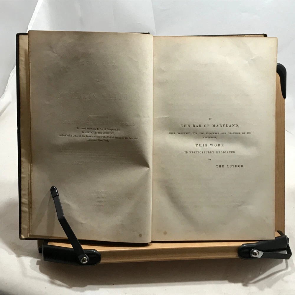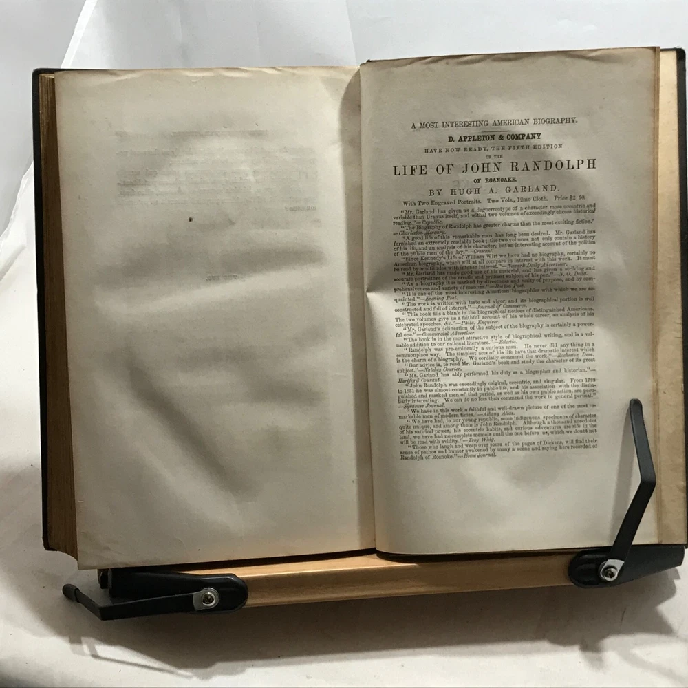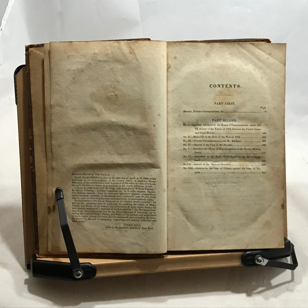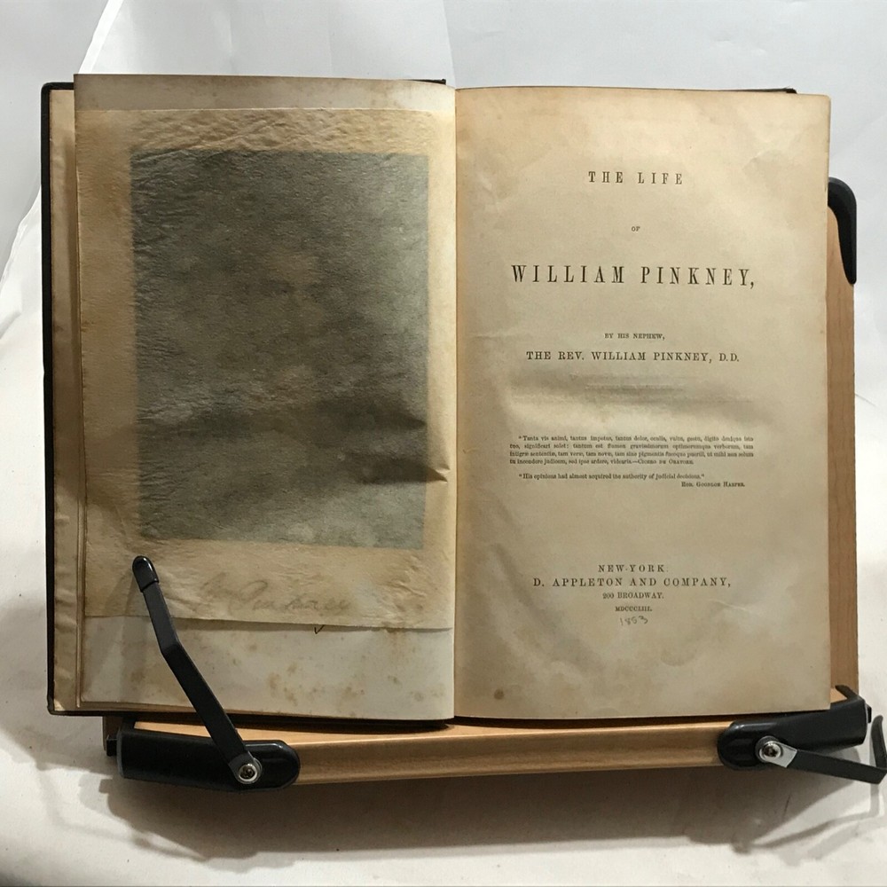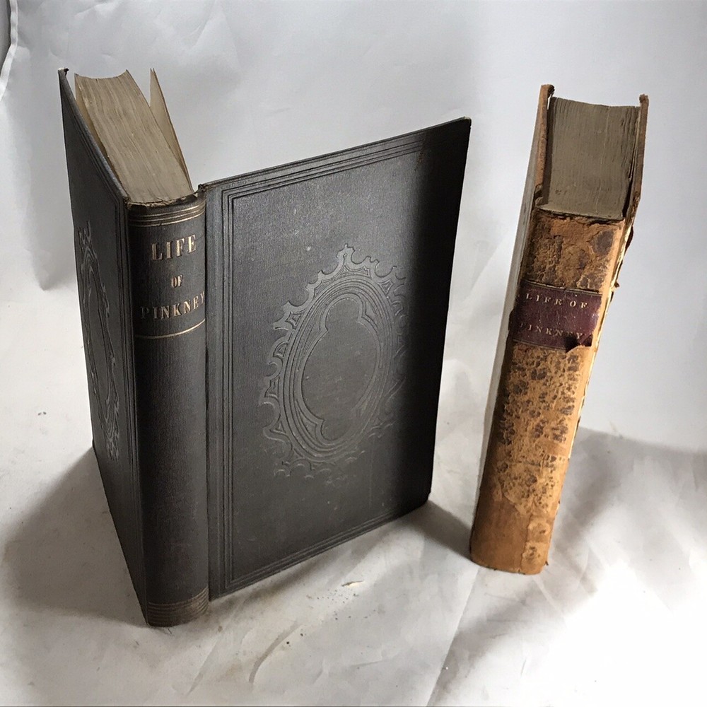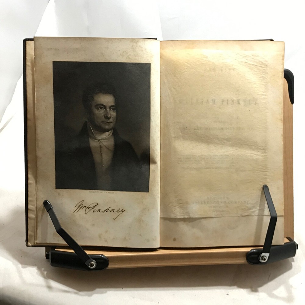 TWO BOOKS FOR ONE PRICE! Some Account of the Life, Writings and Speeches of William Pinkney, Henry Wheaton, published by E. Bliss & E. White, 1826, 616 pages, full leather, 8vo & The Life of WIlliam Pinkney by his Nephew The Rev. William Pinkney, D.D., published by D. Appleton and Company, New York, 1853, 416 pages, plus booklist, cloth, 8vo. 1826 book- broken and detached front board. Bookplate on pastedown. Boards bumped and scuffed from typical shelf wear. Previous owner’s name on front end page. Texblock has some dogeared pages, tanned throughout. Illustrated frontispiece. Typical foxing and wear. 1853 book-embossed cloth is somewhat worn, but nothing atypical. Bumped boards. Previous owner’s name on front end page. Illustrated Frontispiece. Some foxing throughout. Minor rippling. Please see photos. William Pinkney was an American statesman and diplomat, and was appointed the seventh U.S. Attorney General by President James Madison. After practicing law in Hartford County, Maryland, he participated in Maryland’s state constitutional convention. Pinkney was an excellent orator who possessing a command of language, and was said to posses a pleasing and articulate manner in his speaking. Pinkney served in the Maryland House of Delegates and served as U.S. Congressman from the third district of Maryland. He was mayor of Annapolis from 1795-1800. In 1801 he was appointed Attorney general for the District of Pennsylvania by President Thomas Jefferson and Attorney General of Maryland from 1805 to 1806. In 1811 he joined President James Madison’s cabinet as Attorney General. FORN-Shelf-560-RAREA1826AEGA