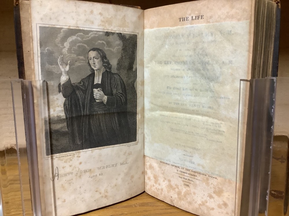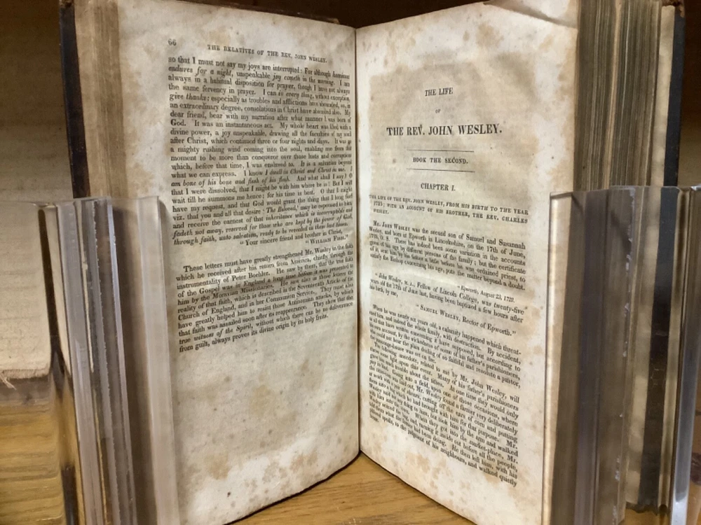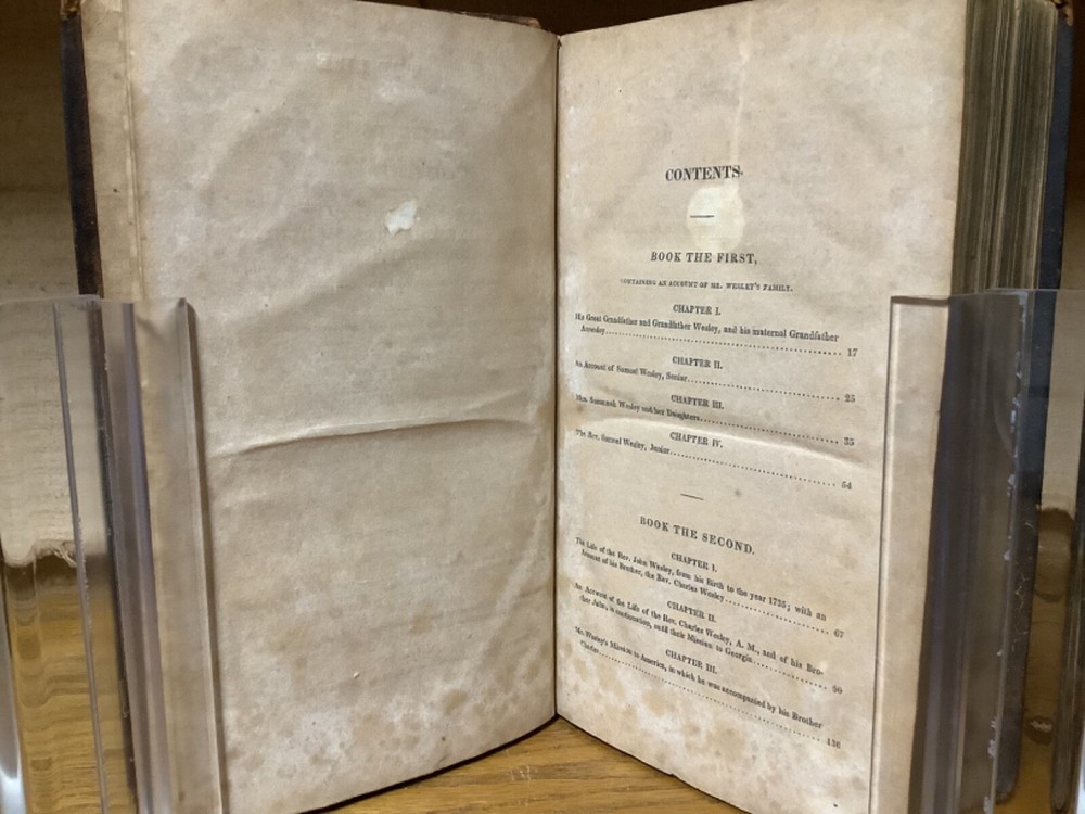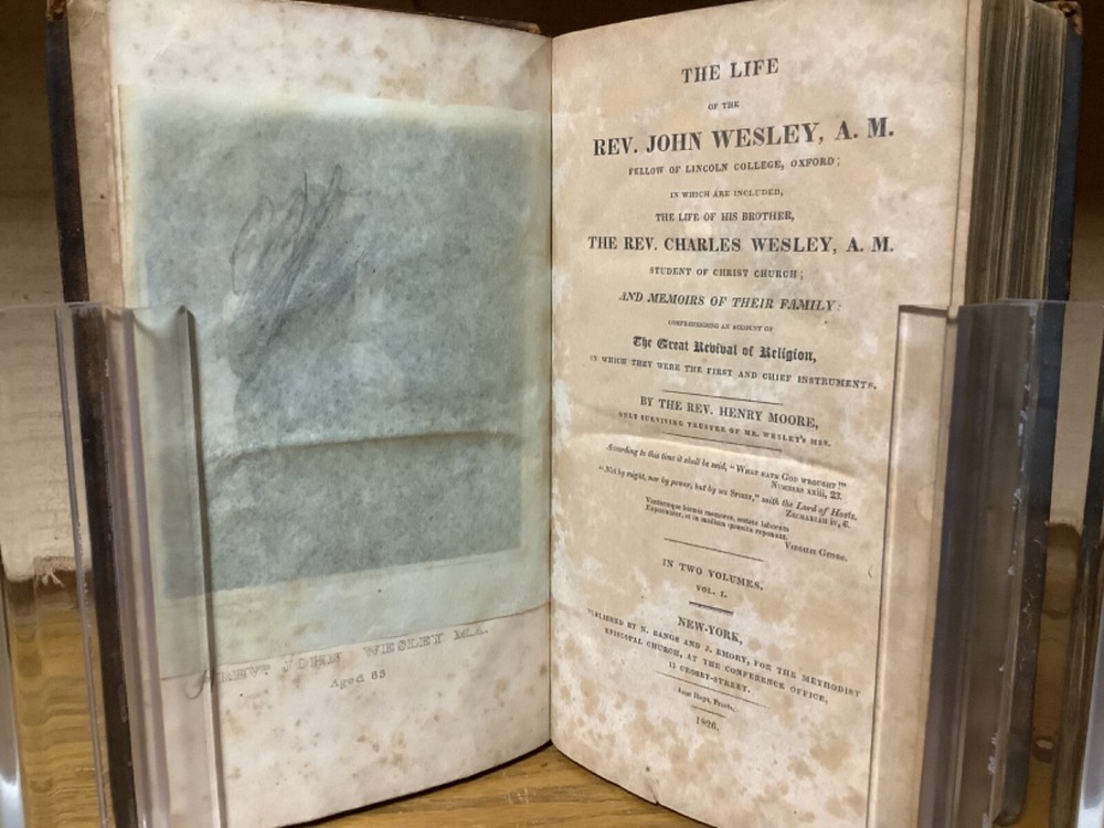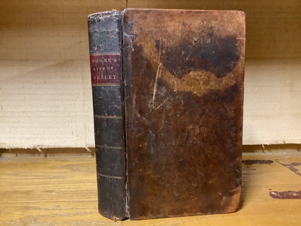 The Life of Rev. John Wesley, A.M., Fellow of Lincoln College, Oxford; in Which are Included, the Life of his Brothers, the Rev. Charles Wesley. By Rev. Henry Moore and printed in New York City for N. Bangs and J. Emory. 1826, 330 and 324 pp, 9”x 5.5”, 8vo, hardcover full leather. In good condition, with minor rubbing and wear to boards. Light chipping to spine. Hinges remain in good condition and text block remains bound well. Light markings a marginalia, including scribbles to first tissue guard. Includes frontispiece portraits of the Wesley brothers at the start of their respective parts. General age-related toning to pages, along with periodic foxing and wear. Please see photographs and ask any questions prior to purchasing. A scarce piece on the lives of the John Wesley (1703-1791), the most important figure in the creation of the Methodist denomination, along with his brother, Charles (1707-1788), another influential Methodist figure and hymn writer, with his most famous being Hark! The Herald Angels Sing . COLR1826BDEG-0224-aj0979