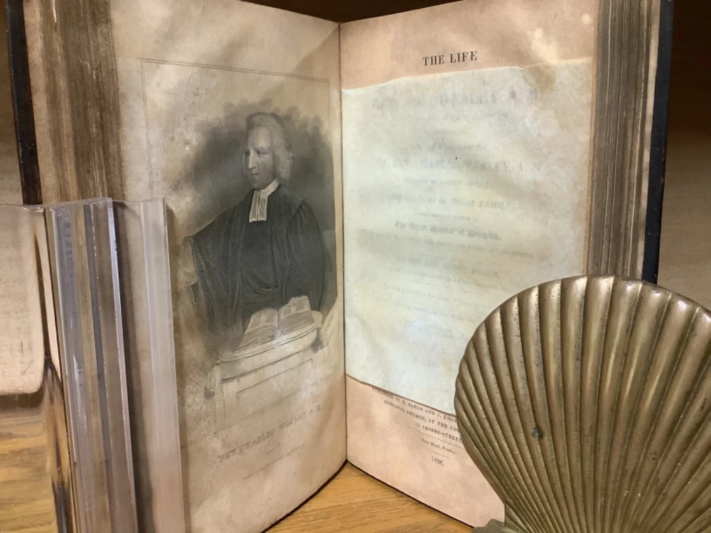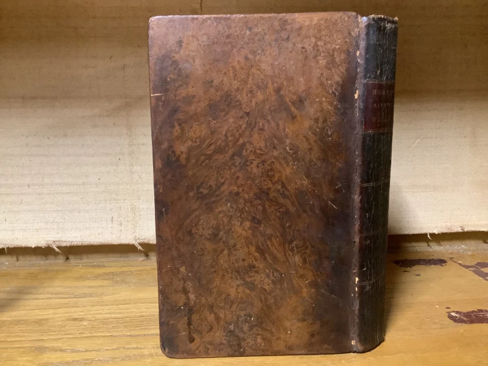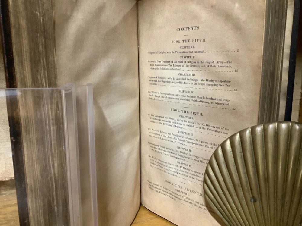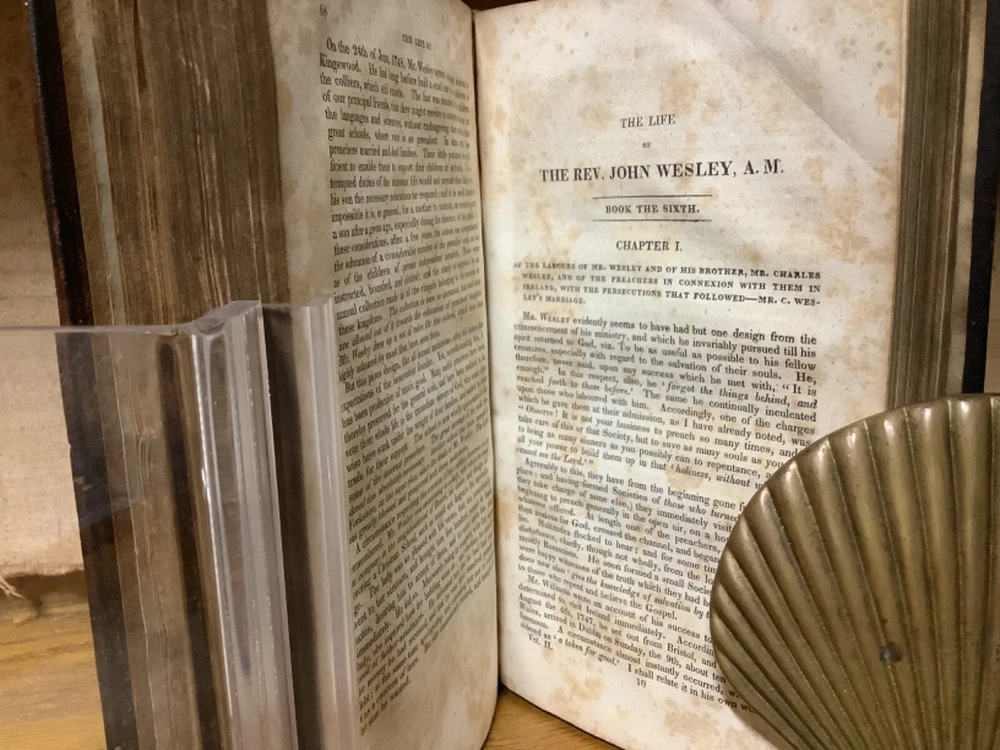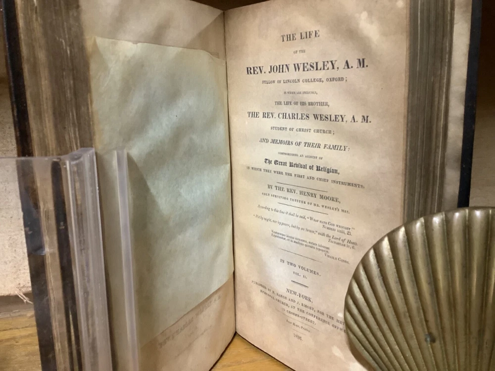 The Life of Rev. John Wesley, A.M., Fellow of Lincoln College, Oxford; in Which are Included, the Life of his Brothers, the Rev. Charles Wesley. By Rev. Henry Moore and printed in New York City for N. Bangs and J. Emory. 1826, 330 and 324 pp, 9”x 5.5”, 8vo, hardcover full leather. In good condition, with minor rubbing and wear to boards. Light chipping to spine. Hinges remain in good condition and text block remains bound well. Light markings a marginalia, including scribbles to first tissue guard. Includes frontispiece portraits of the Wesley brothers at the start of their respective parts. General age-related toning to pages, along with periodic foxing and wear. Please see photographs and ask any questions prior to purchasing. A scarce piece on the lives of the John Wesley (1703-1791), the most important figure in the creation of the Methodist denomination, along with his brother, Charles (1707-1788), another influential Methodist figure and hymn writer, with his most famous being Hark! The Herald Angels Sing . COLR1826BDEG-0224-aj0979